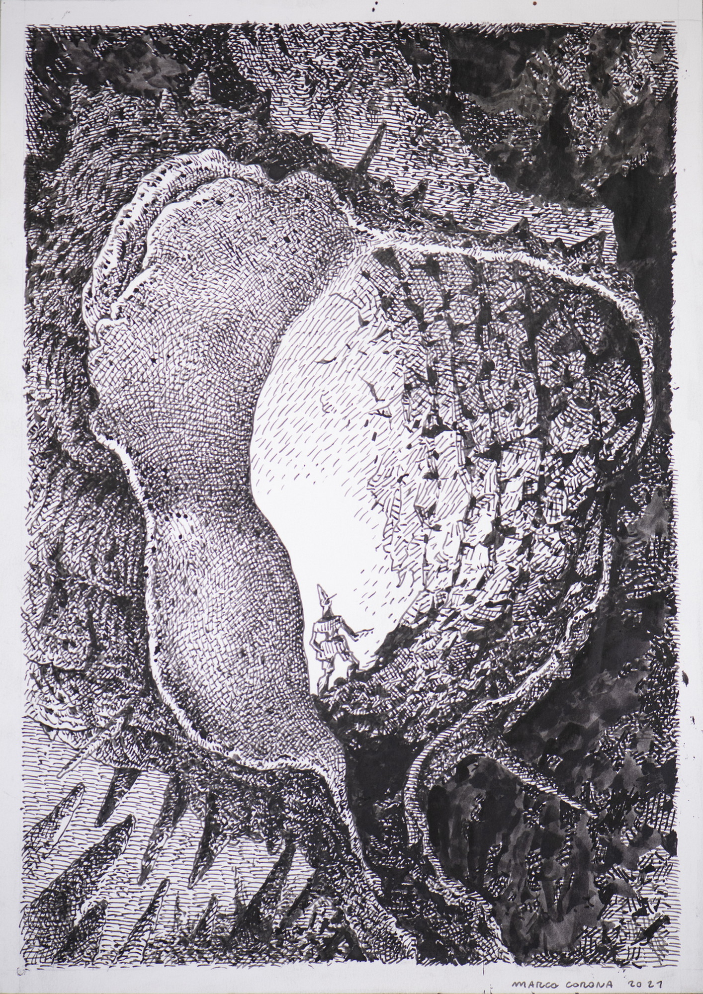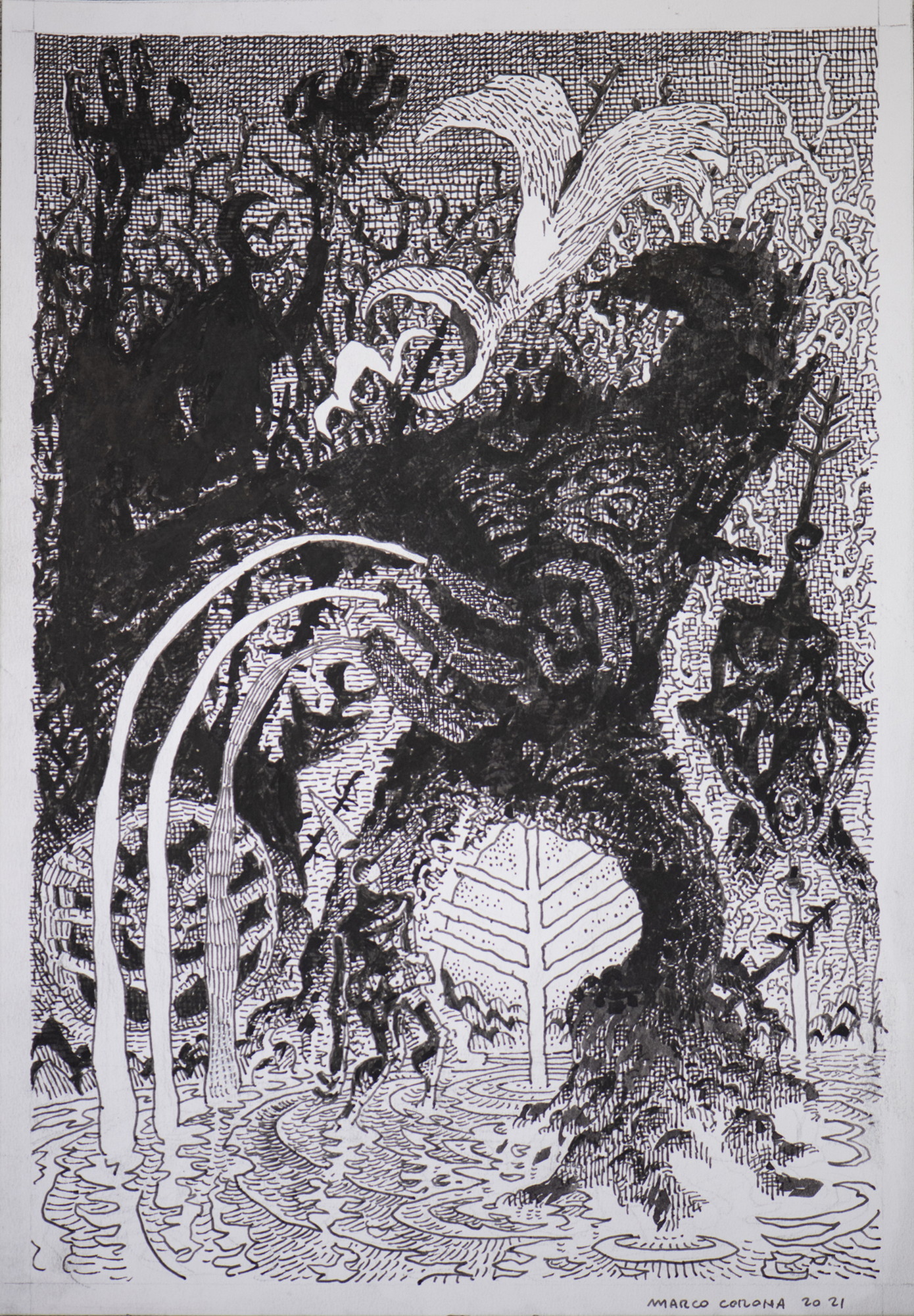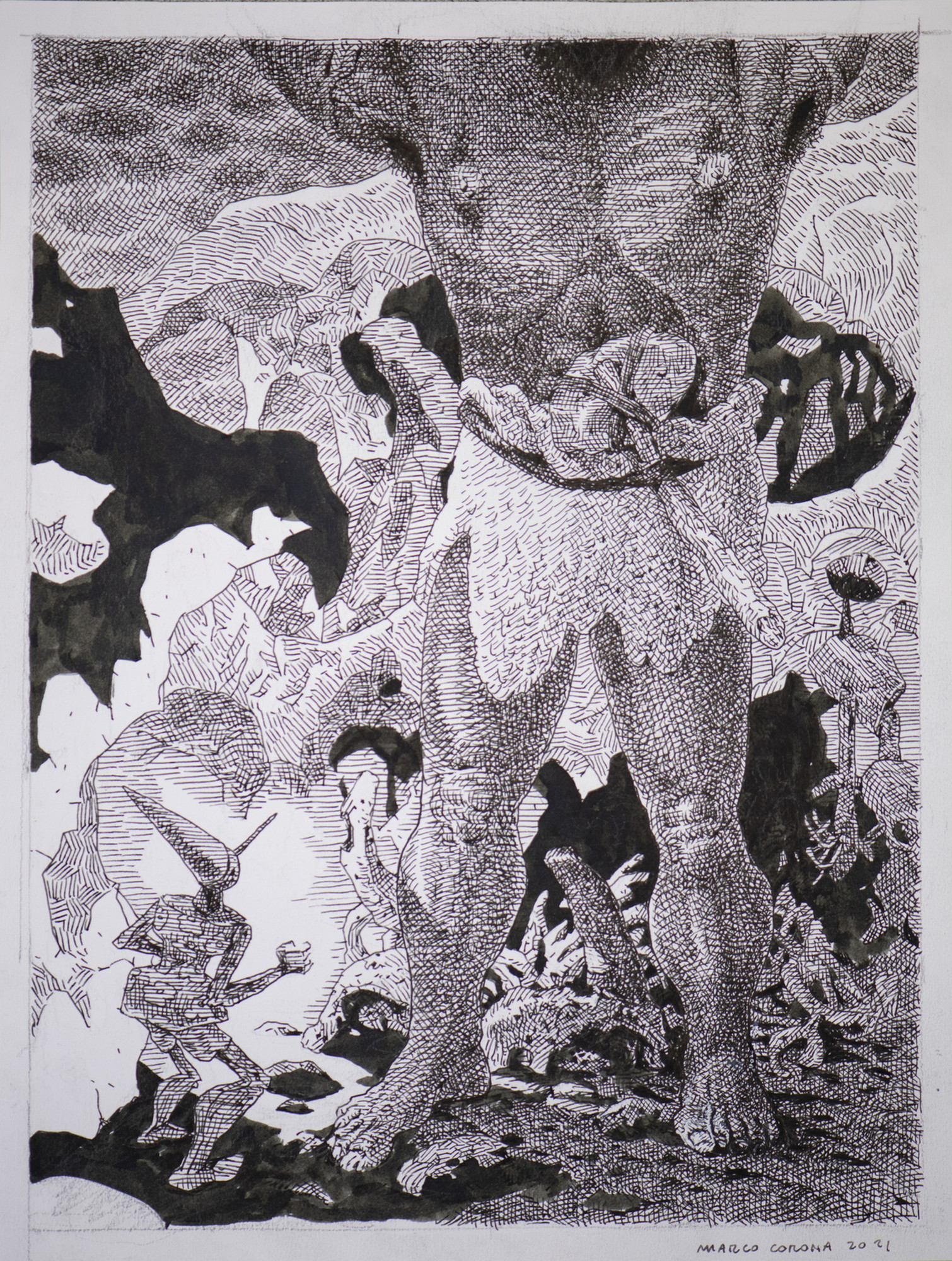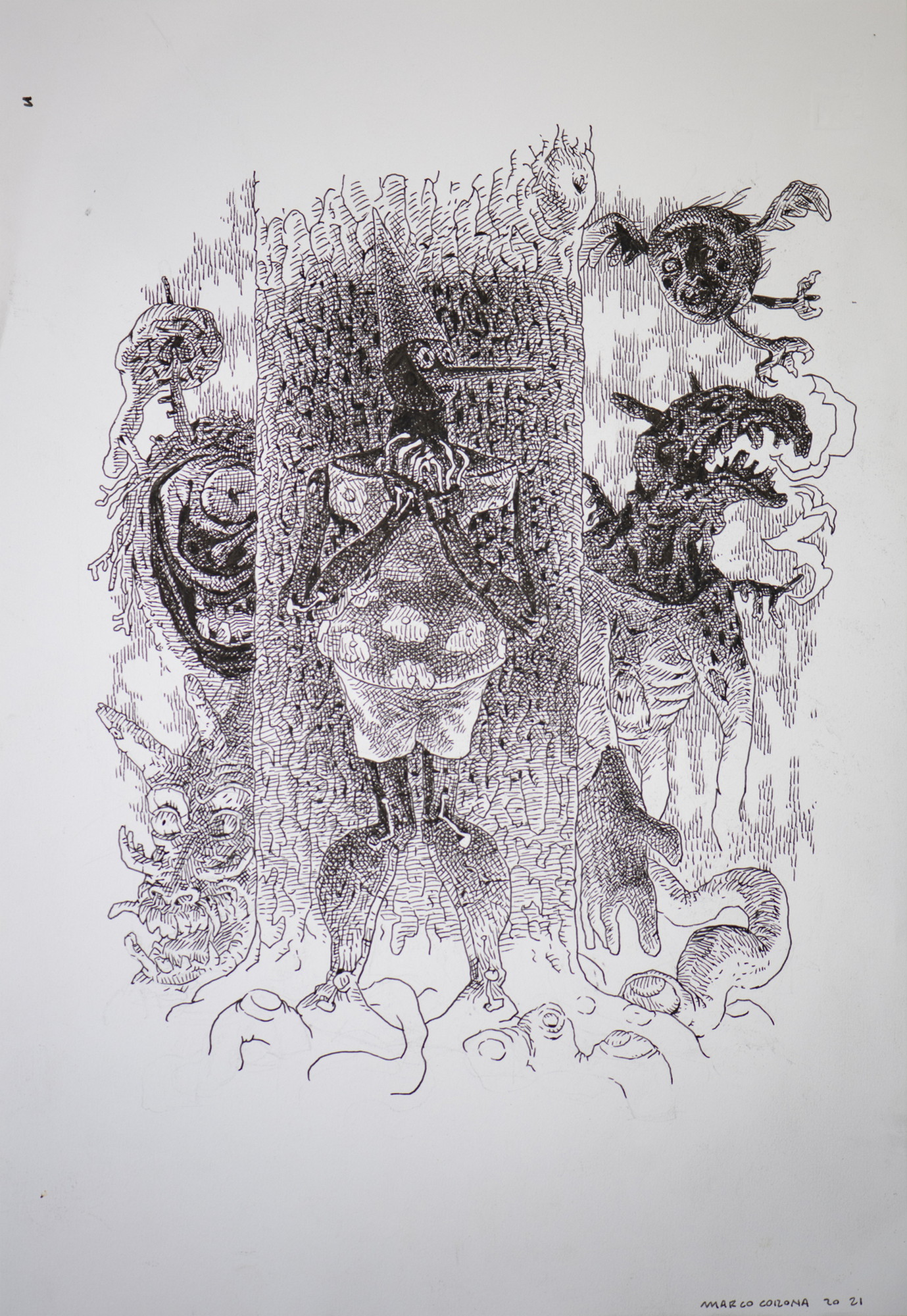 Marco Corona lo fa con un segno che richiama quello xilografico, l’incisione su legno da cui nasce l’arte della stampa occidentale: secco, asciutto, contorto e sofferente. C’è un rimando anche al mestiere del padre, falegname come Geppetto.