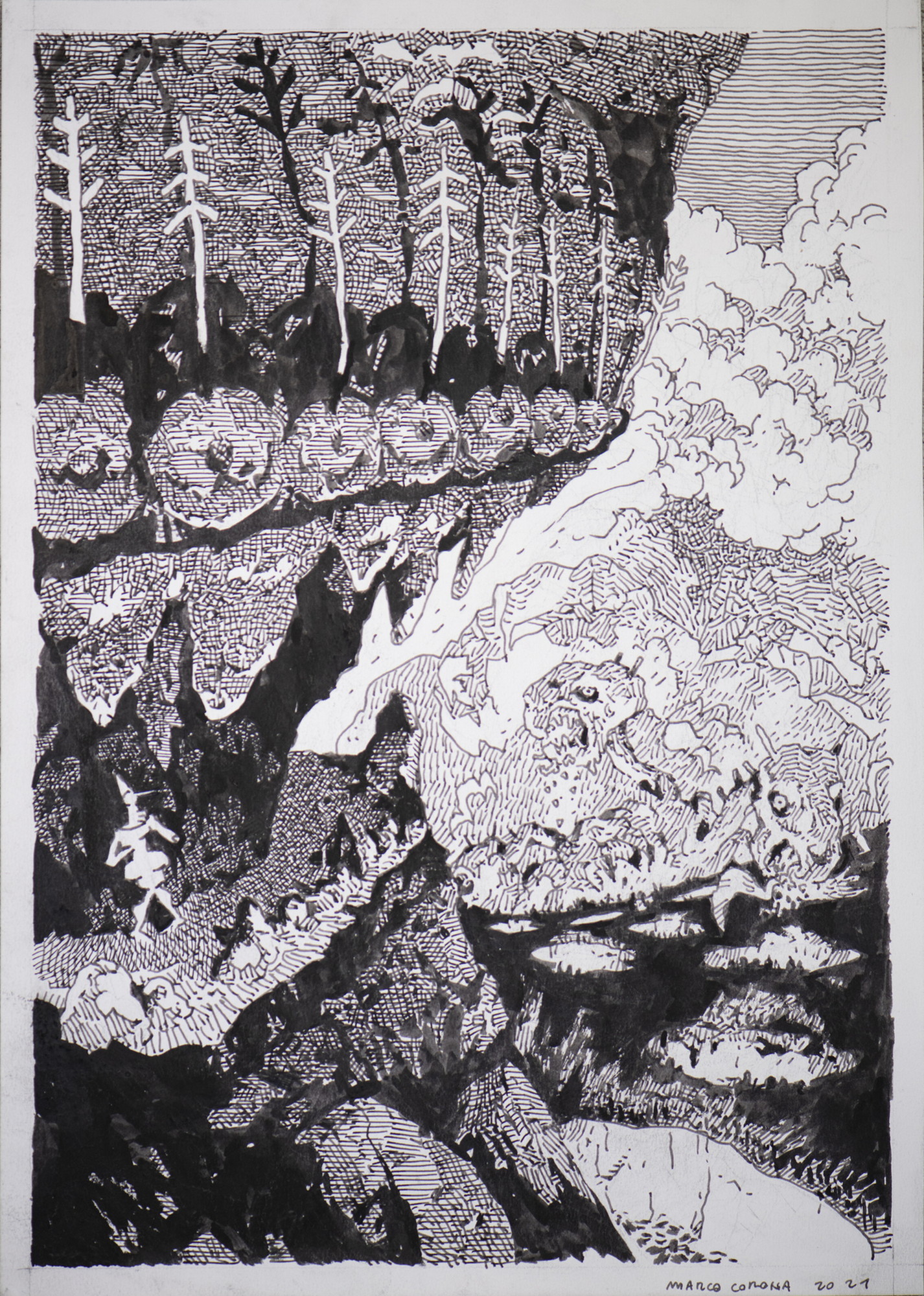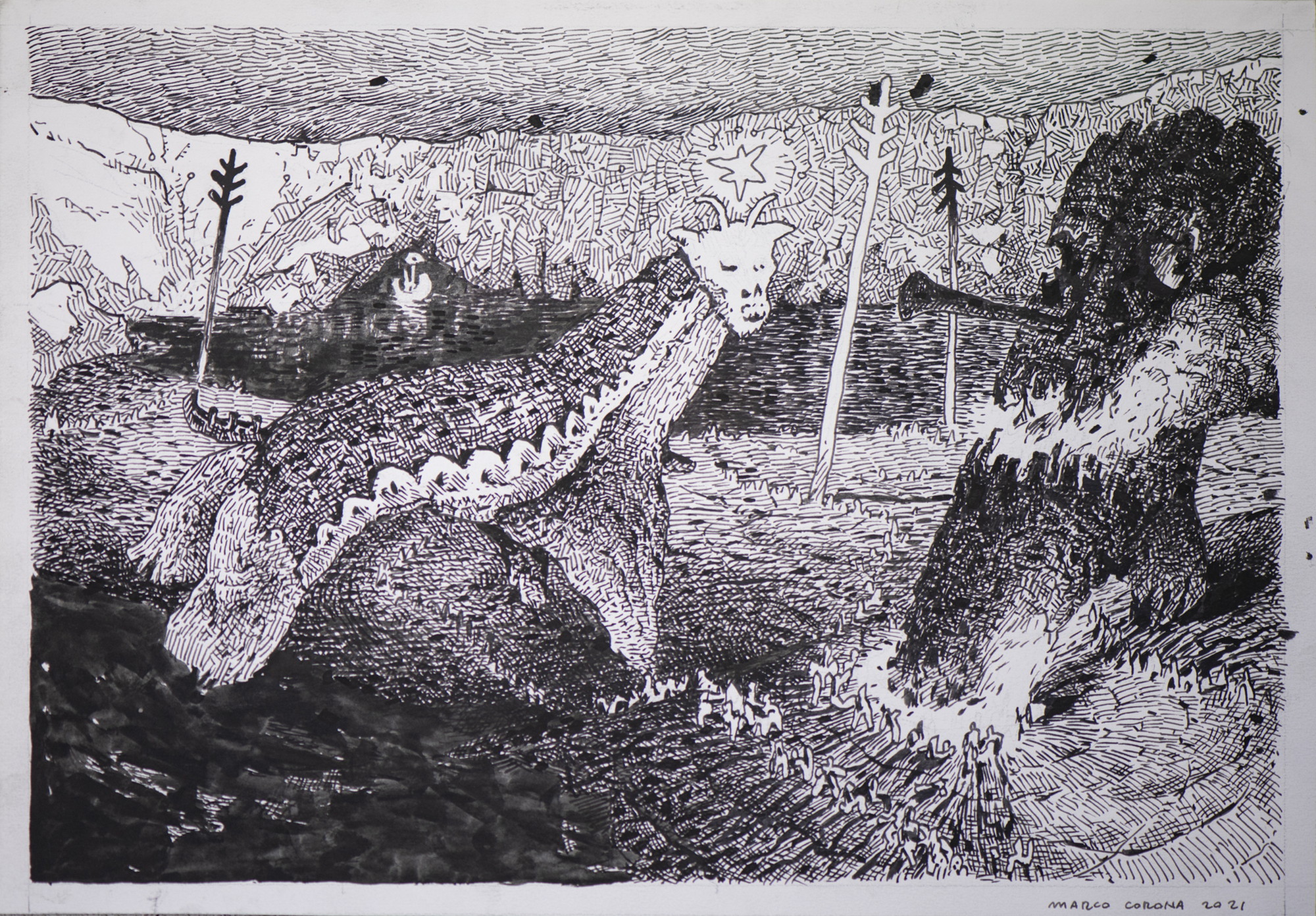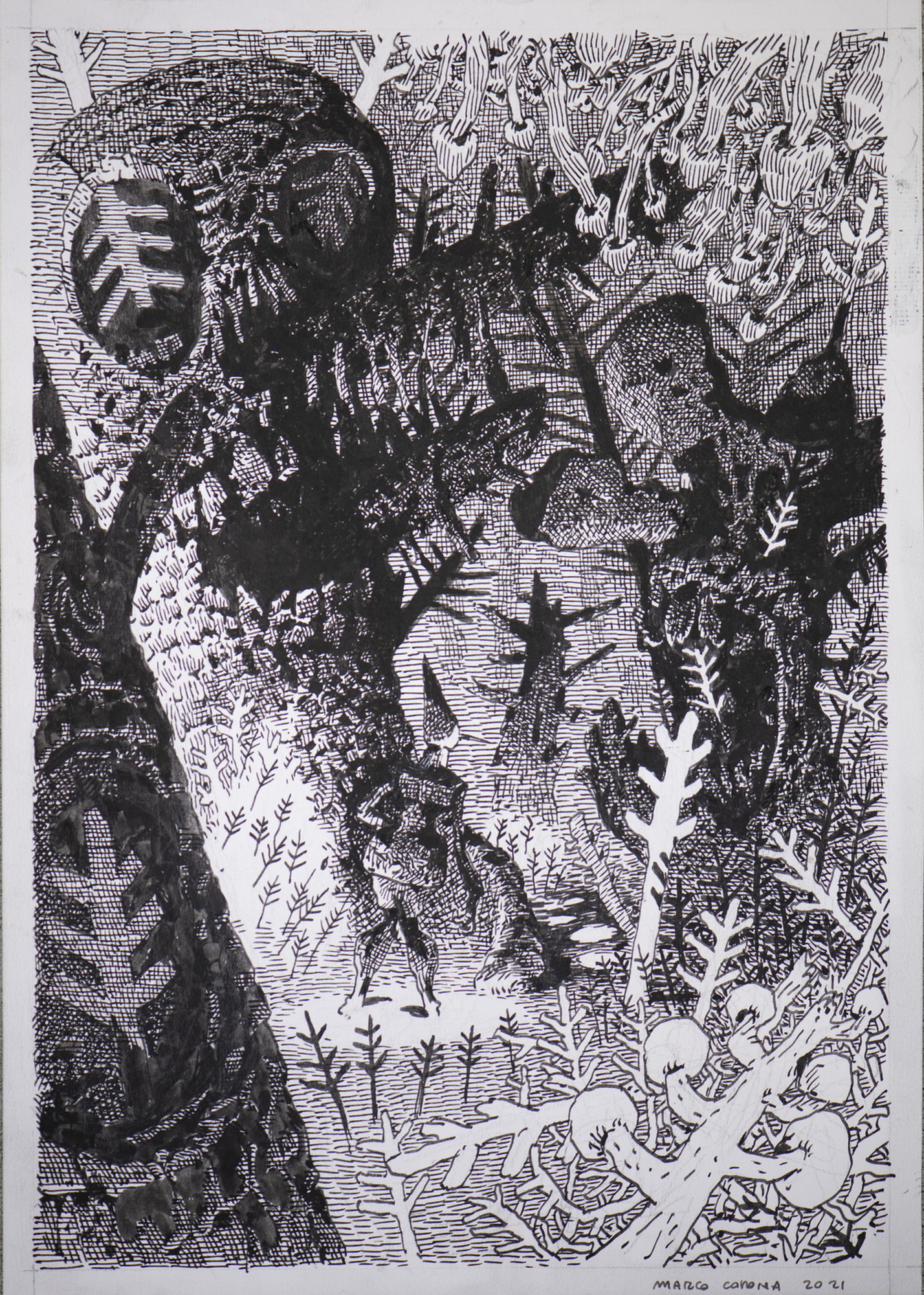 Marco Corona lo fa con un segno che richiama quello xilografico, l’incisione su legno da cui nasce l’arte della stampa occidentale: secco, asciutto, contorto e sofferente. C’è un rimando anche al mestiere del padre, falegname come Geppetto.