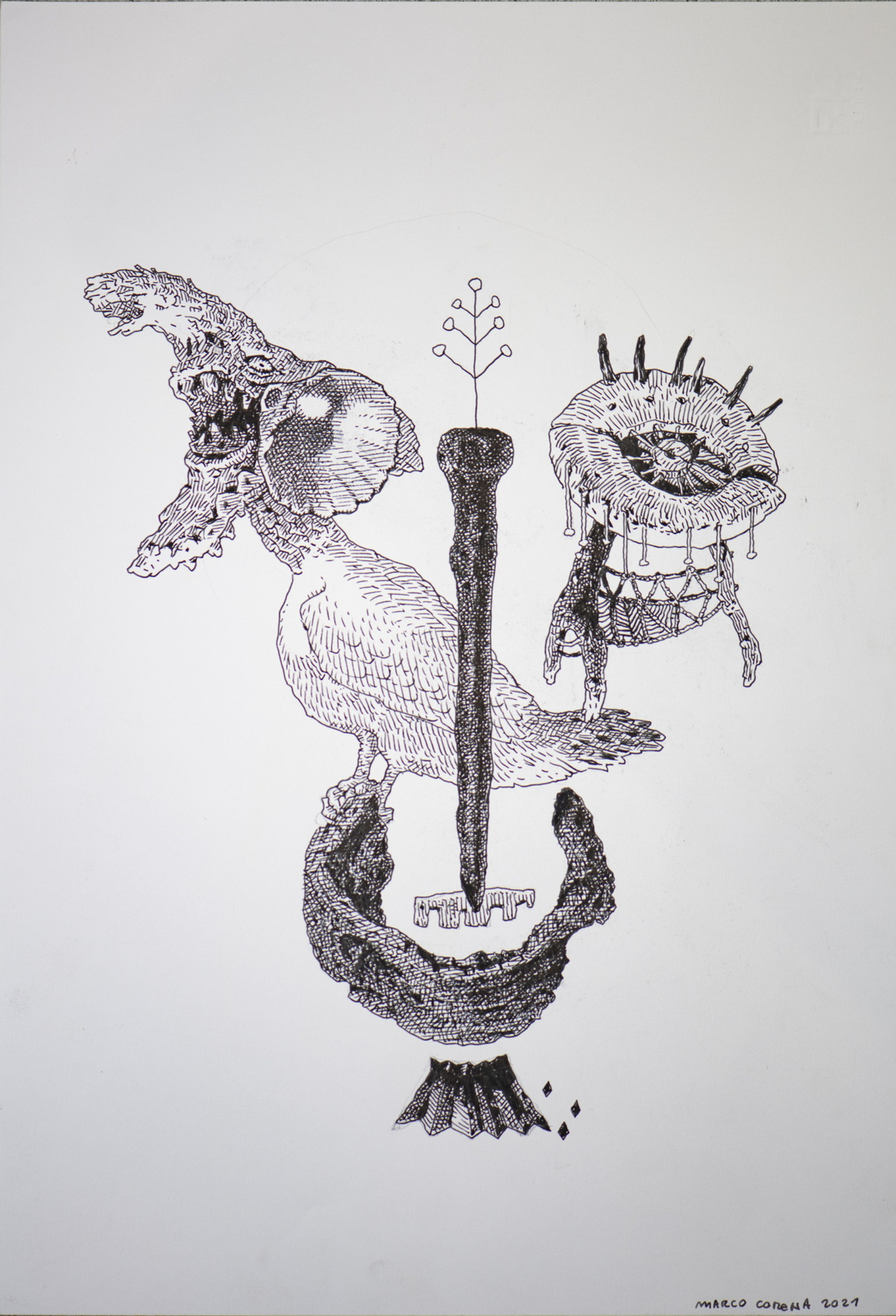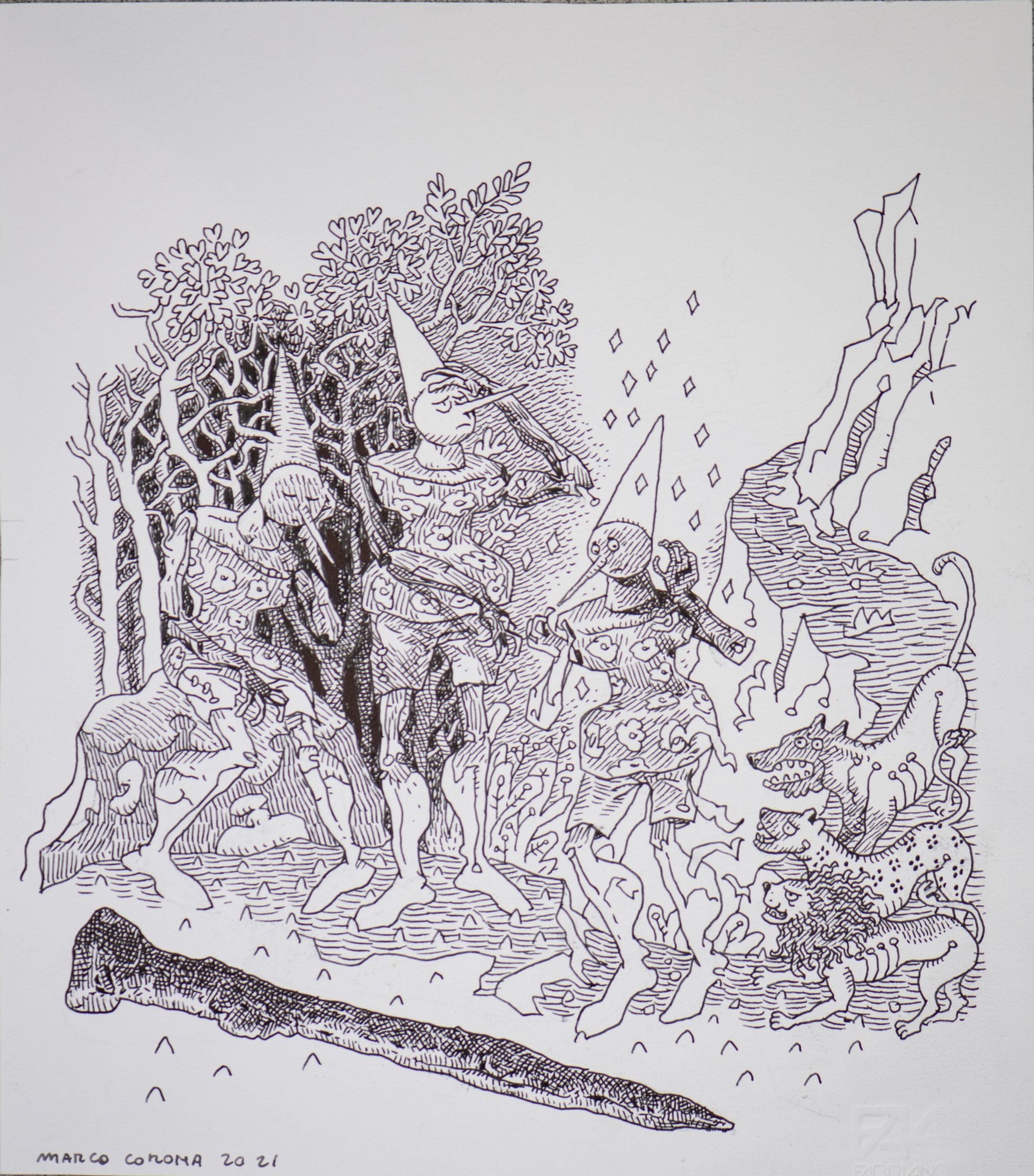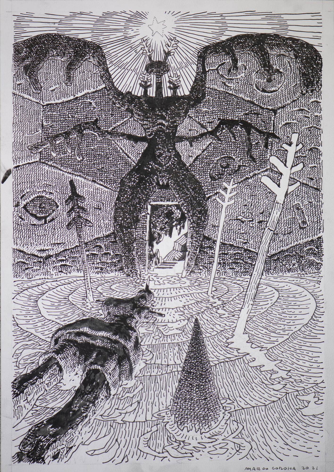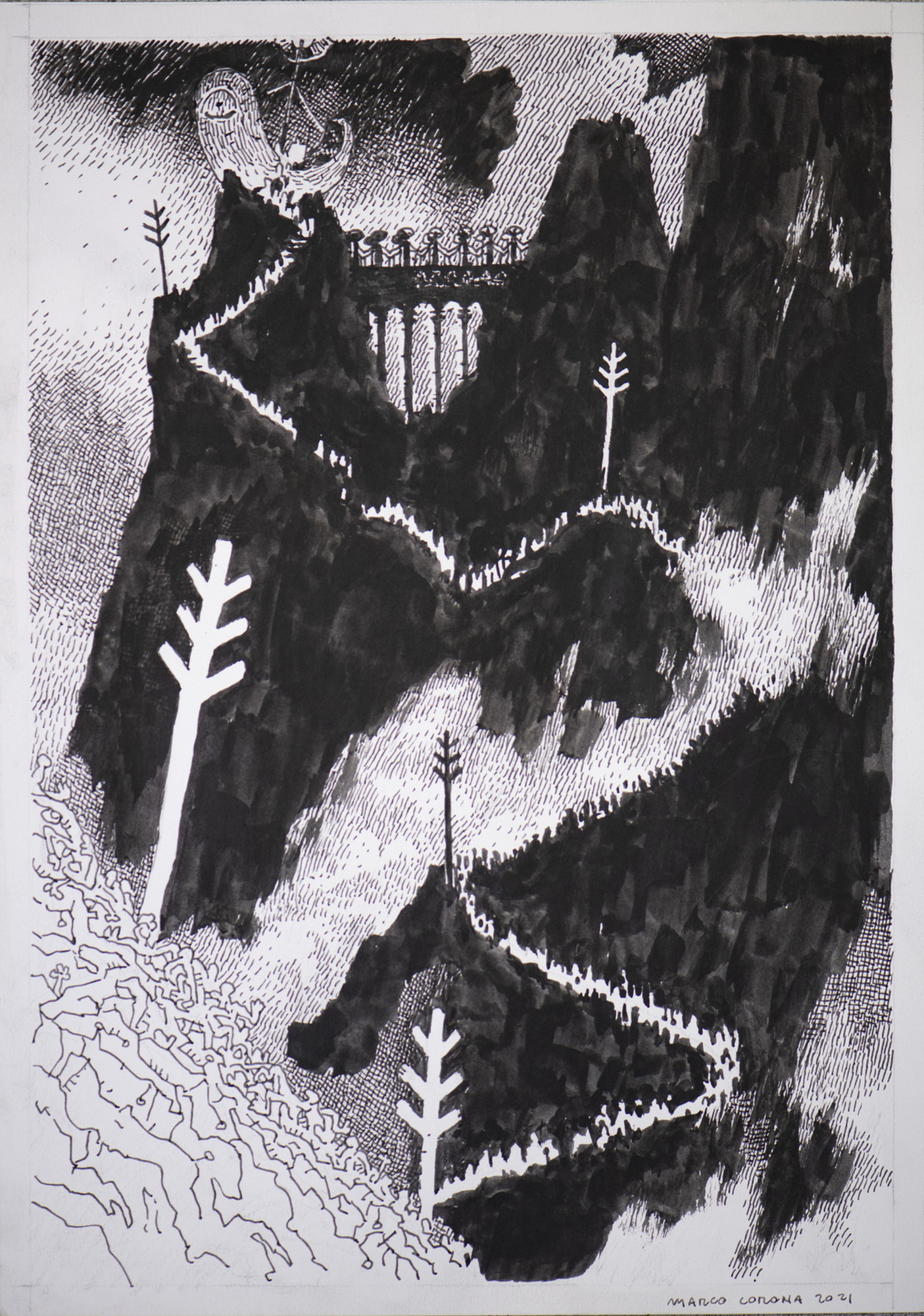 Marco Corona lo fa con un segno che richiama quello xilografico, l’incisione su legno da cui nasce l’arte della stampa occidentale: secco, asciutto, contorto e sofferente. C’è un rimando anche al mestiere del padre, falegname come Geppetto.