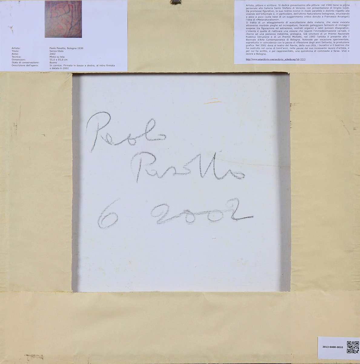 PASOTTO PAOLO (n. 1930) Senza titolo. 2002. Tecnica mista su tela. Cm 55,00 x 55,00. Firma in basso a destra. Al retro firma, data e cartigli descrittivi dell'opera e della vita dell'artista. Cornice presente