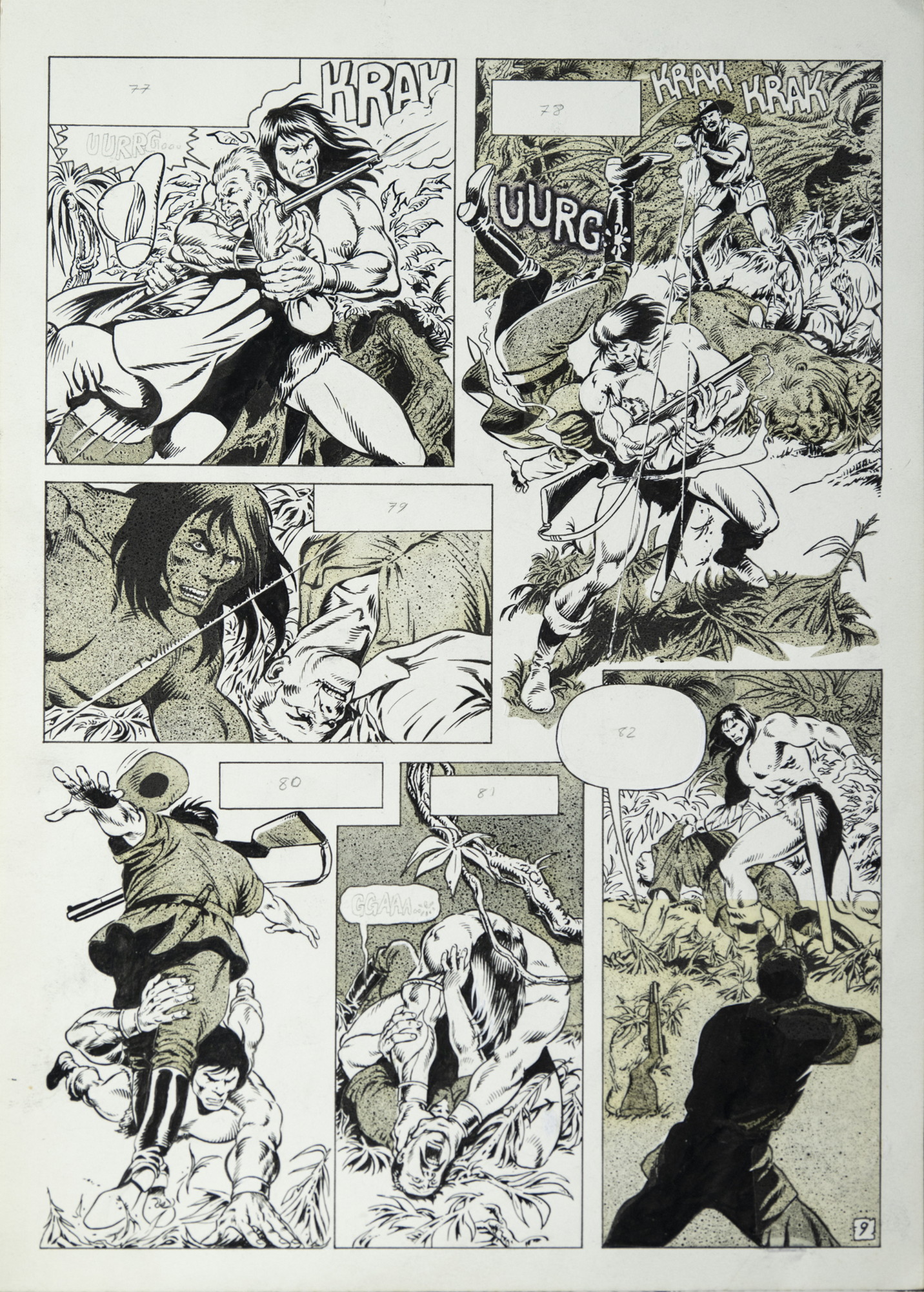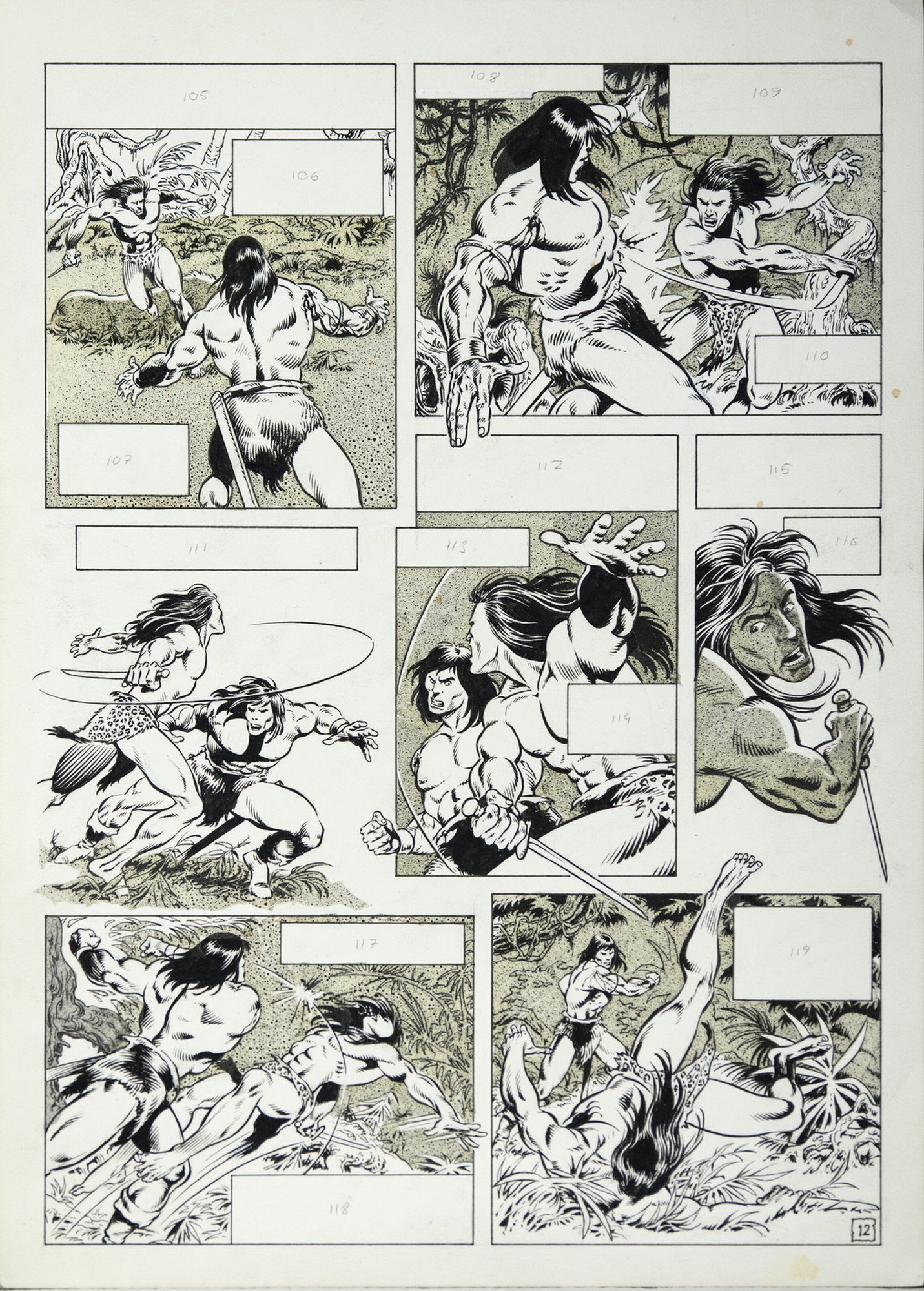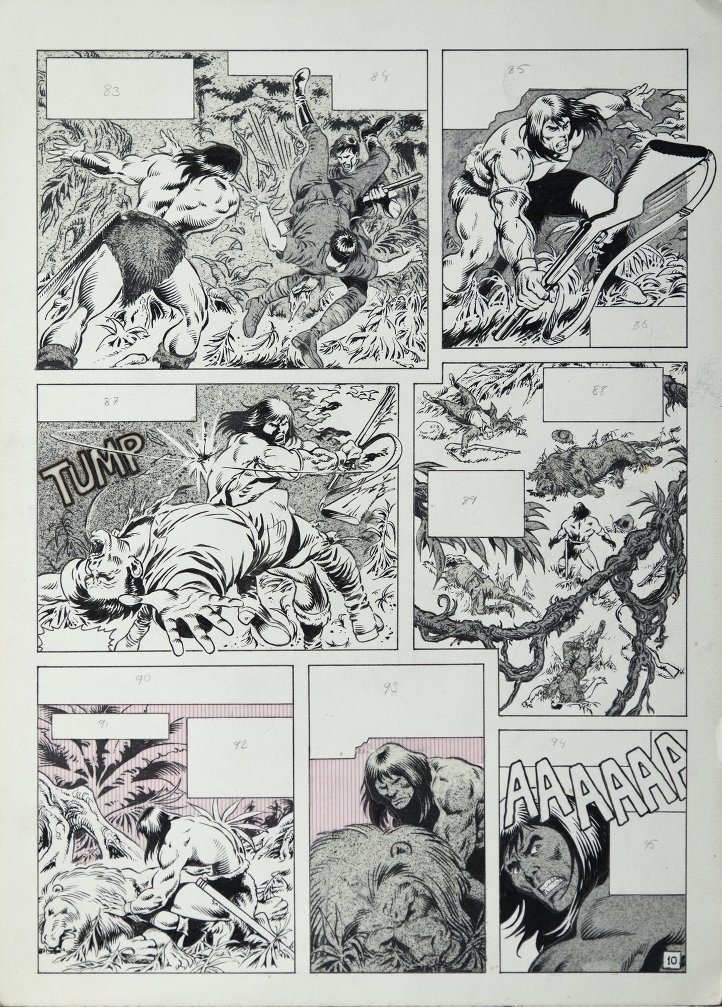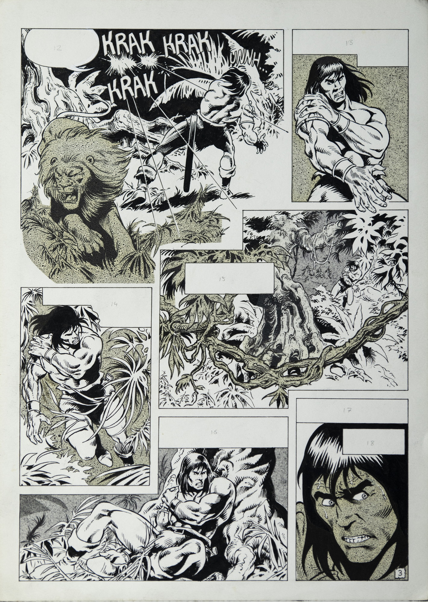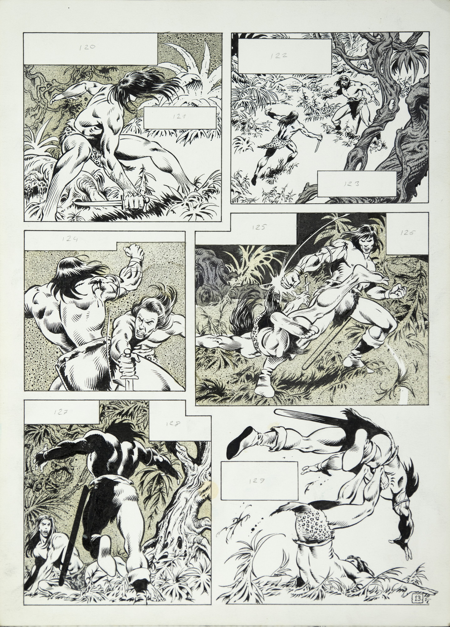 Orer Yildirim Conan contro Tarzan. 1995. china, retini, tecnica mista su cartoncino. . Storia completa e in perfetto stato su Conan il Barbaro realizzata per i fan di Conan e adattata per il mercato brasiliano da Siegfried e Stygio, qui presentata senza lettering. Una vera rarità in puro crossover style opera del grande disegnatore turco Yildiron Orer, già autore di Dago. Nell'edizione pubblicata le colorazioni furono curate da Manuel Diaz Bejarano.