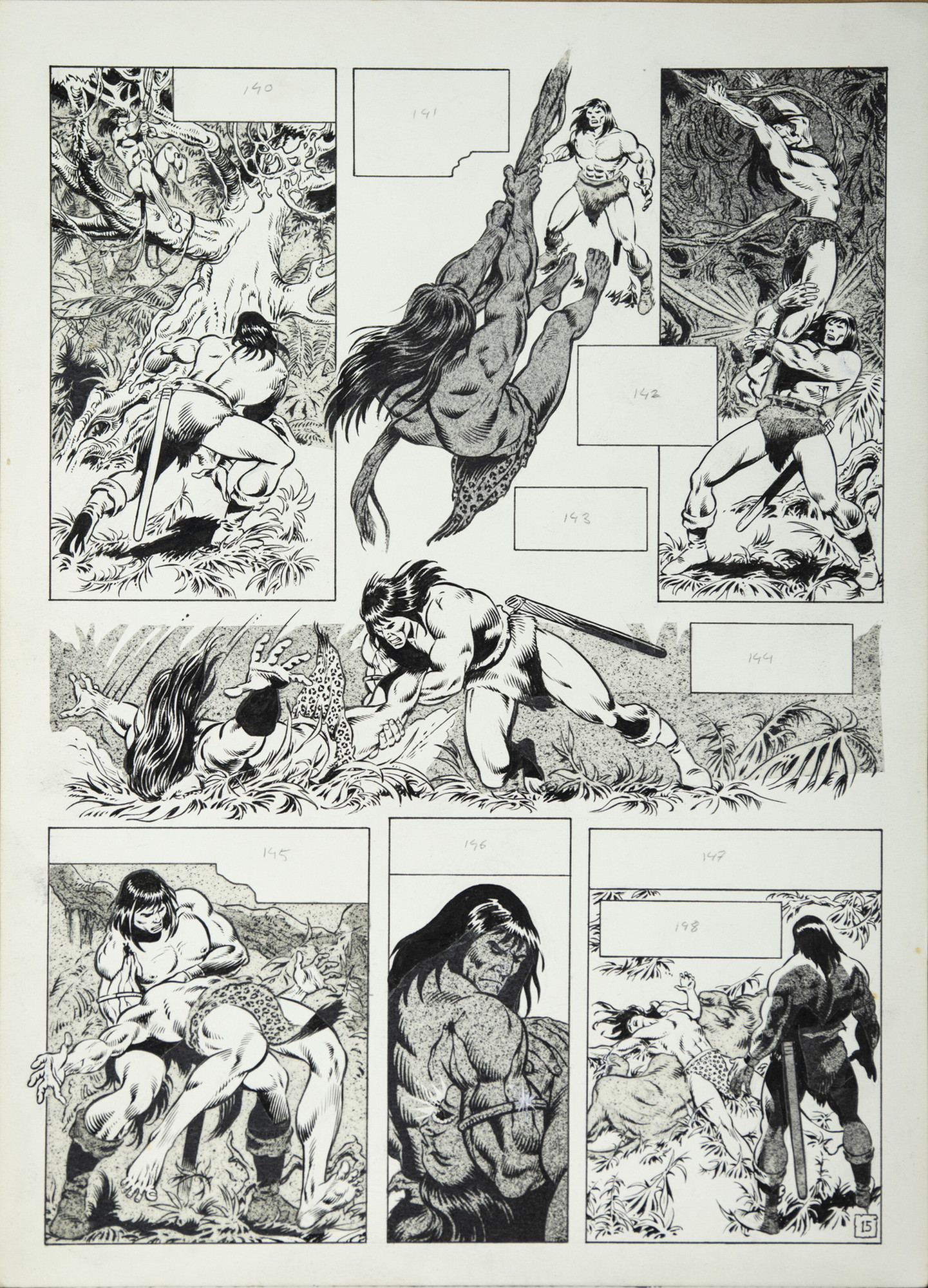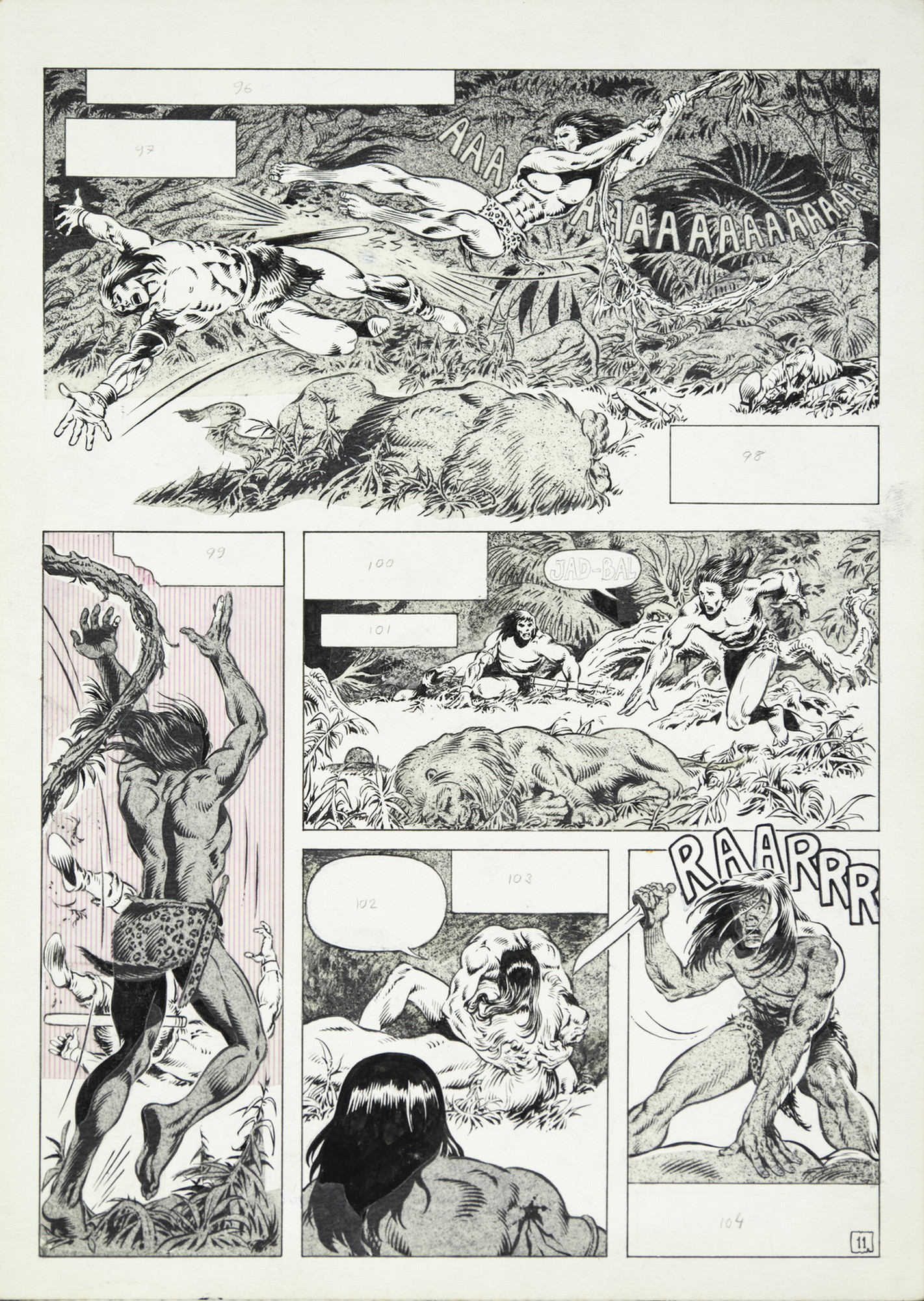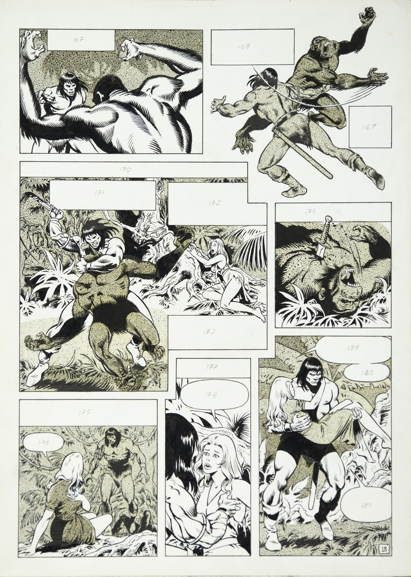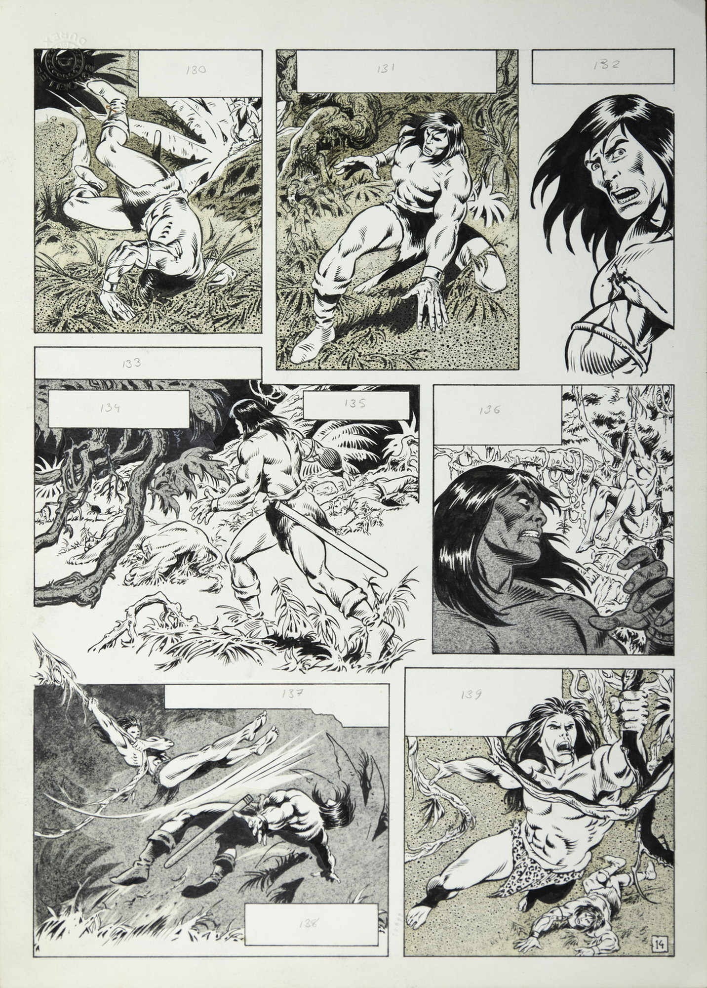Orer Yildirim Conan contro Tarzan. 1995. china, retini, tecnica mista su cartoncino. . Storia completa e in perfetto stato su Conan il Barbaro realizzata per i fan di Conan e adattata per il mercato brasiliano da Siegfried e Stygio, qui presentata senza lettering. Una vera rarità in puro crossover style opera del grande disegnatore turco Yildiron Orer, già autore di Dago. Nell'edizione pubblicata le colorazioni furono curate da Manuel Diaz Bejarano.