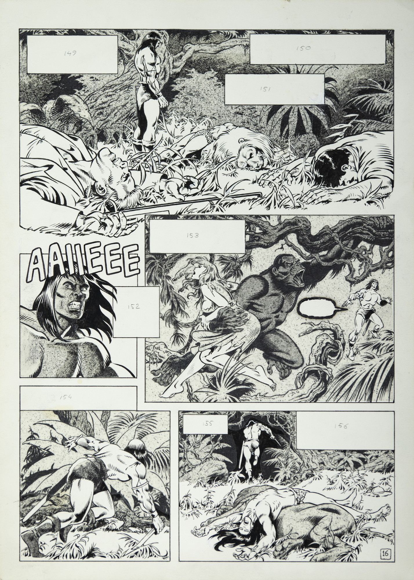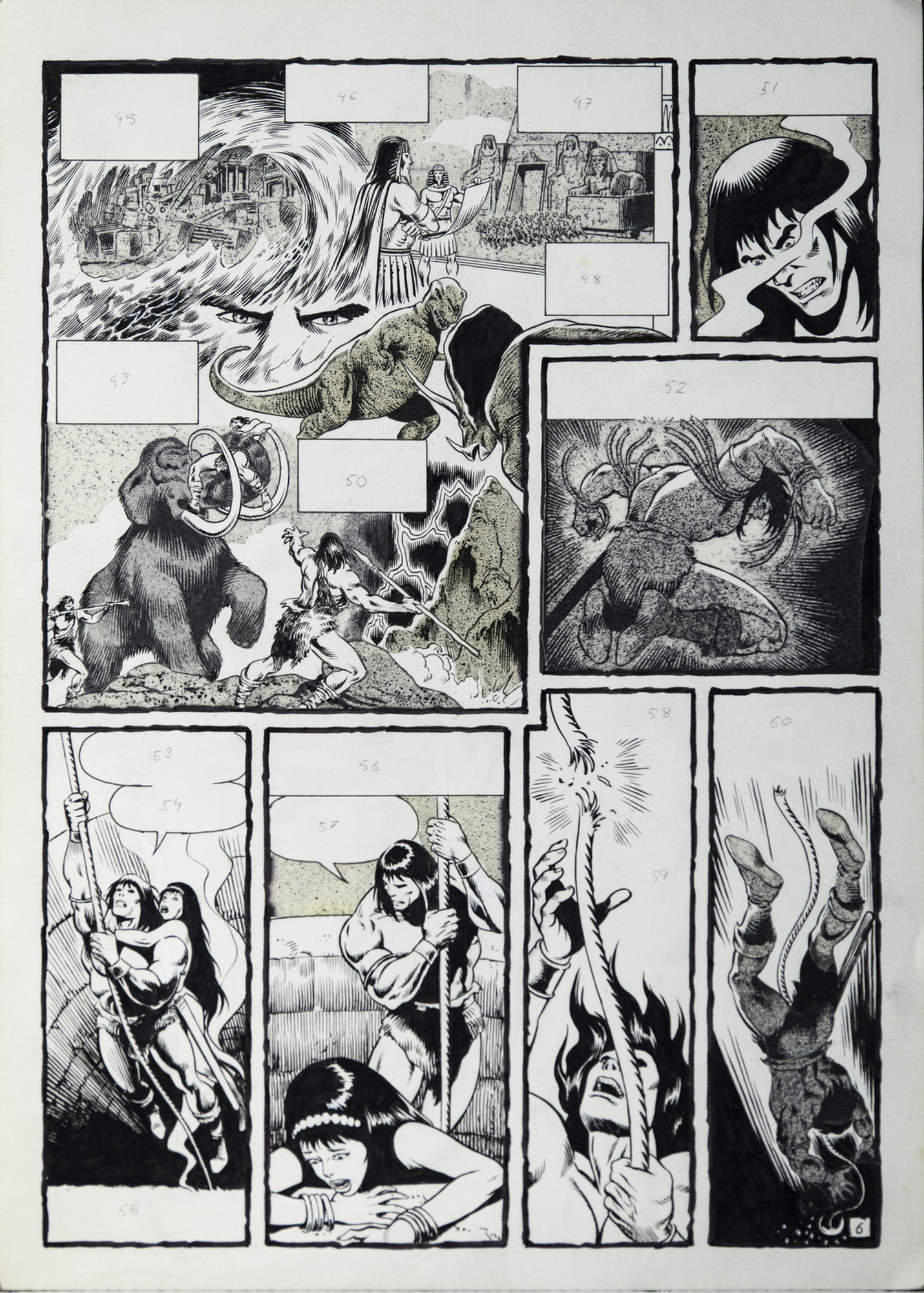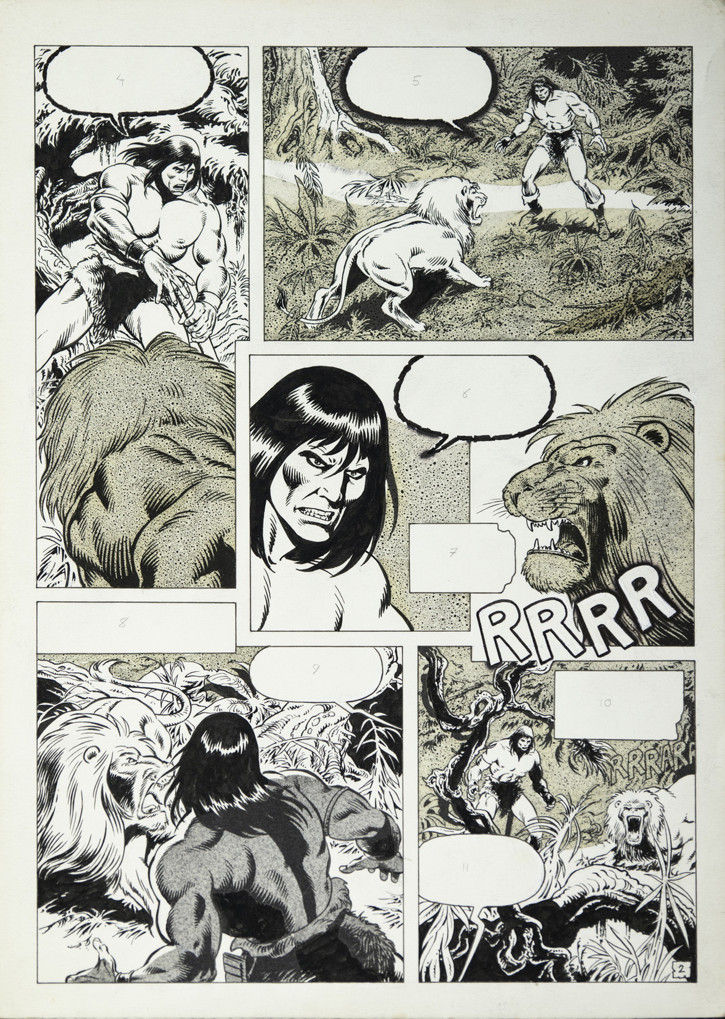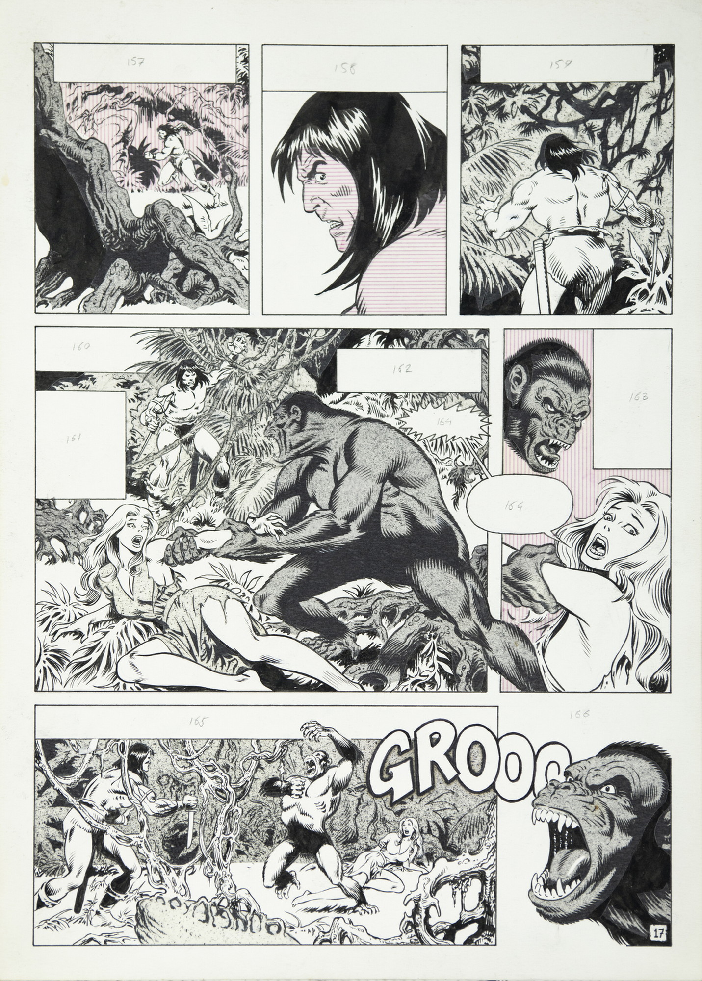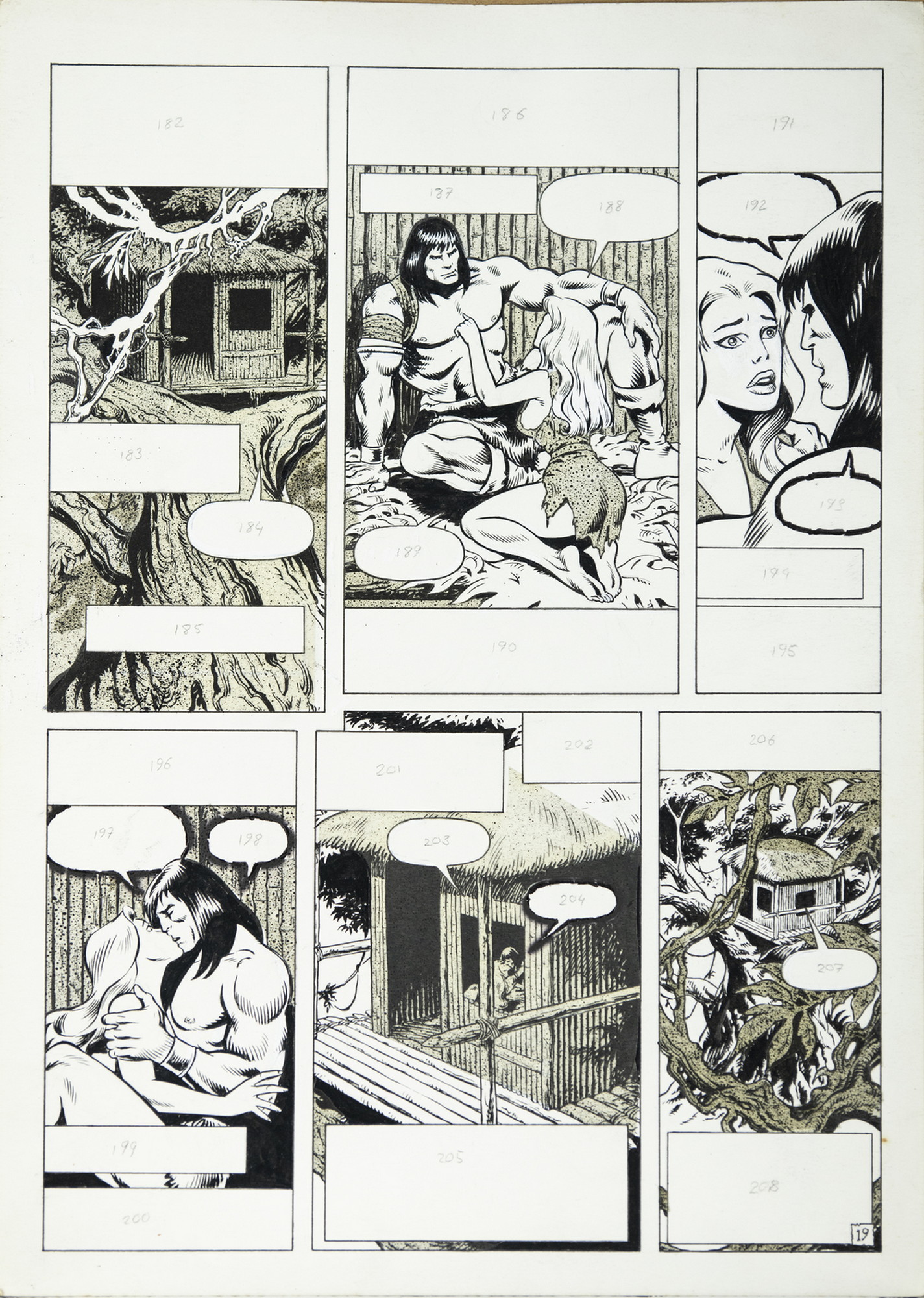 Orer Yildirim Conan contro Tarzan. 1995. china, retini, tecnica mista su cartoncino. . Storia completa e in perfetto stato su Conan il Barbaro realizzata per i fan di Conan e adattata per il mercato brasiliano da Siegfried e Stygio, qui presentata senza lettering. Una vera rarità in puro crossover style opera del grande disegnatore turco Yildiron Orer, già autore di Dago. Nell'edizione pubblicata le colorazioni furono curate da Manuel Diaz Bejarano.
