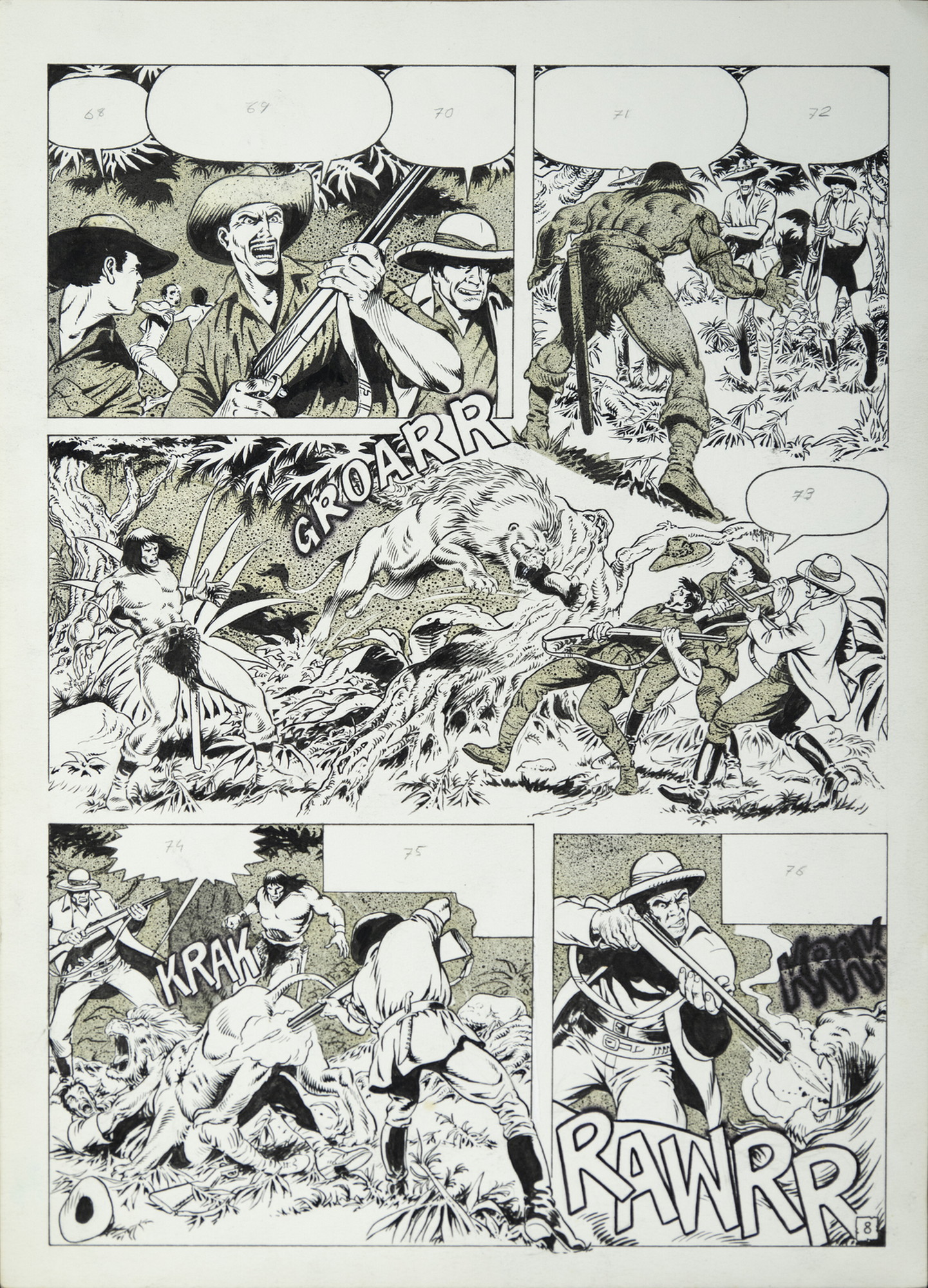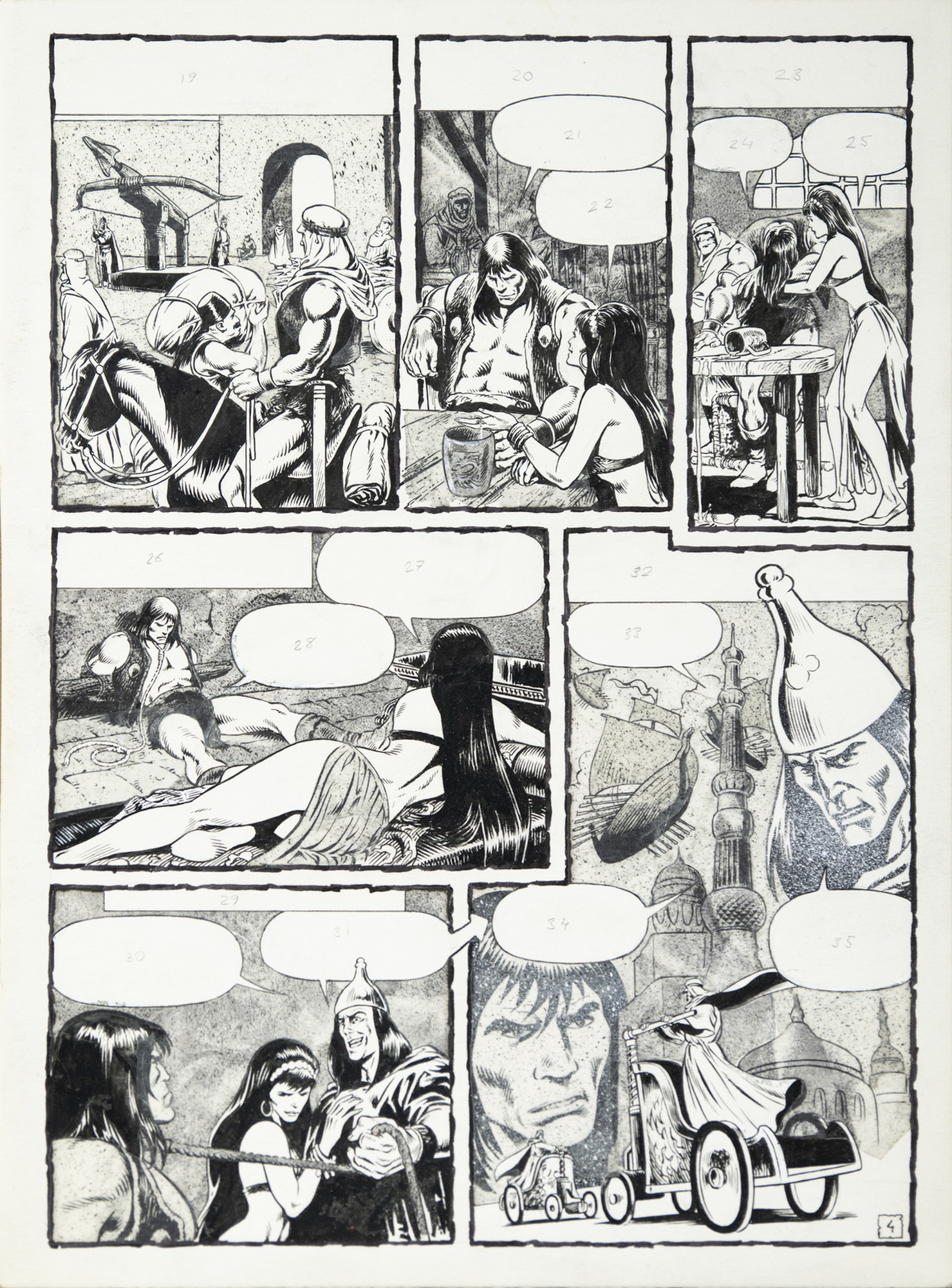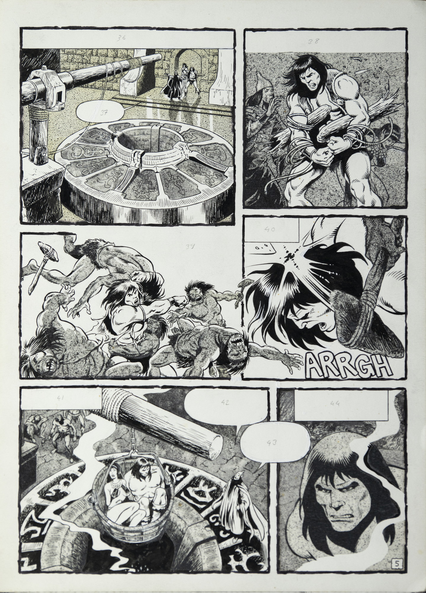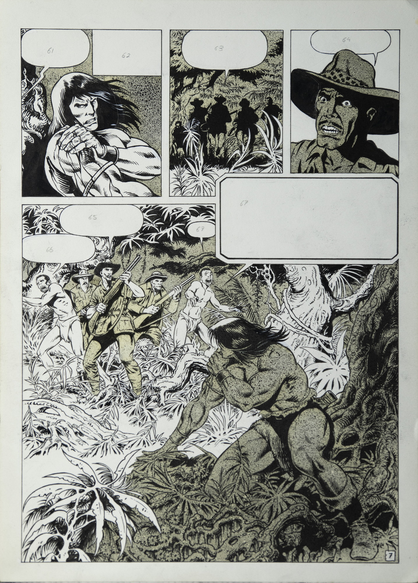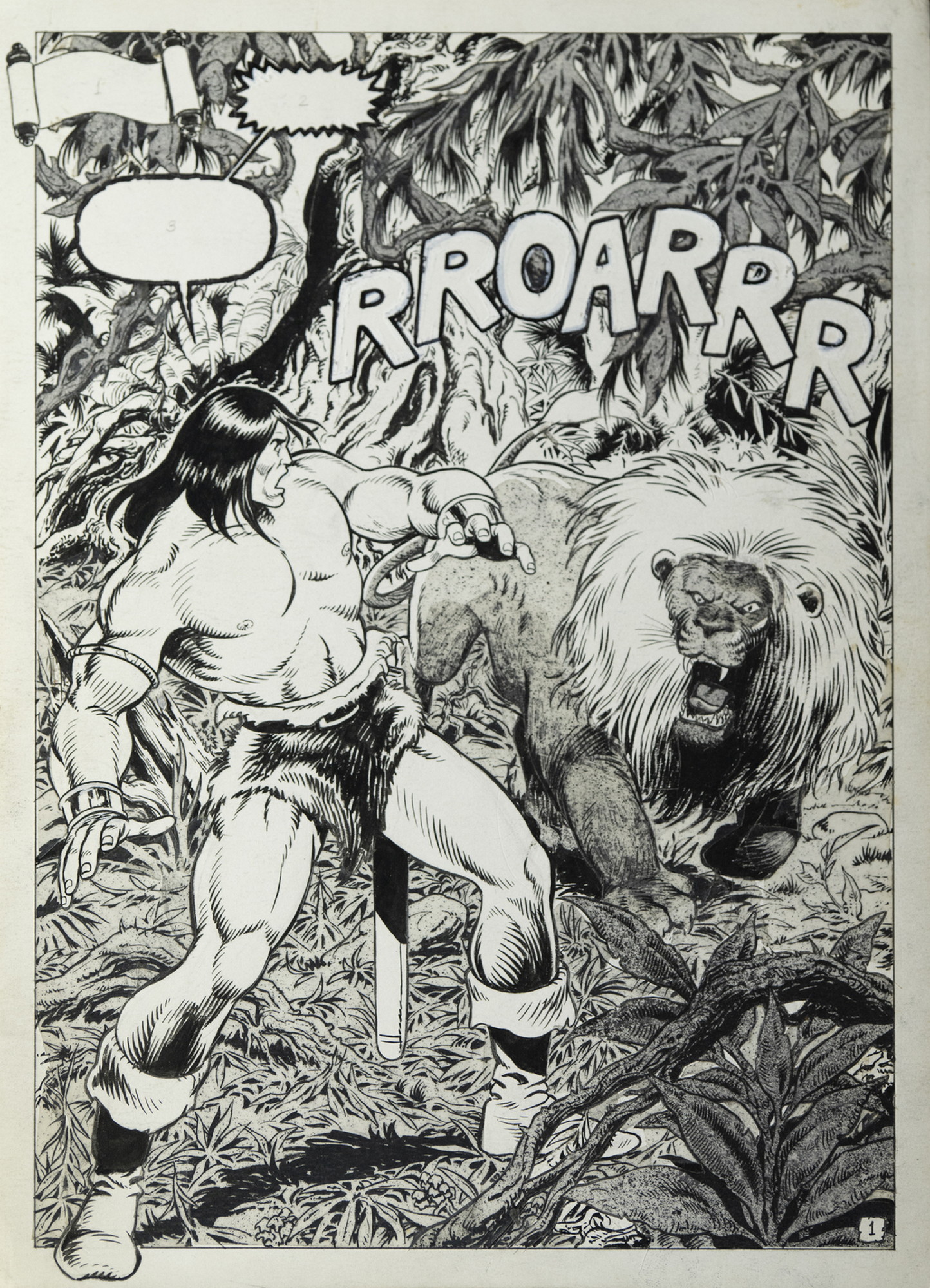 Orer Yildirim Conan contro Tarzan. 1995. china, retini, tecnica mista su cartoncino. . Storia completa e in perfetto stato su Conan il Barbaro realizzata per i fan di Conan e adattata per il mercato brasiliano da Siegfried e Stygio, qui presentata senza lettering. Una vera rarità in puro crossover style opera del grande disegnatore turco Yildiron Orer, già autore di Dago. Nell'edizione pubblicata le colorazioni furono curate da Manuel Diaz Bejarano.