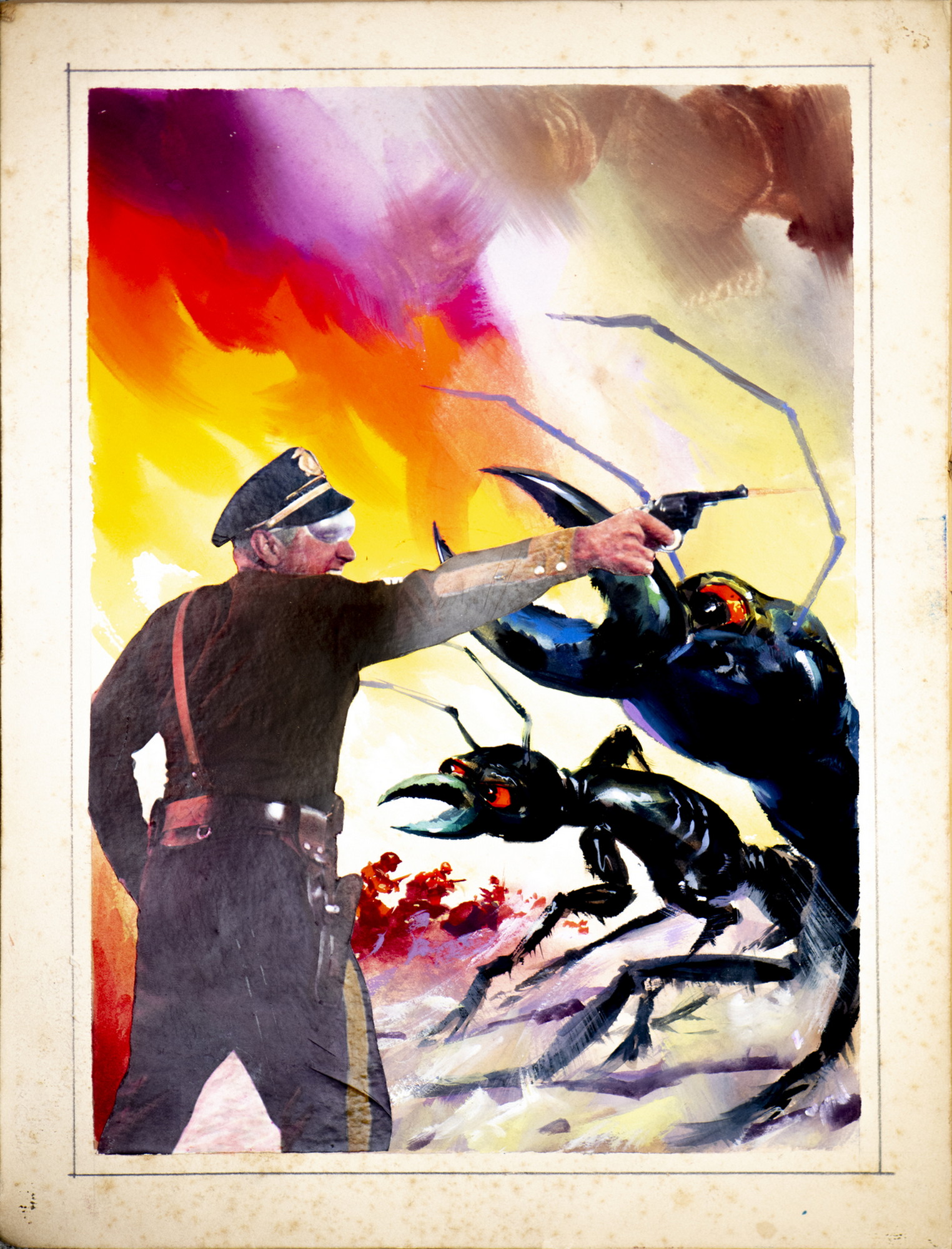 Bozzesi Franco Bozzetto cinematografico per "Assalto alla terra" di Gordon Douglas. 1954. Tempera, disegno, photographic film/cardboard. Cm 24,00 x 32,00. Ed ora una selezione di opere straordinarie, su cartone spesso timbrato al retro L’artistica, storico negozio di belle arti di via del Babuino a Roma negli anni 50 e 60. Un rarissimo repertorio di tavole che rappresenta un esperimento visivo e di contaminazione che dura pochi anni, dalla fine degli anni 50 al 1965, quasi esclusivamente pensati per il mercato francese, per riviste come Star Cine Cosmos e Le film du coer. Selezionati e creati da un artista ed editore geniale come Franco Bozzesi, che poi coinvolge anche autori come Ermanno Iaia e Franco Fiorenzi nella sua officina. Collage, raffinata carta fotografica da pellicola ritagliata e sagomata e ritoccata sopra con interventi di pittura a tempera e ulteriore sfumato applicato il tutto su robuste tavole di cartone. Non propriamente cineromanzo, ma una forma innovativa per profondità, prospettiva, invenzioni che riconduce il cinema di quegli anni quasi ad un unico grande melò. Opere uniche che nascono dai cineracconti degli anni ’40 che arrivano a un passo dal fotoromanzo, la stagione d' oro (con il balloon vero e proprio) comincia probabilmente con "Super cinema", alla fine del 1950 (prima uscita Il brigante Musolino) e l' apogeo è a metà del decennio: nascono e muoiono "Fotoromanzo gigante", "I grandi films-I capolavori dello schermo", "Amica film", "I vostri film-romanzo".