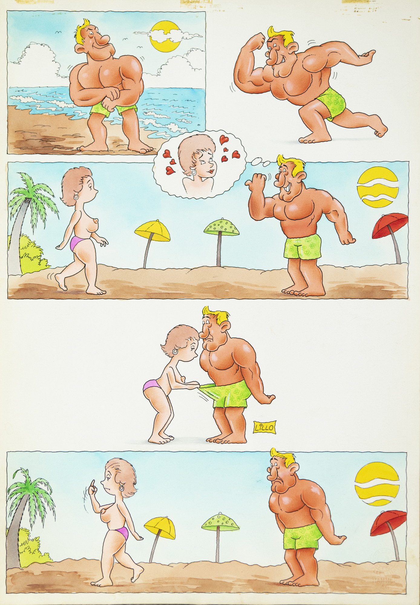 LILLO Due tavole umoristiche. 1999. Chine colorate su Cartoncino Schoeller. Cm 36,00 x 25,00. Due tavole umoristiche firmate Pasquale Petrolo in arte Lillo, oggi celebre attore che non ha mai dimenticato le sue origini come geniale autore di fumetti.
