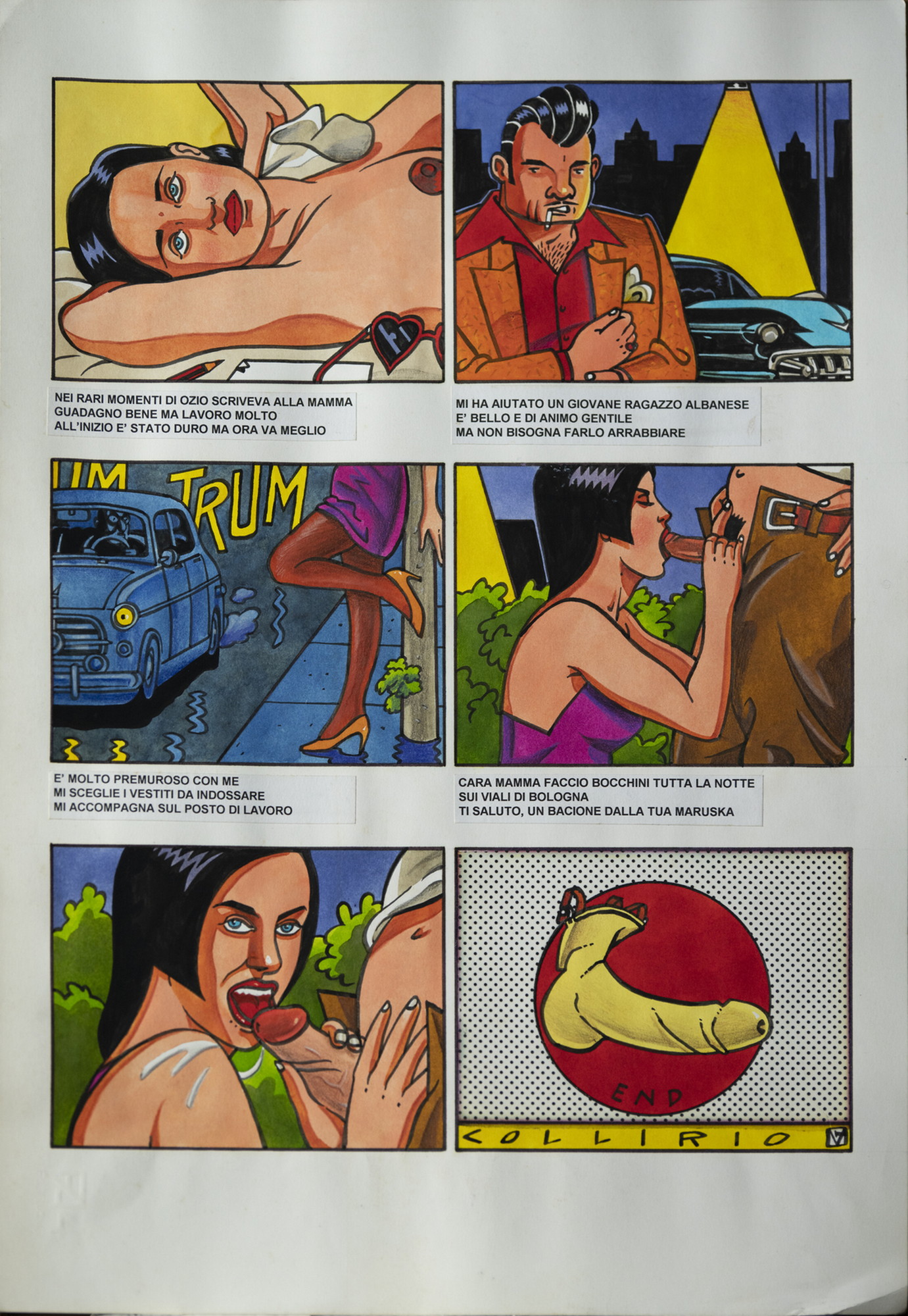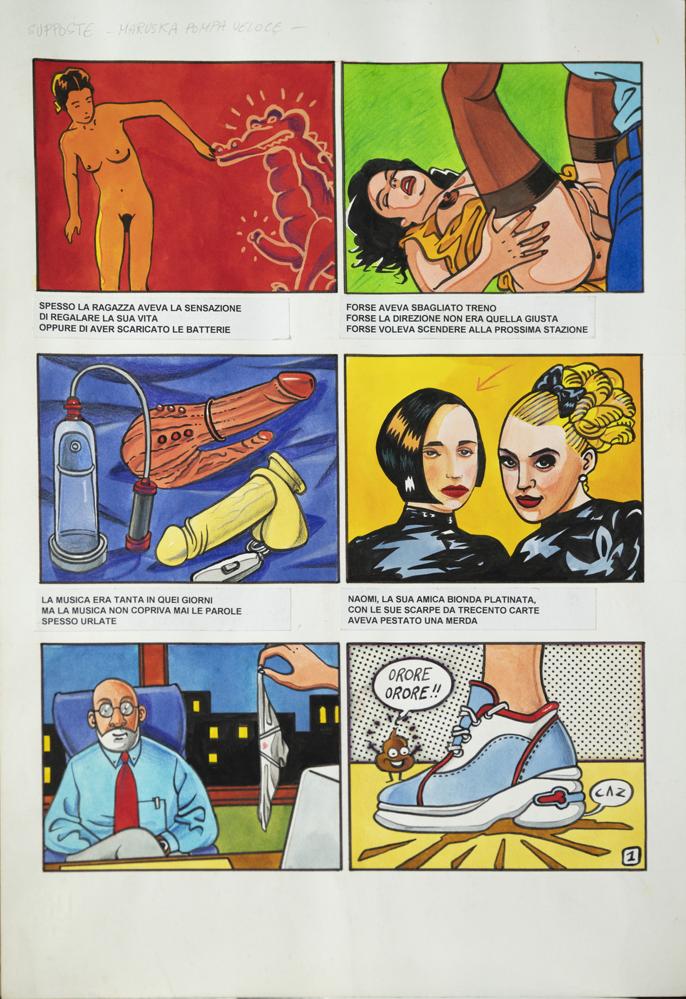 COLLIRIO Supposte Maruska Pompa veloce. 1989. Tecnica mista su carta: pastelli, tempera. Cm 48,00 x 33,00. 4 tavole pubblicate ai tempi di Frigidaire dove due tavole firmate Collirio