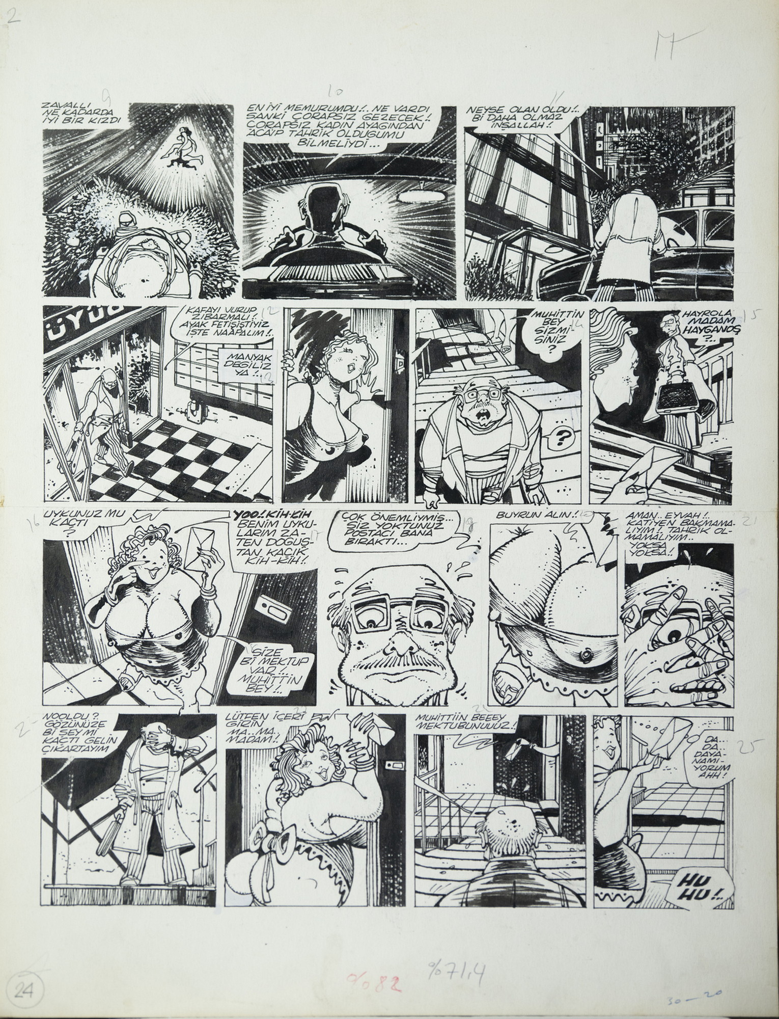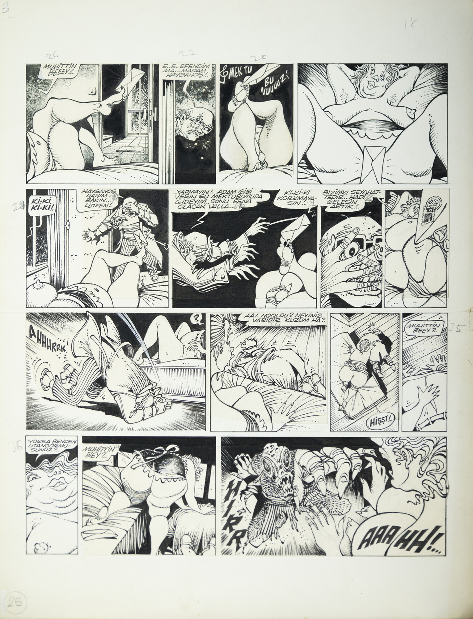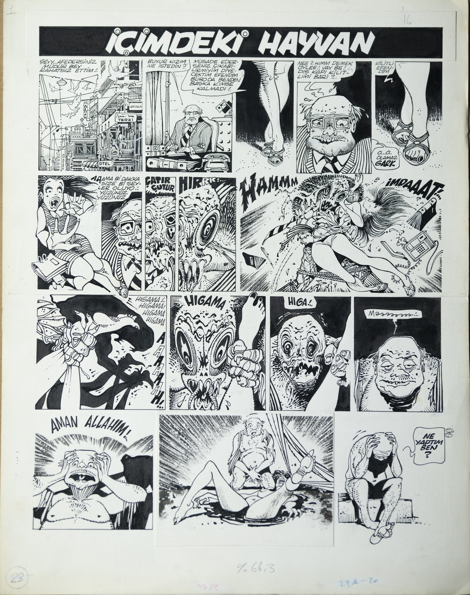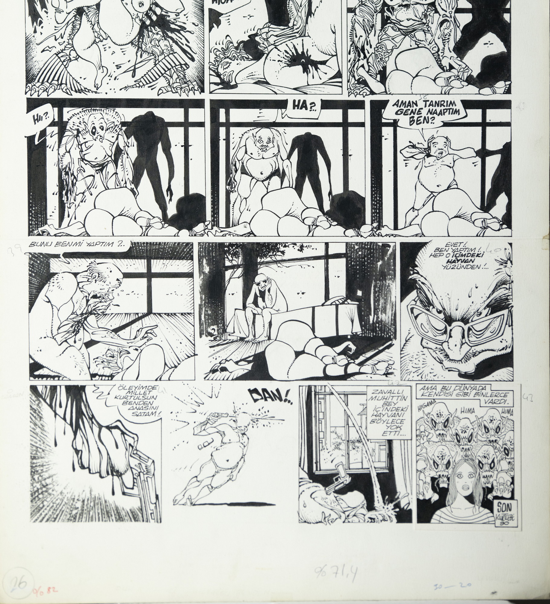 Kurtcebe Nuri "L'animale dentro di me/Icimdeki Hayvan". 1990. China su carta. Cm 42,50 x 34,00. Quattro grandi tavole montate sul retro, per una storia conclusiva di taglio splatter, di uno dei più importanti fumettisti di satira politica della Turchia. Fondatore di Girgir, il settimanale satirico che per la prima volta ha sperimentato il genere in Turchia. Di lui si ricorda la condonna nel 2015 ricevuta da Erdogan, ad oltre un anno di carcere, per alcune vignette satiricihe. Firmato sull'ultima pagina
