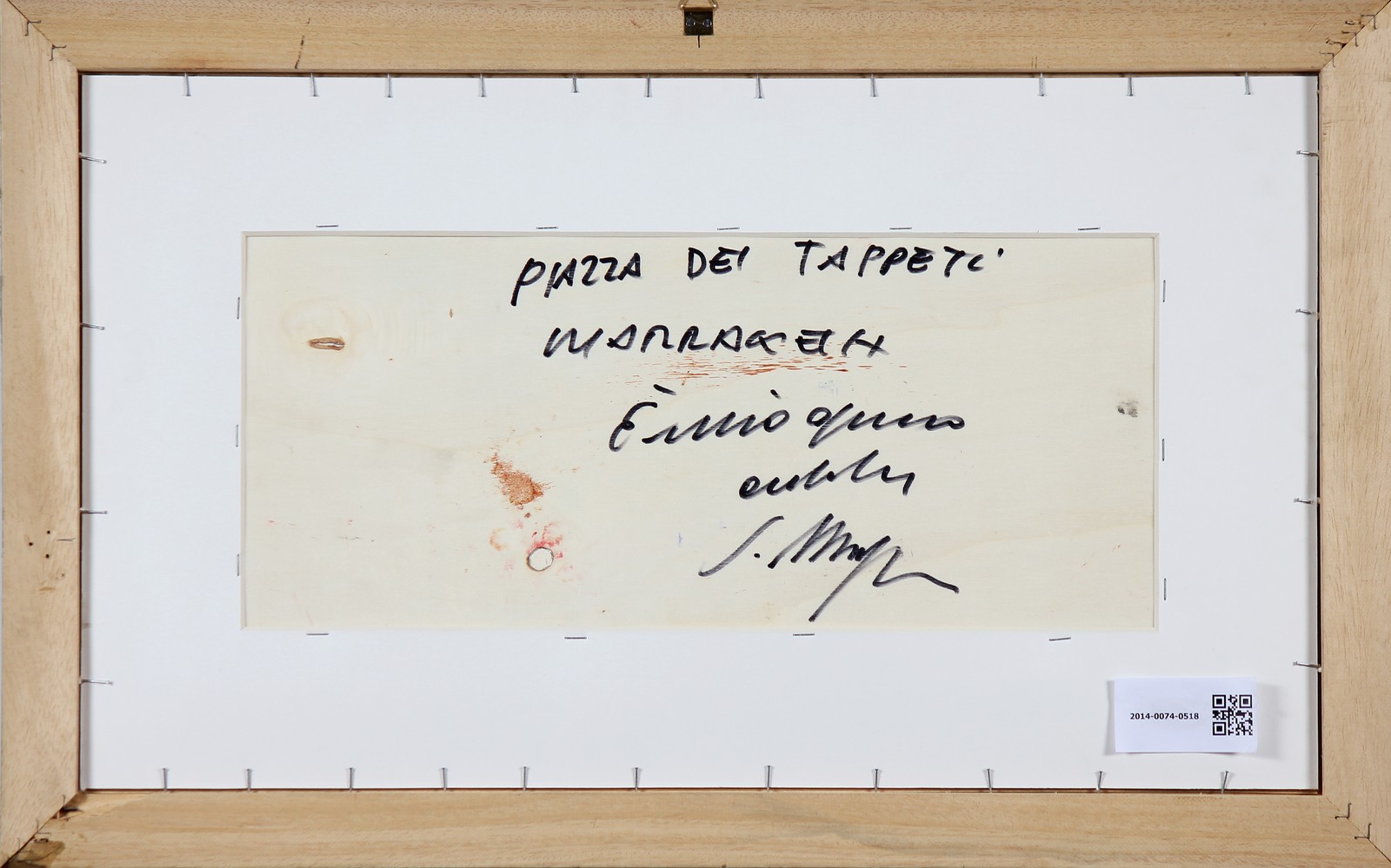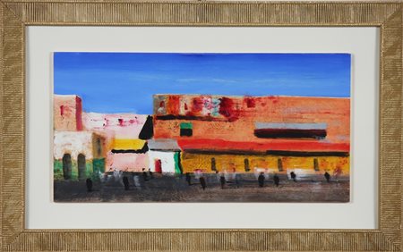 MAGAZZINI SALVATORE (n. 1955) Piazza dei tappeti Marrakech. Olio su tavola. Cm 50,00 x 25,00. Firma in basso a sinistra. Al retro firma per autentica e titolo. . Cornice presente