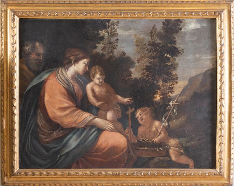 Maestro del XVII secolo. "Sacra Famiglia con S. Giovannino". Olio su tela. Cm 74x96.5.