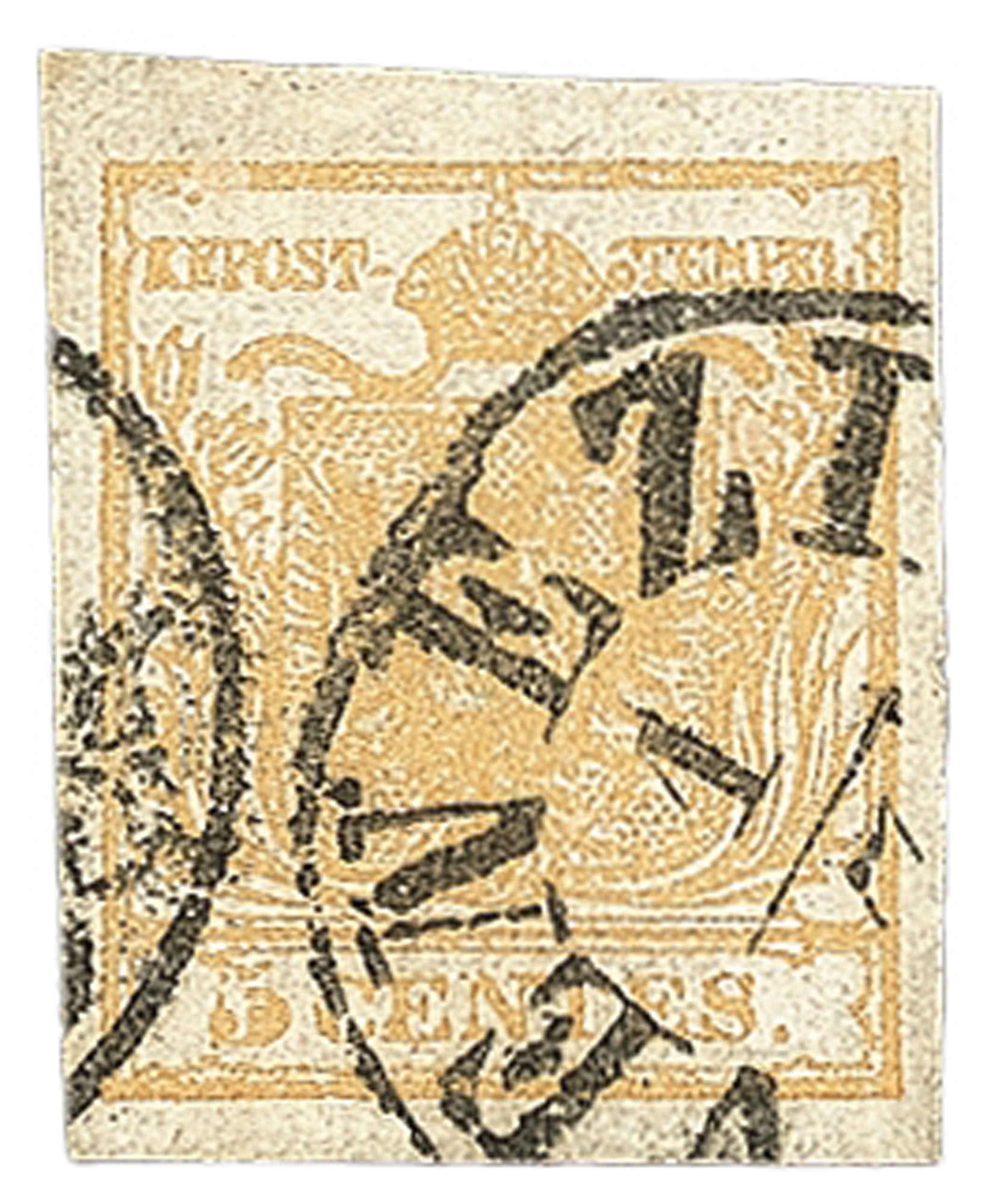 Antichi Stati Italiani - Lombardo Veneto - 1851 - 5 cent (13A cat. 3.250)5 cent giallo ocra con controstampa diritta (13A cat. 3.250) usato - ottimi margini - cert. Colla