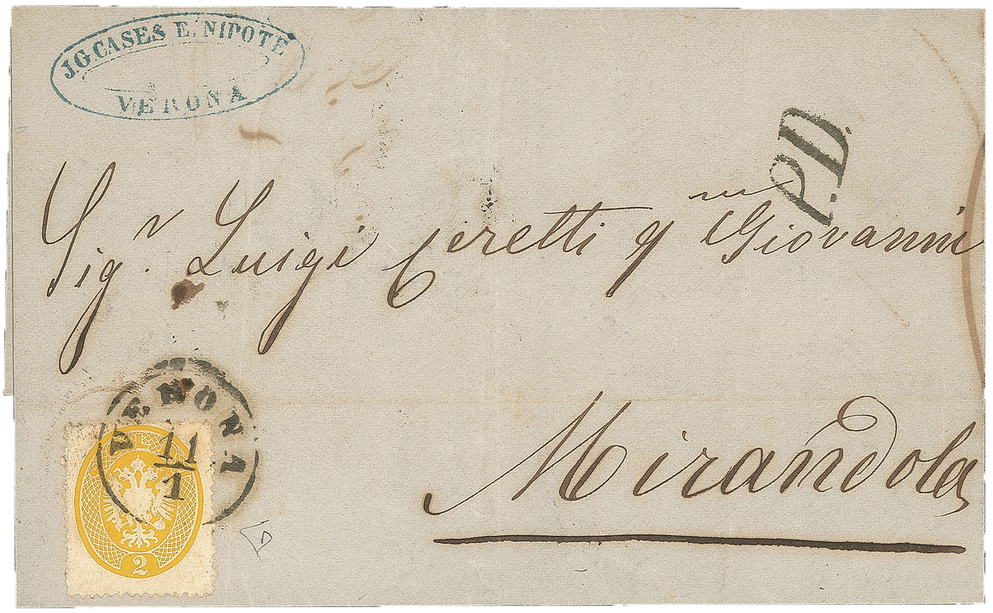 Antichi Stati Italiani - Lombardo Veneto - Circolare (36 cat.1000)Circolare affrancata con 2 soldi giallo (36 cat.1000) da Verona 11/1 del 1863 per Mirandola - ex collezione Milani