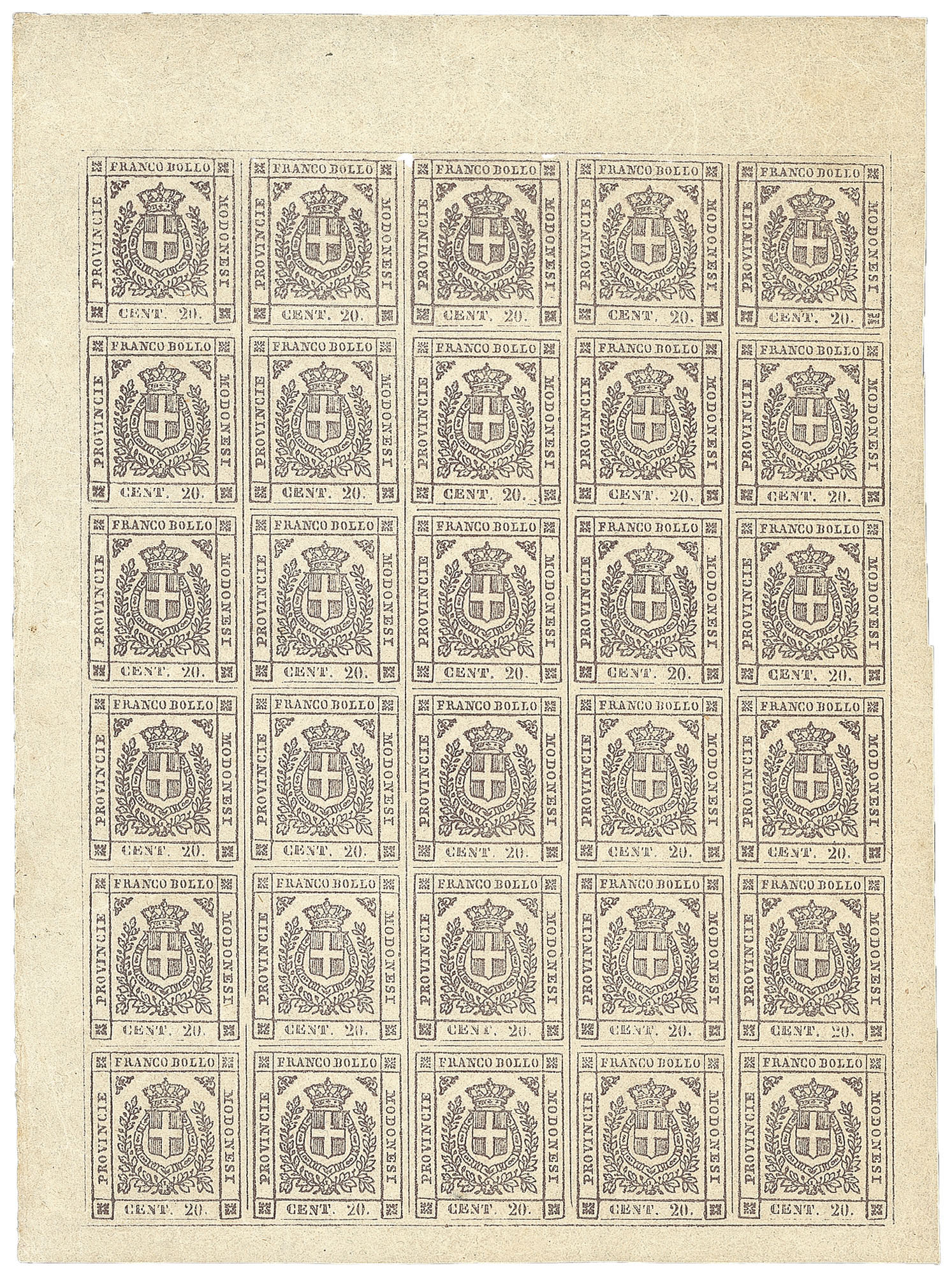 Antichi Stati Italiani - Modena - Governo Provvisorio - 1859 - 20 (16)20 cent lilla grigio chiaro (16) - gruppo di foglio da 30 - gomma integra - qualità splendida - un solo esemplare con assottigliamento