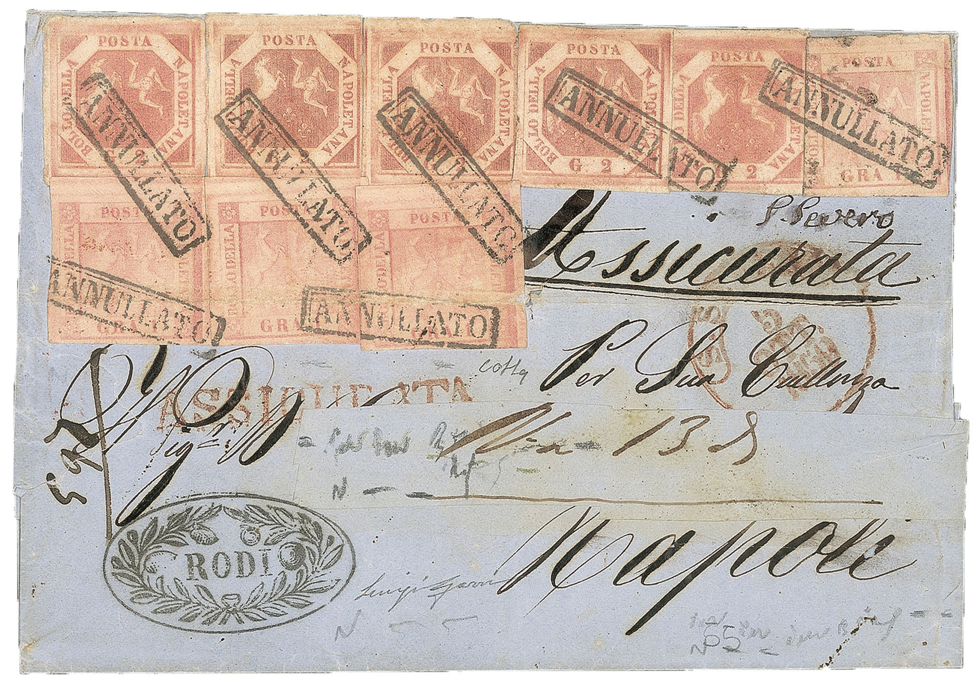 Antichi Stati Italiani - Napoli - Assicurata (3 + 5c cat.25000+)Assicurata da Rodi per Napoli affrancata con quattro esemplari del 1 grano rosa chiaro I tavola + cinque esemplari del 2 grana rosa brunastro I tavola (3 + 5c cat.25000+) - sicuramente la lettera più importante con il raro annullo ovoidale ornato di Rodi - cert. Colla