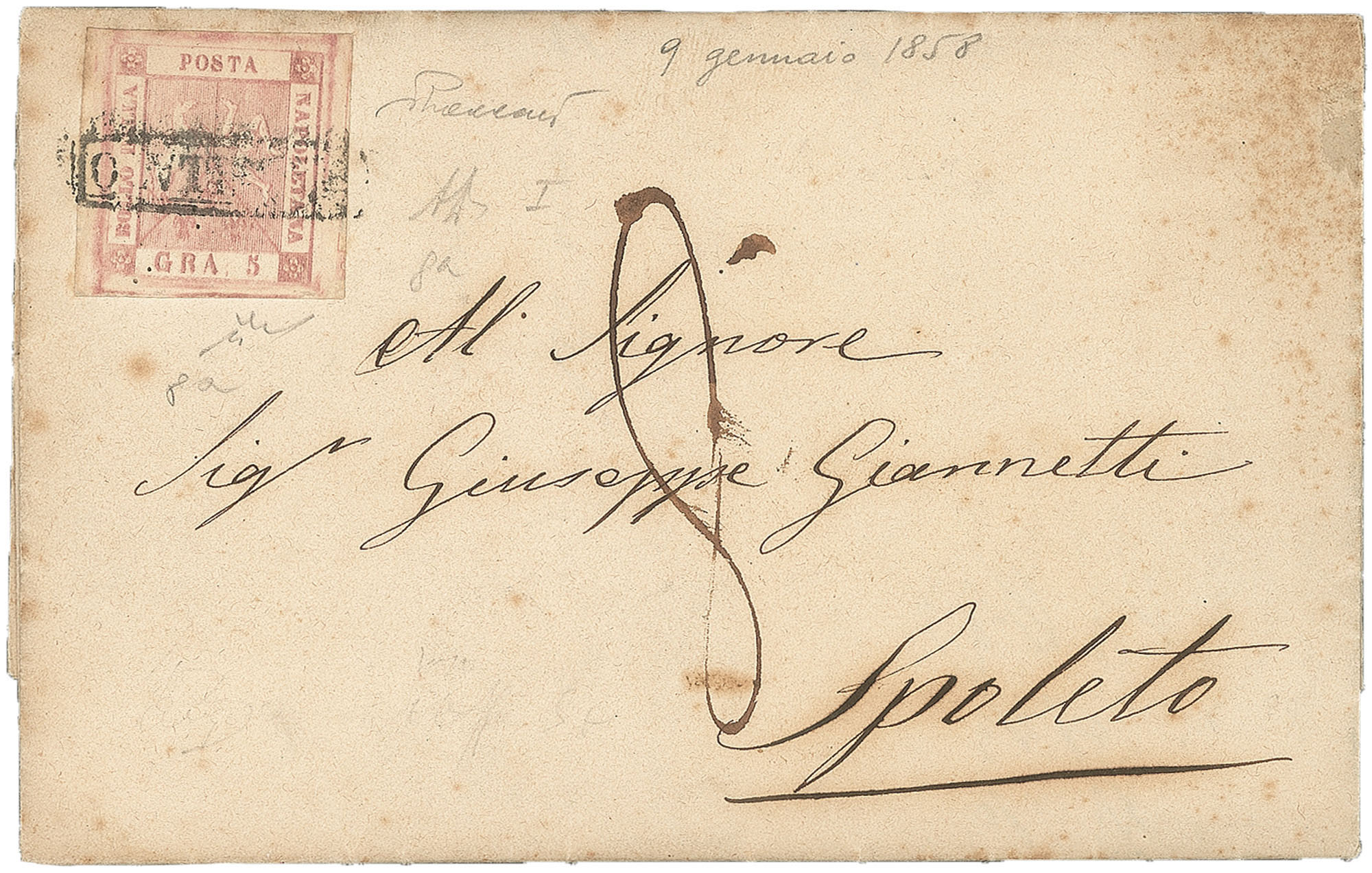 Antichi Stati Italiani - Napoli - Lettera (8a cat. 900)Lettera da Napoli 8 gennaio 1858 per Spoleto con 5 gr. rosa lillaceo 1a Tavola (8a cat. 900) molto ben marginato - tassa pontificia per inoltro a destino - firma AD Chiavarello e Vaccari