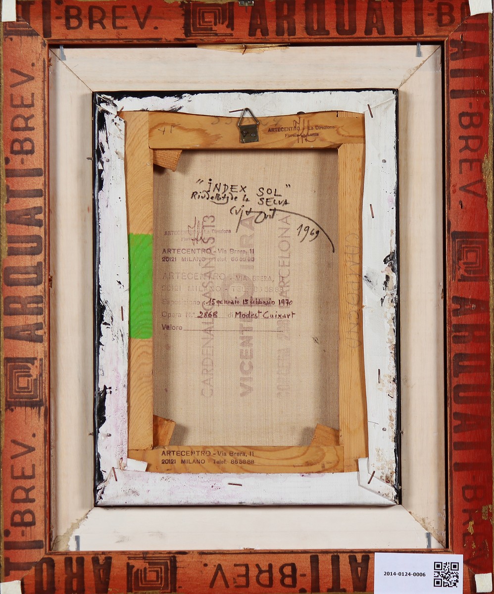 CUIXART MODESTO (1925 - 2007) Index Sol. 1969. Olio su tela . Cm 24,00 x 33,00. Al retro titolo e data 1969 e firma dell'artista, timbro della Galleria Arte Centro di MIlano per esposizione del 1970. Cornice presente