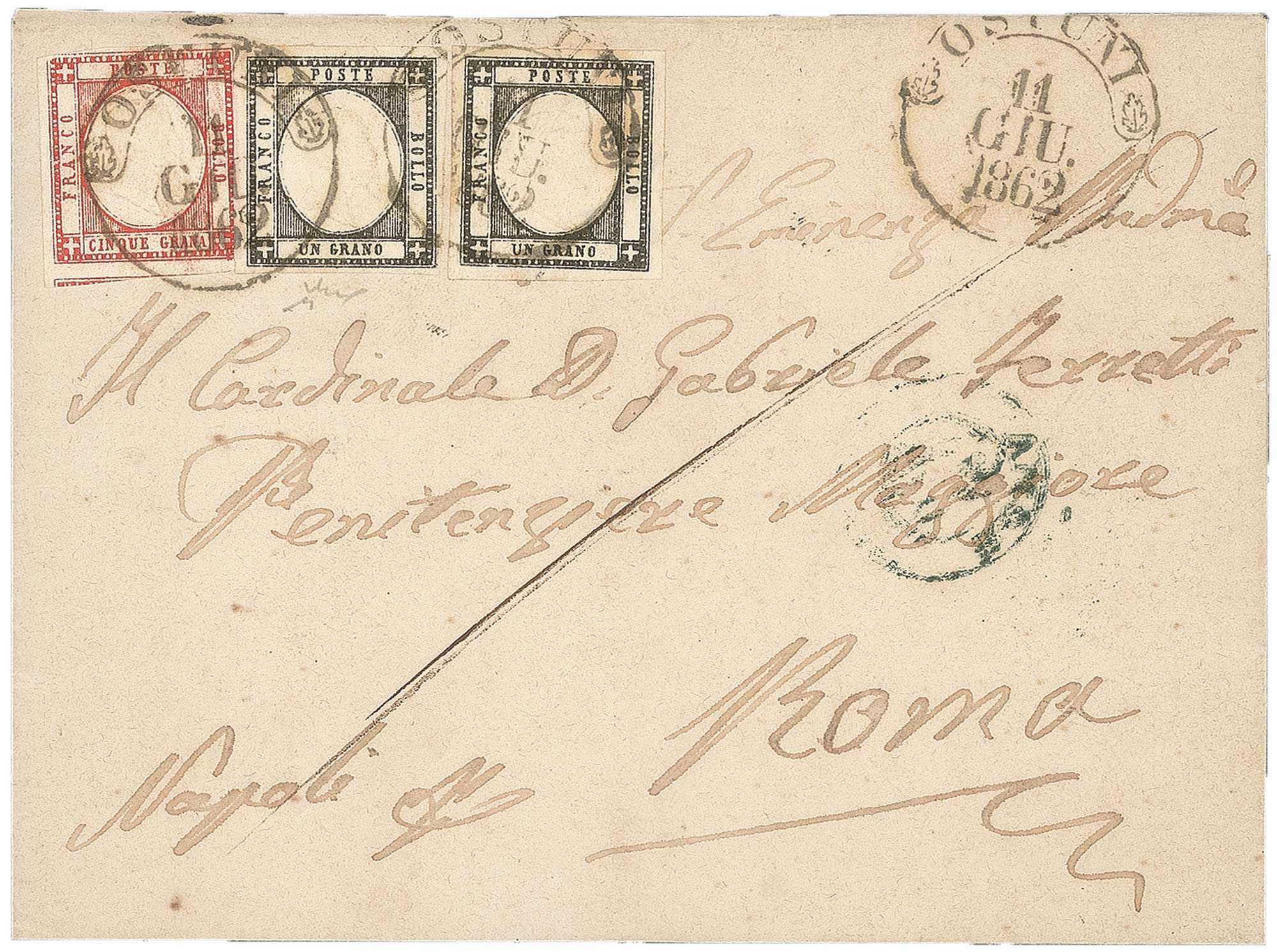 Antichi Stati Italiani - Napoli - Province Napoletane - Lettera (19 + 21 cat.3500)Lettera affrancata con due esemplari del 1 grano nero + 5 grana rosso carminio (19 + 21 cat.3500) esemplari delle ultime tirature con impressione difettosa - da Ostuni 11 GIU.1862 per Roma