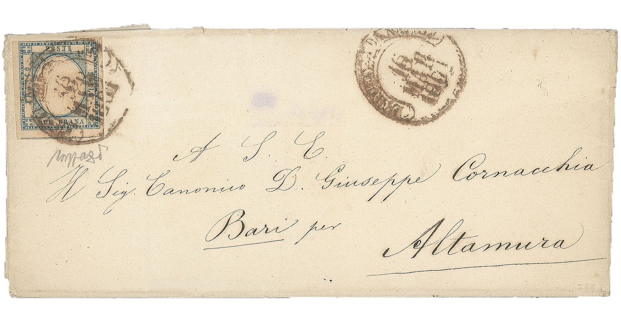 Antichi Stati Italiani - Napoli - Province Napoletane - Lettera con 2 grana azzurroLettera affrancata con 2 grana azzurro da Napoli 16 MAR.1861 per Altamura - ultimo giorno delle province napoletane - interessante e rara - firma Caffaz