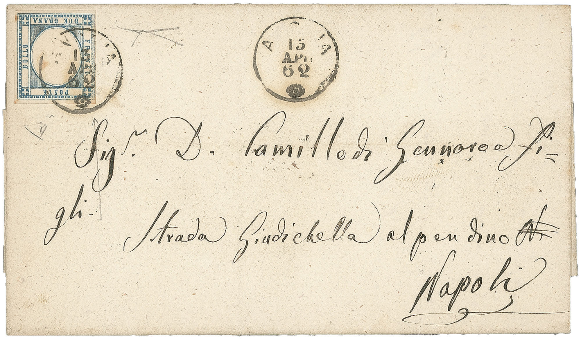 Antichi Stati Italiani - Napoli - Province Napoletane - Lettera (20b)Lettera affrancata con 2 grana azzurro (20b) stampa evanescente a sinistra da Andria 13 APR 62 a Napoli - al verso indicazione manoscritta 'Salvata dall'incendio dei briganti' testimonianza tangibile del fenomeno del brigantaggio che all'epoca affliggeva le province meridionali dell'Italia post-unitaria - cert. Bottacchi