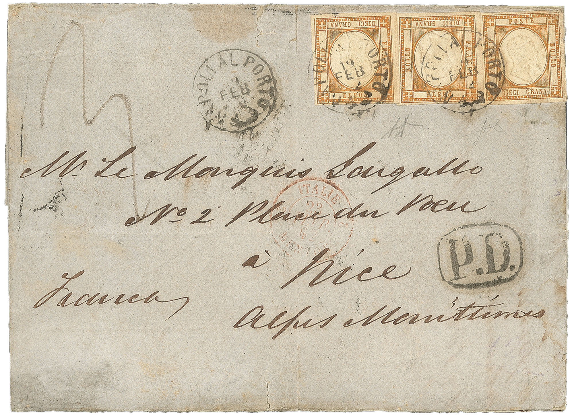 Antichi Stati Italiani - Napoli - Province Napoletane - Lettera (22)Lettera tre porti affrancata con tre esemplari del 10 grana arancio (22) da Napoli al porto 19 FEB 62 per Nizza viaggiata via mare sino a Genova e bollo d'ingresso 'Italie 2 Menton' per il confine di Ventimiglia - non comune affrancatura