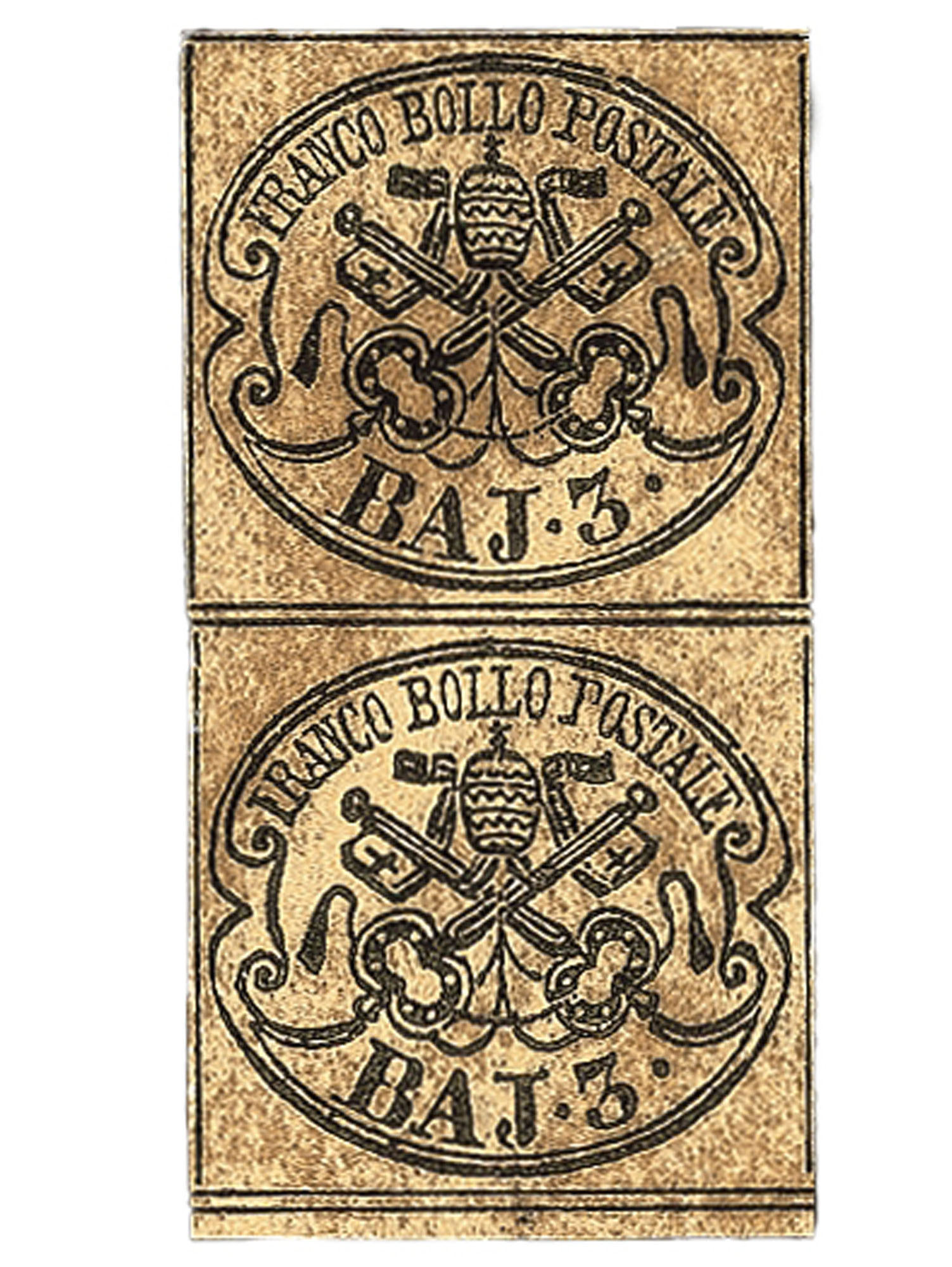 Antichi Stati Italiani - Stato pontificio - 1852 - 3 baj (4Aca)Coppia verticale del 3 baj bruno cuoio chiaro con stampa oleosa (4Aca) - nuovi con gomma integra - grande rarità - cert. Colla