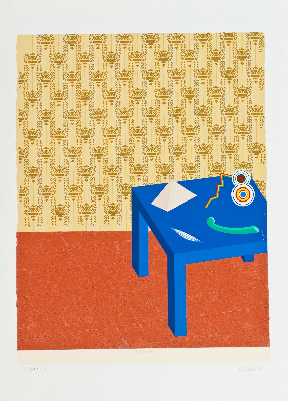 Lucio Del Pezzo (Napoli 1933) CHAMBRE Serigrafia su carta, cm. 76x56, es. XIII/XXV h.c. Firma in basso a destra, tiratura in basso a sinistra. Sul verso: Certificato di Garanzia "Edizioni Bora", Bologna.