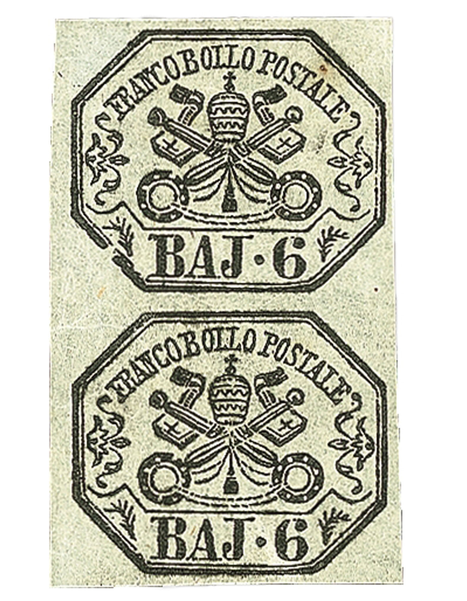 Antichi Stati Italiani - Stato pontificio - 1852 - 6 baj (7 cat.5000)Coppia verticale del 6 baj grigio verdastro (7 cat.5000) - gomma originale - firma AD + cert. Giulio Bolaffi