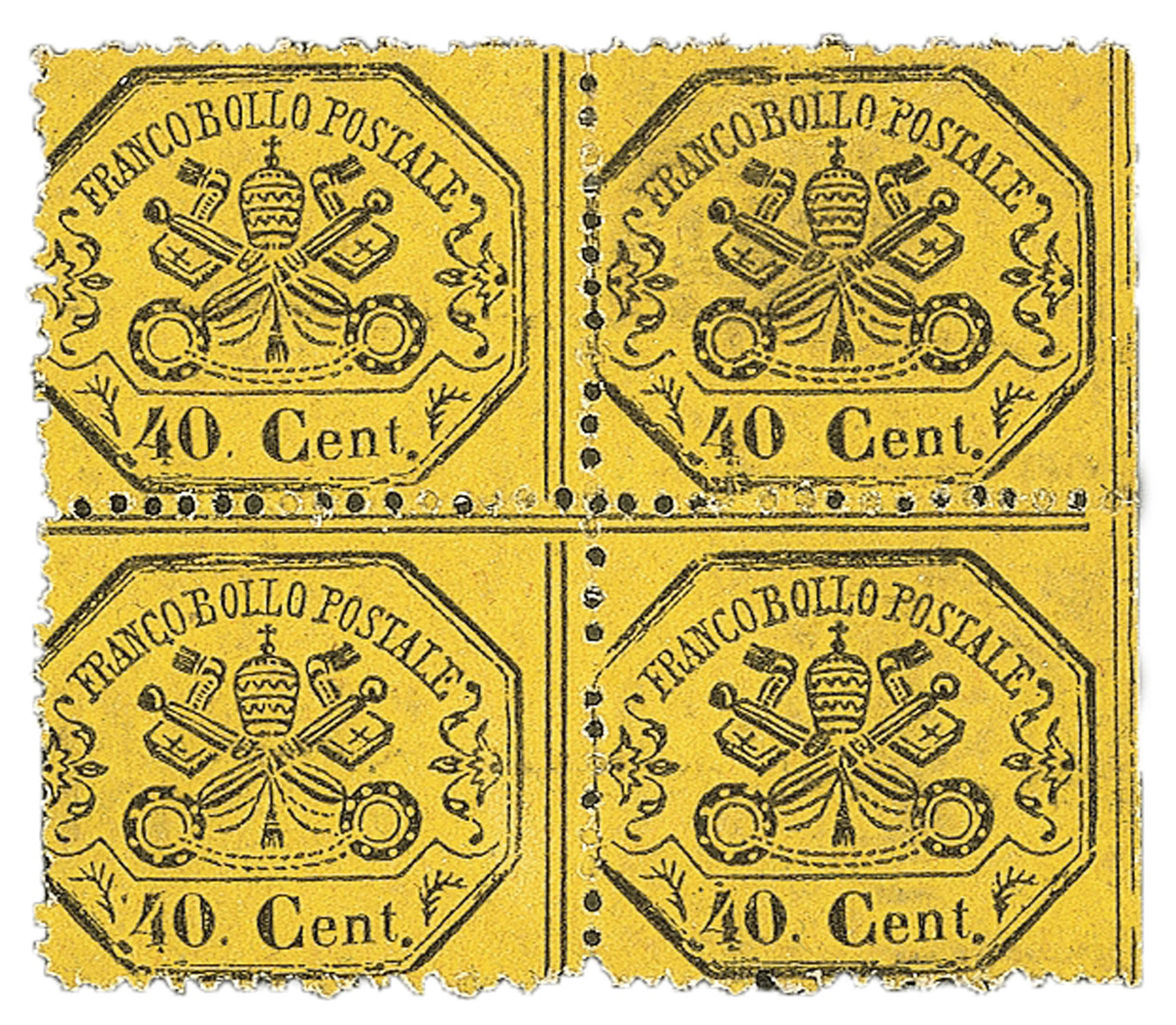 Antichi Stati Italiani - Stato pontificio - 1868 - Quartina del 40 cent (29b + 29n cat.1750++)Quartina del 40 cent giallo (29b + 29n cat.1750++) con il pezzo superiore destro senza punto dopo la cifra - gomma originale per la coppia superiore e integra in quella inferiore - ottimo stato - Cert. Manzoni