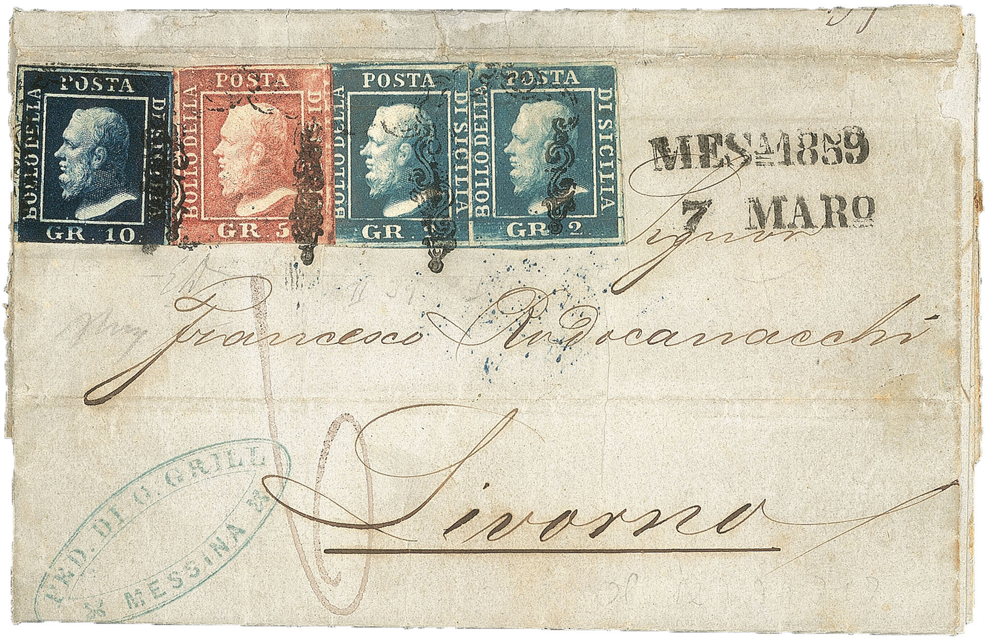 Antichi Stati Italiani - Sicilia - Lettera (6b + 9 + 12)Lettera con affrancatura tricolore composta da due esemplari del 2grana cobalto I tavola carta di Napoli + 5 grana rosa carminio I tavola + 10 grana azzurro cupo (6b + 9 + 12) da Messina 7 MAR del 1859 per Livorno - cert. Bottacchi