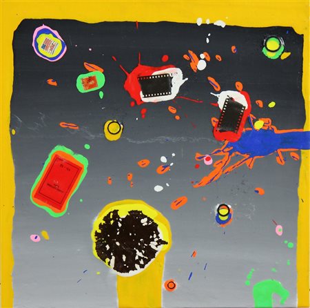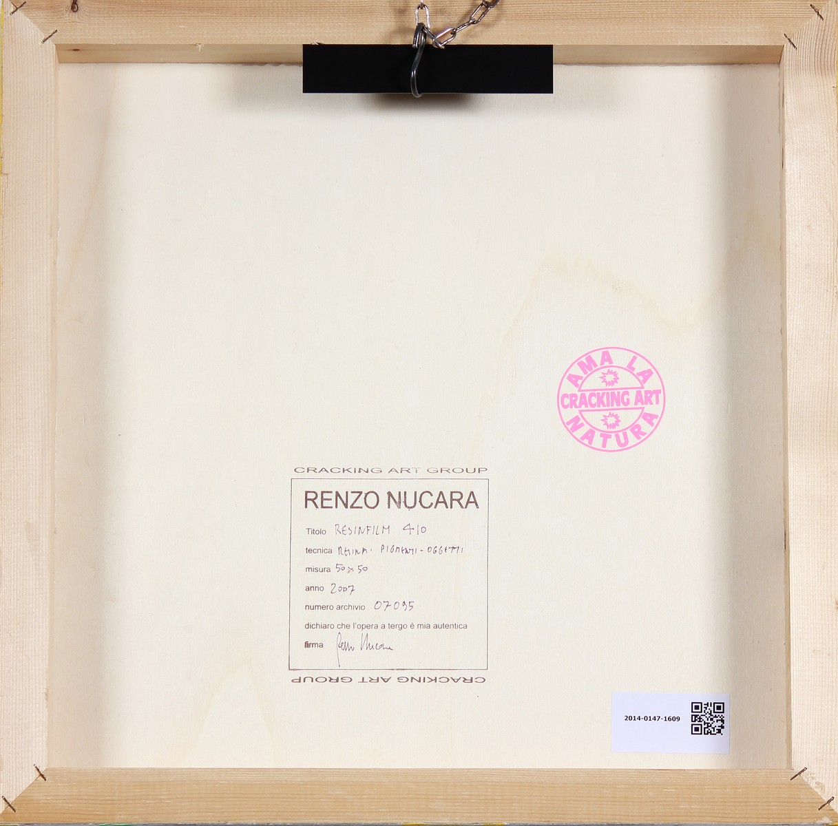 NUCARA RENZO (n. 1955) Resinfilm 410. 2007. Resina, pigmenti, oggetti su tavola. Cm 50,00 x 50,00. Al retro timbro craking art, cartiglio descrittivo Cracking art group, firma per autentica. Autentica dell' artista su fotografia riportante i dati dell' opera e il relativo numero di archivio.