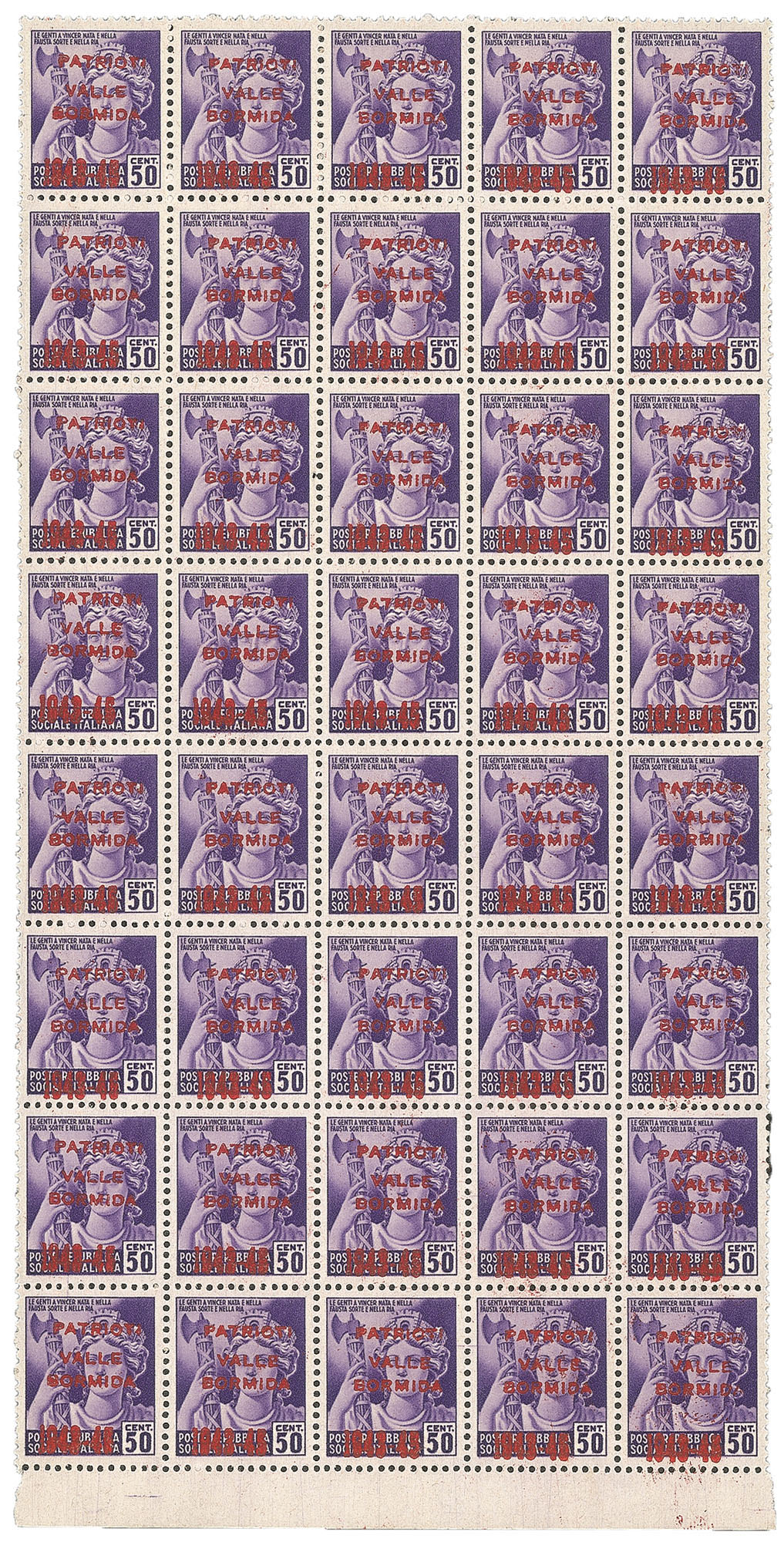 C.L.N. - Valle Bormida - 1945 - 50 cent (5A)50 cent soprastampe in vermiglio (5A) - blocco di 40 (posizioni 11/50) - gomma integra - raro insieme - Cert oro Raybaudi