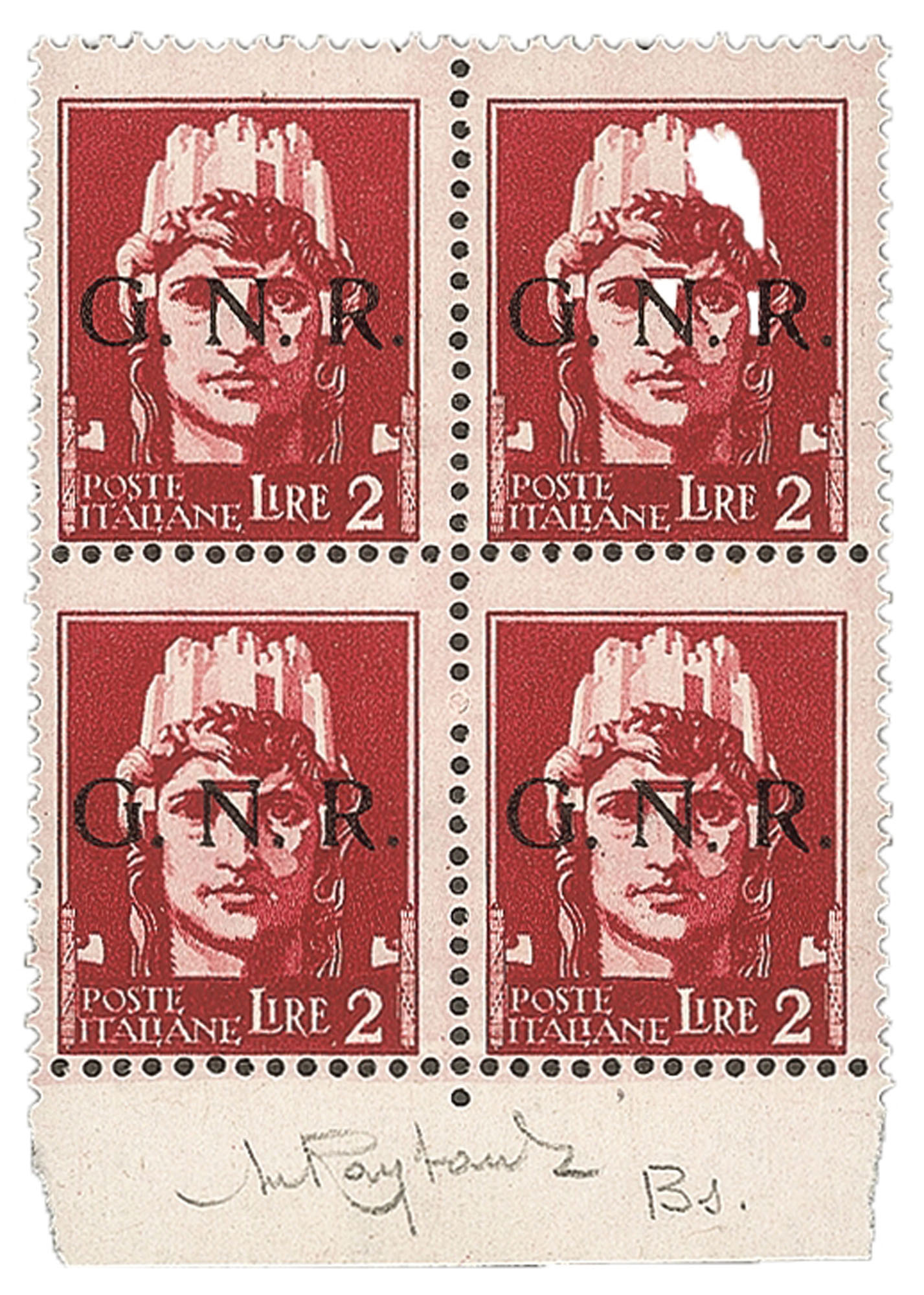 RSI - G.N.R. Brescia - 1943 - 2 lire (482/I - CEI 13/I)2 lire (482/I - CEI 13/I) - quartina bordo foglio (posiz. 98/99) - N punto piccolo (pd - posiz. 99) - gomma integra - Raybaudi