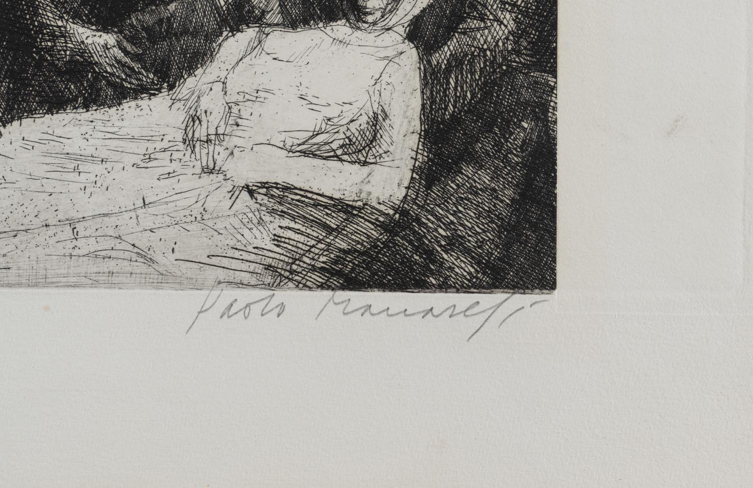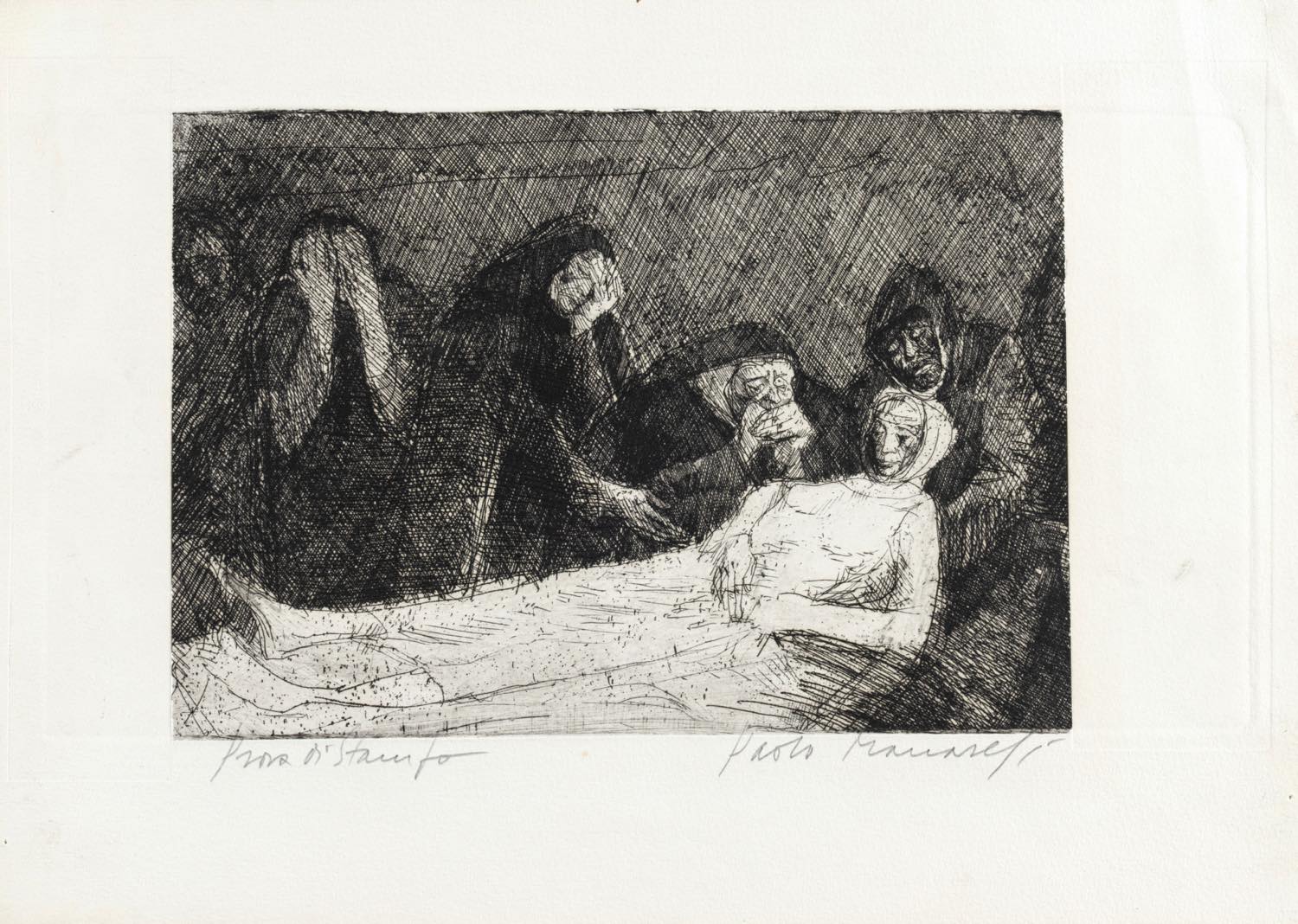 Paolo Manaresi (Bologna 1908 - 1991), "Morte di una suora". Acquaforte su carta, firmata in basso a destra, esemplare in basso a sinistra prova di stampa, Lastra H cm 16.5x24, Foglio H cm 25x35 (lievi difetti) Provenienza: Collezione Privata Zaccardi – Bologna.