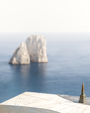 Lo gnomone della meridiana in primo piano, pare dialogare con i Faraglioni, simbolo senza tempo dell'isola di Capri.
