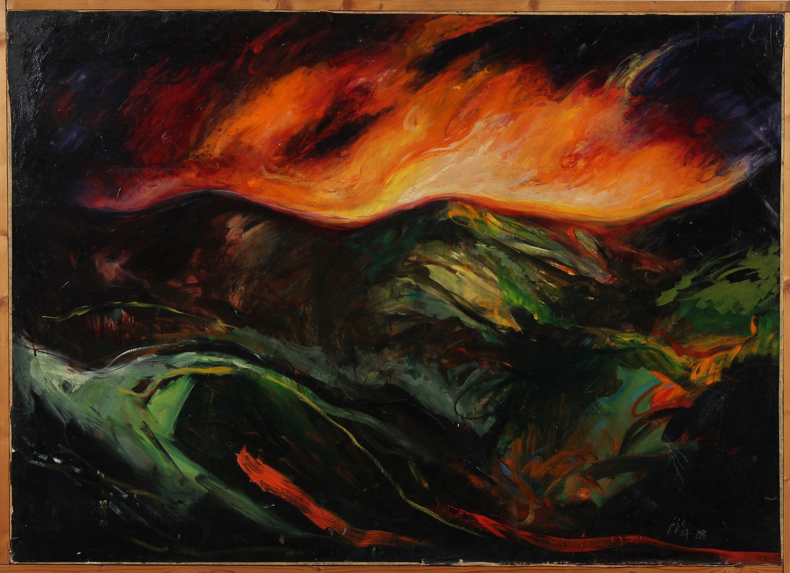 SESIA GIANNI (n. 1934) Paesaggio. 1986. Acrilico su carta incollata su tela. Cm 140,00 x 100,00. Firma e anno in basso a destra. Cornice presente