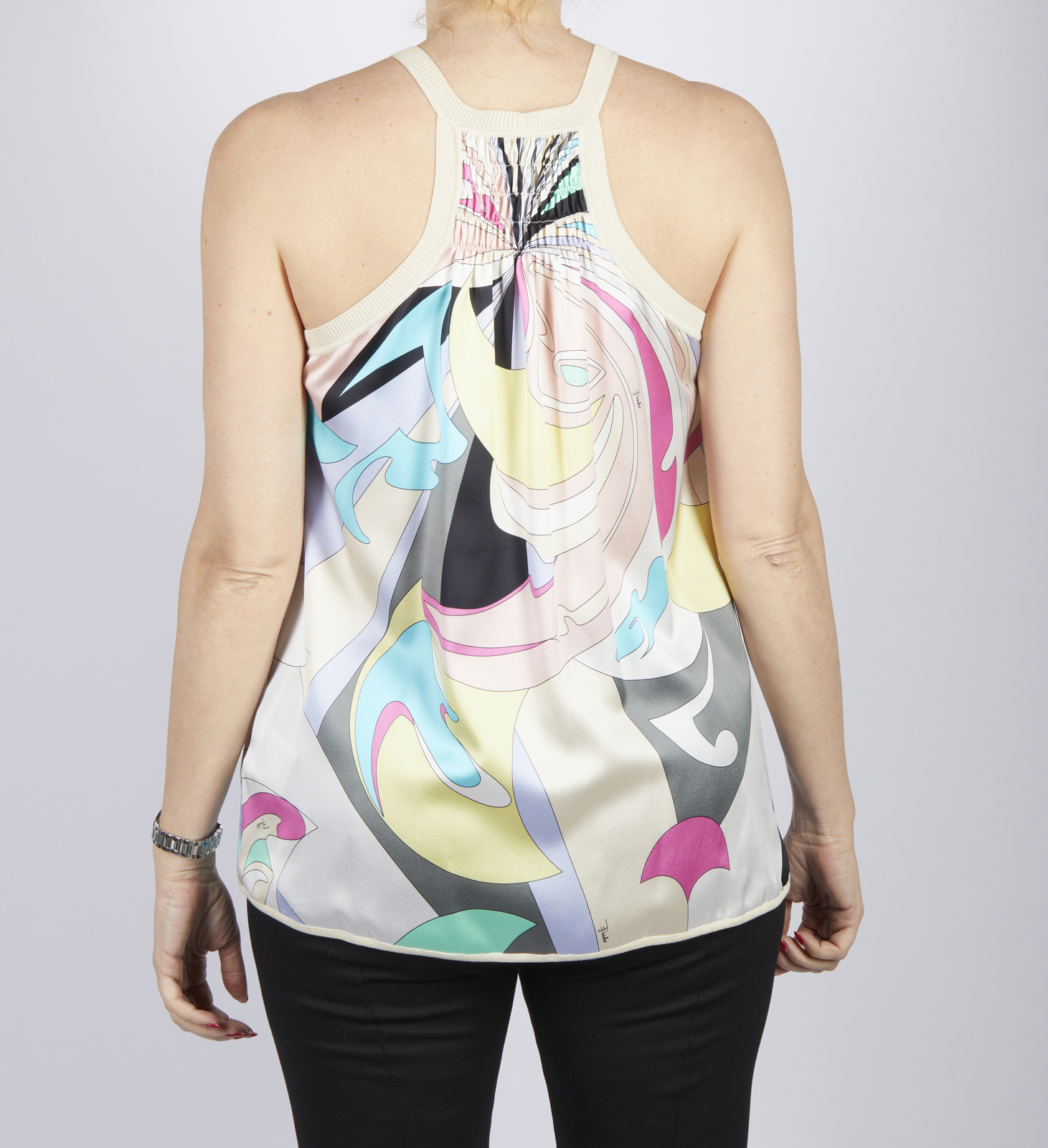 PUCCI Maglia multicolore. . . Maglia multicolore senza maniche, su fondo bianco. Scollo all'americana con bordo in tessuto colo panna. Dettagli di arriccio del tessuto sulla schiena. Composizione: 94% seta, 6% cotone. Taglia 42 I, 38 F, 8 USA