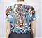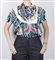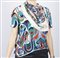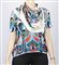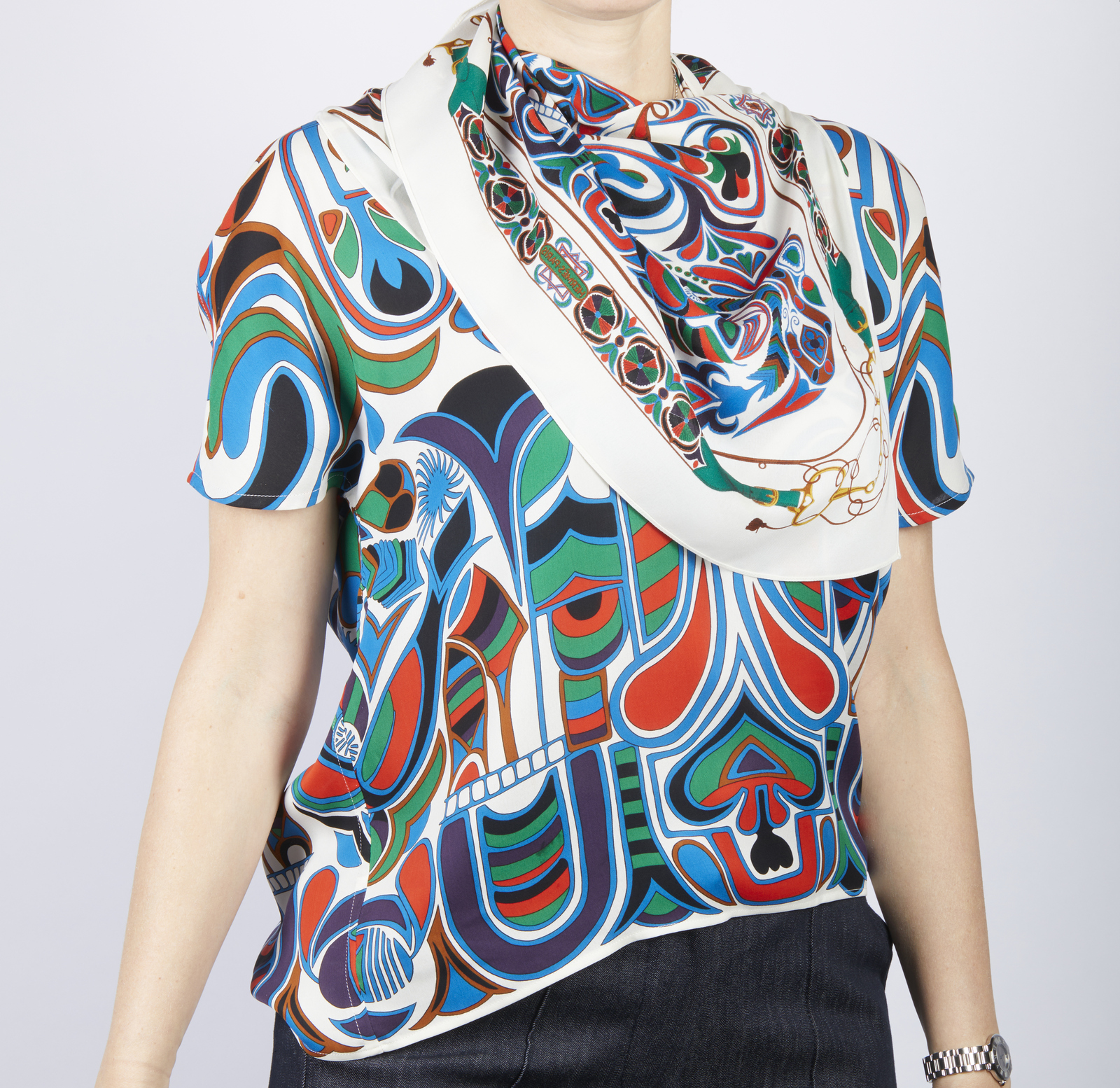 HERMES Maglia con collo a foulard. . . Maglia con collo a foulard su fondo bianco con decori di colore nero, rosso, blu, marrone e verde. Motivi geometrici e concentrici.