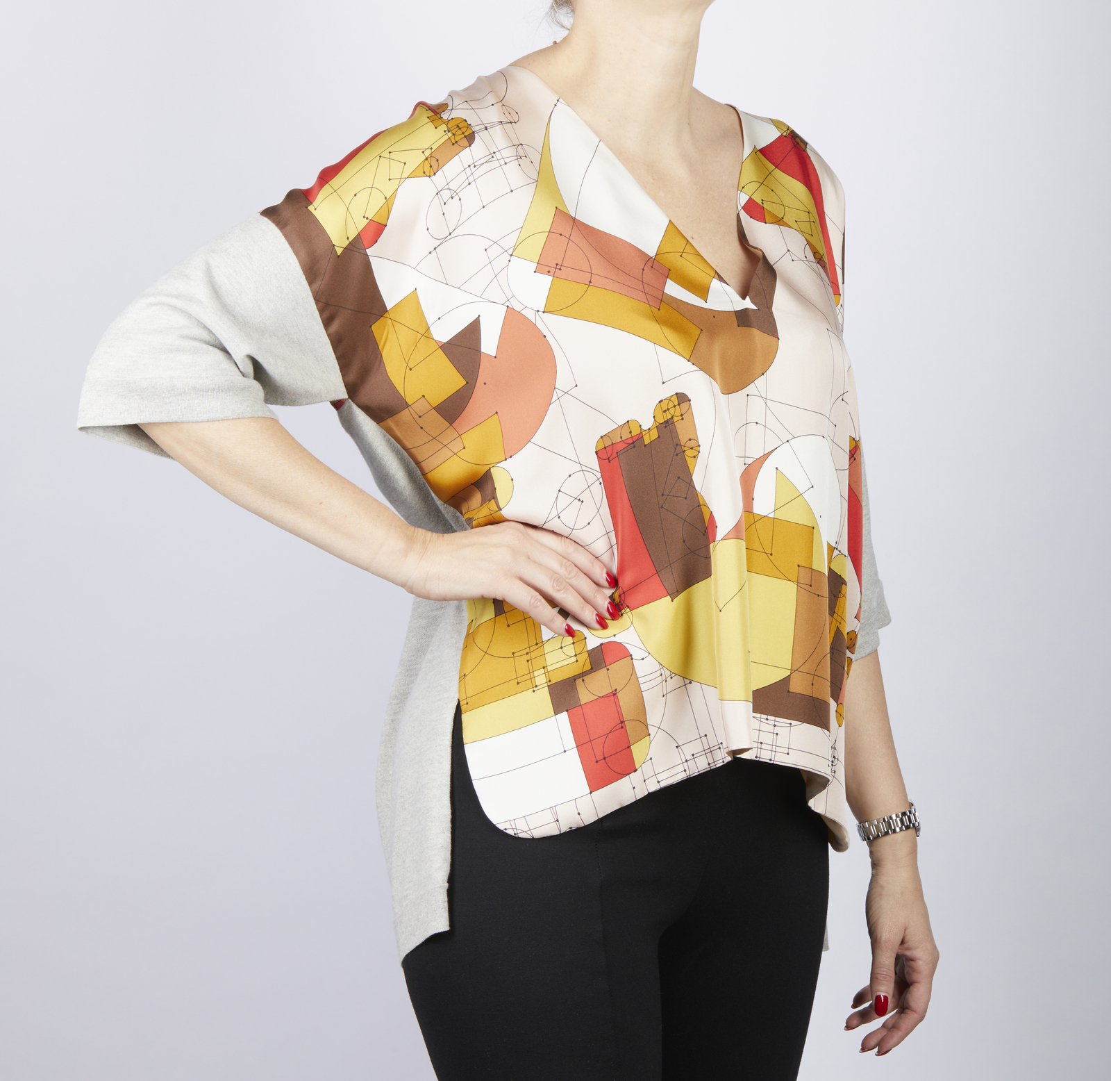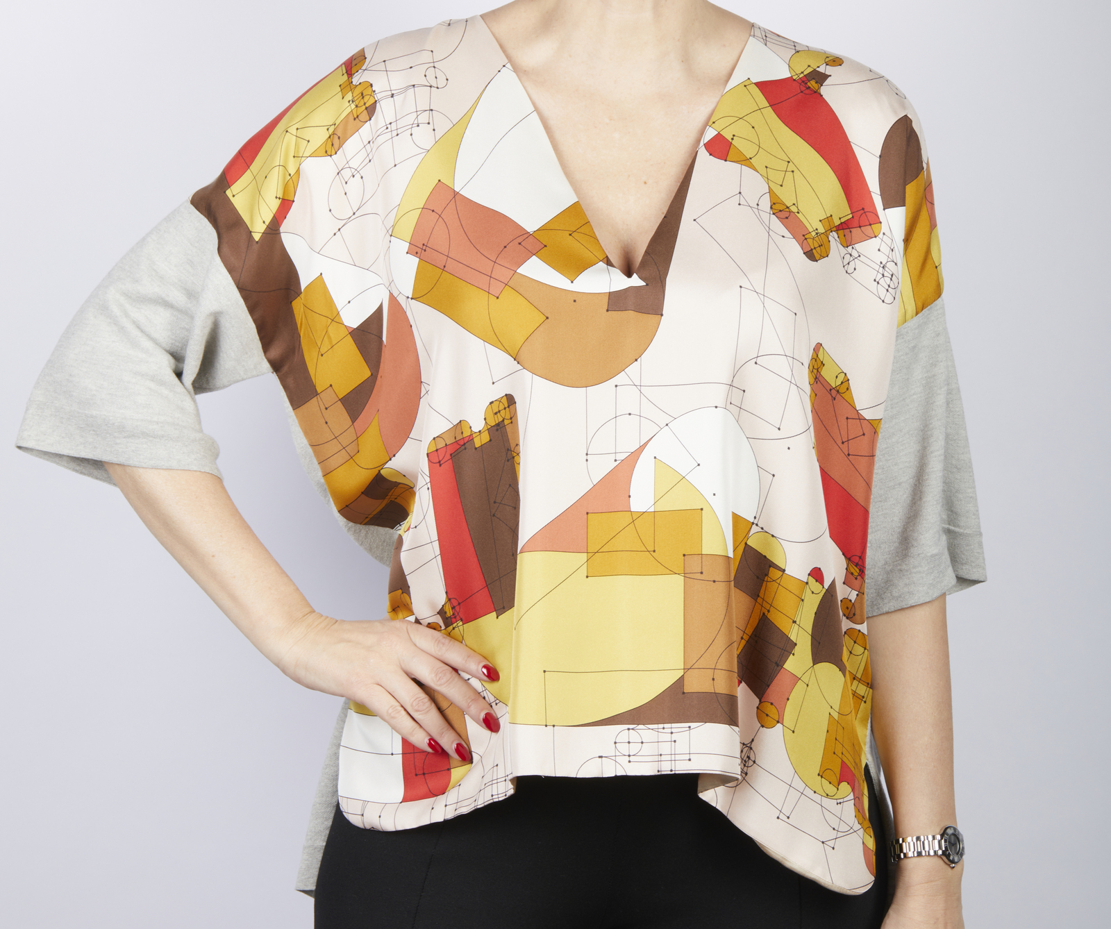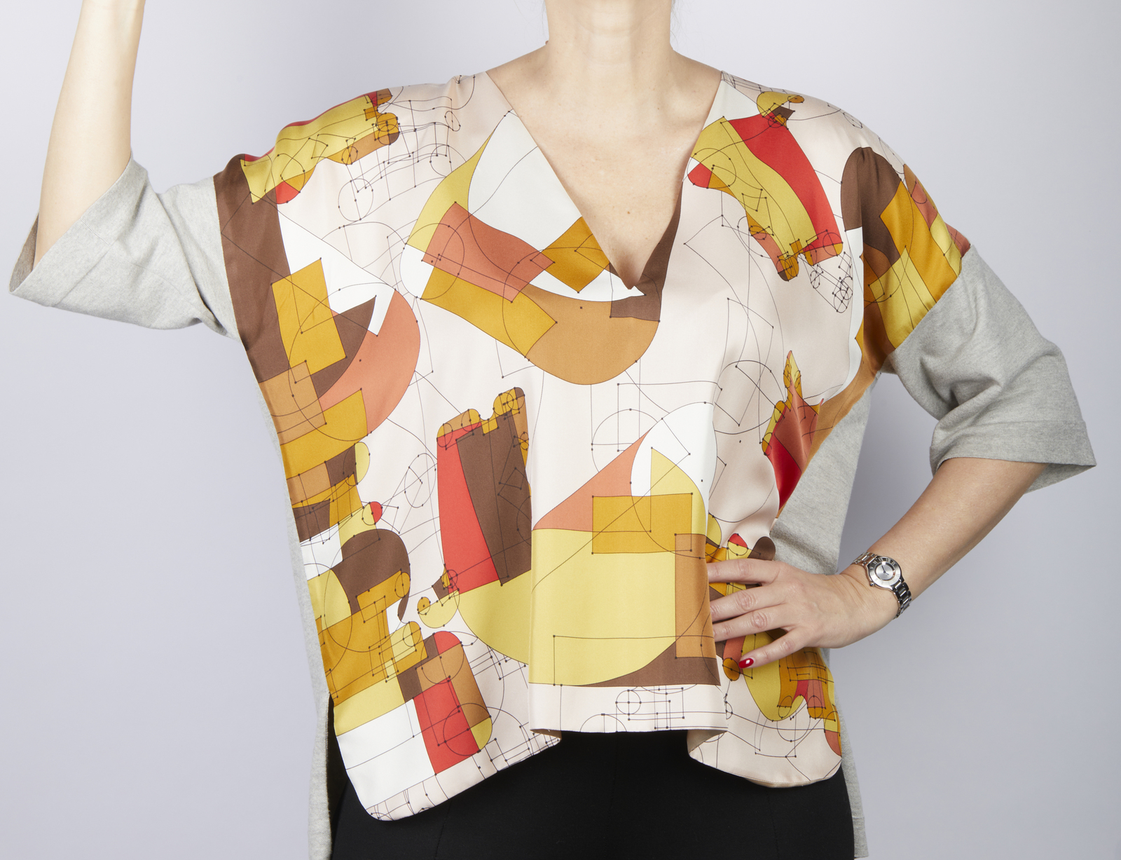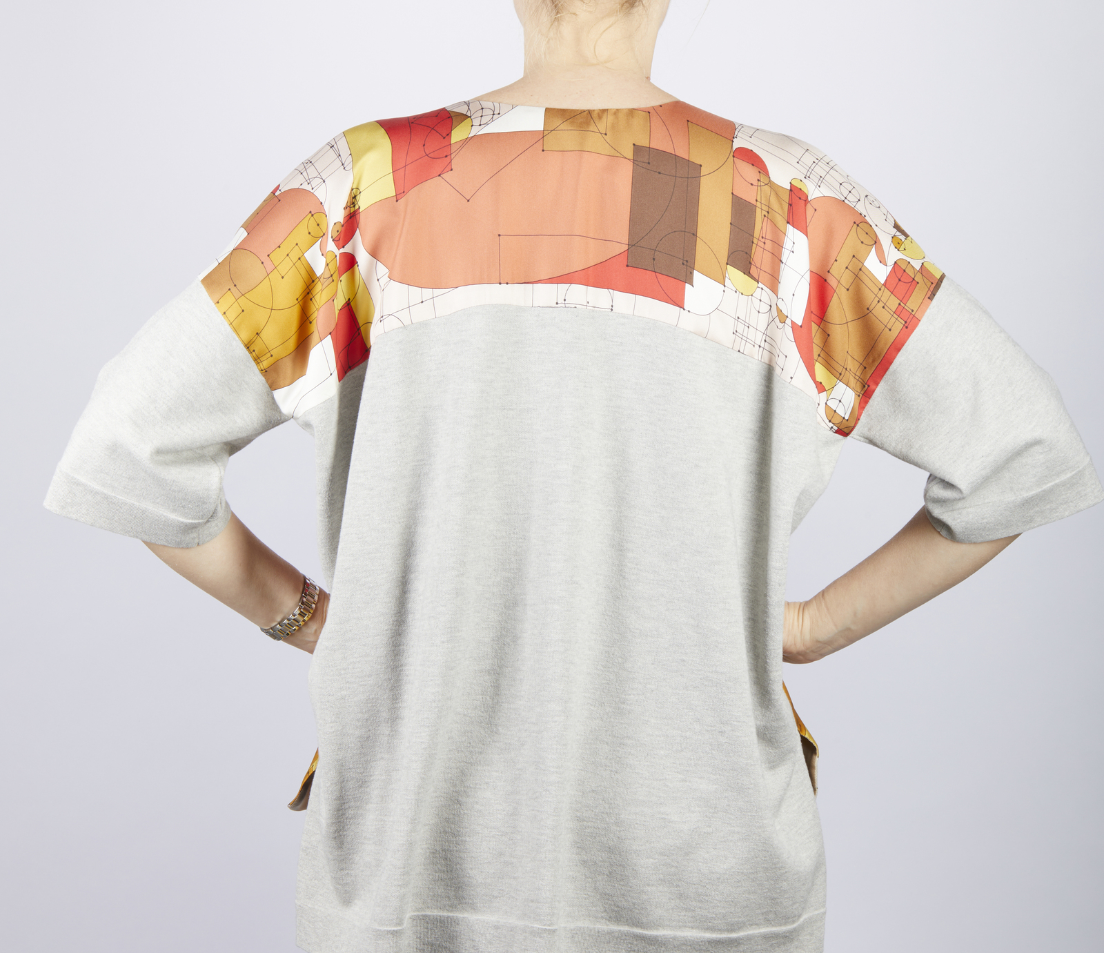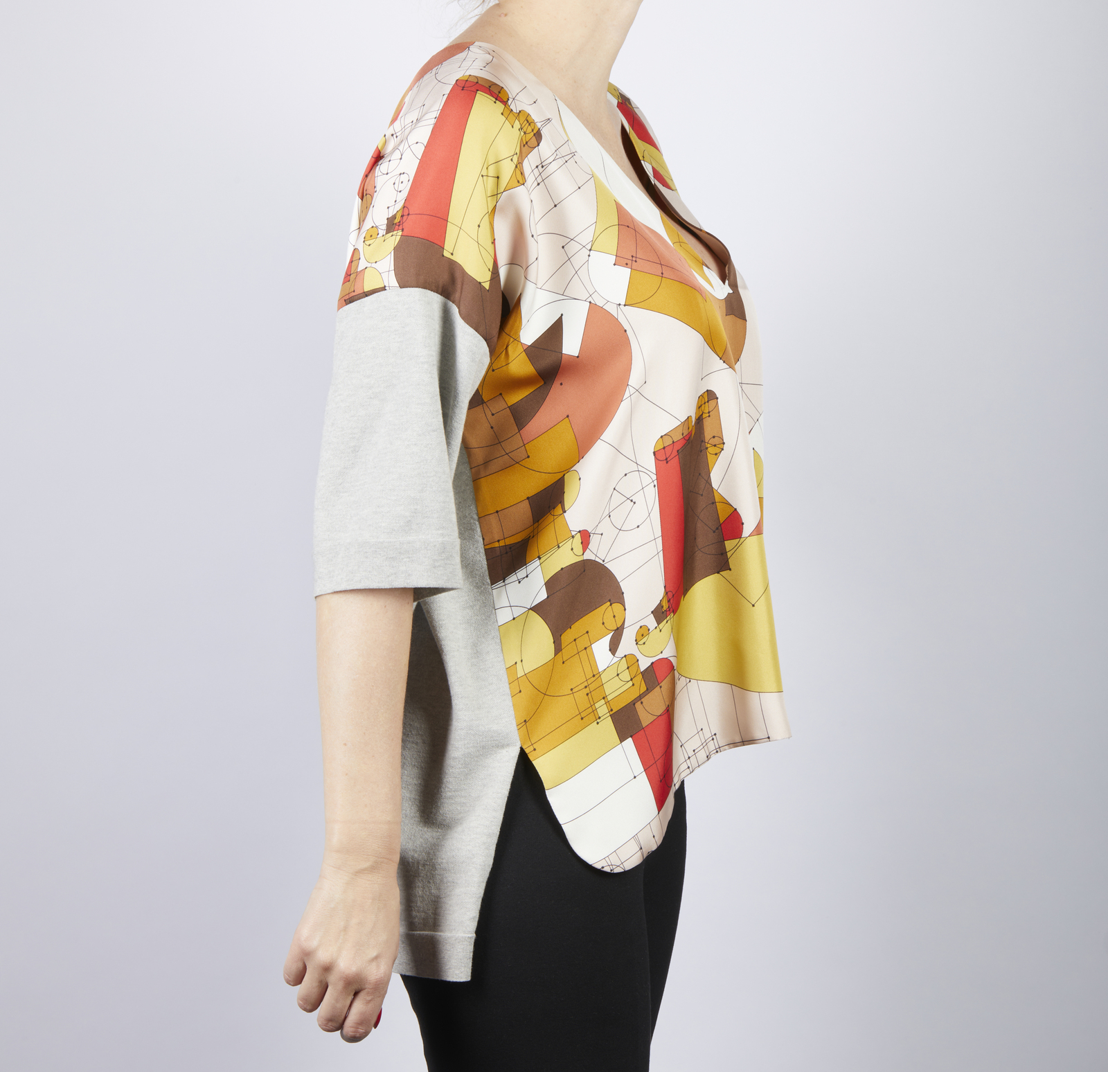 HERMES Maglia Hermes. . . Maglia in tessuto con motivo geometrici di colore rosso, giallo e marrone su fondo cipria. La maglia ha le maniche corte, scollo a V. Parte della maglia è in seta e parte è in cotone. Taglia 36: lunghezza 60 cm; vita 64 cm;