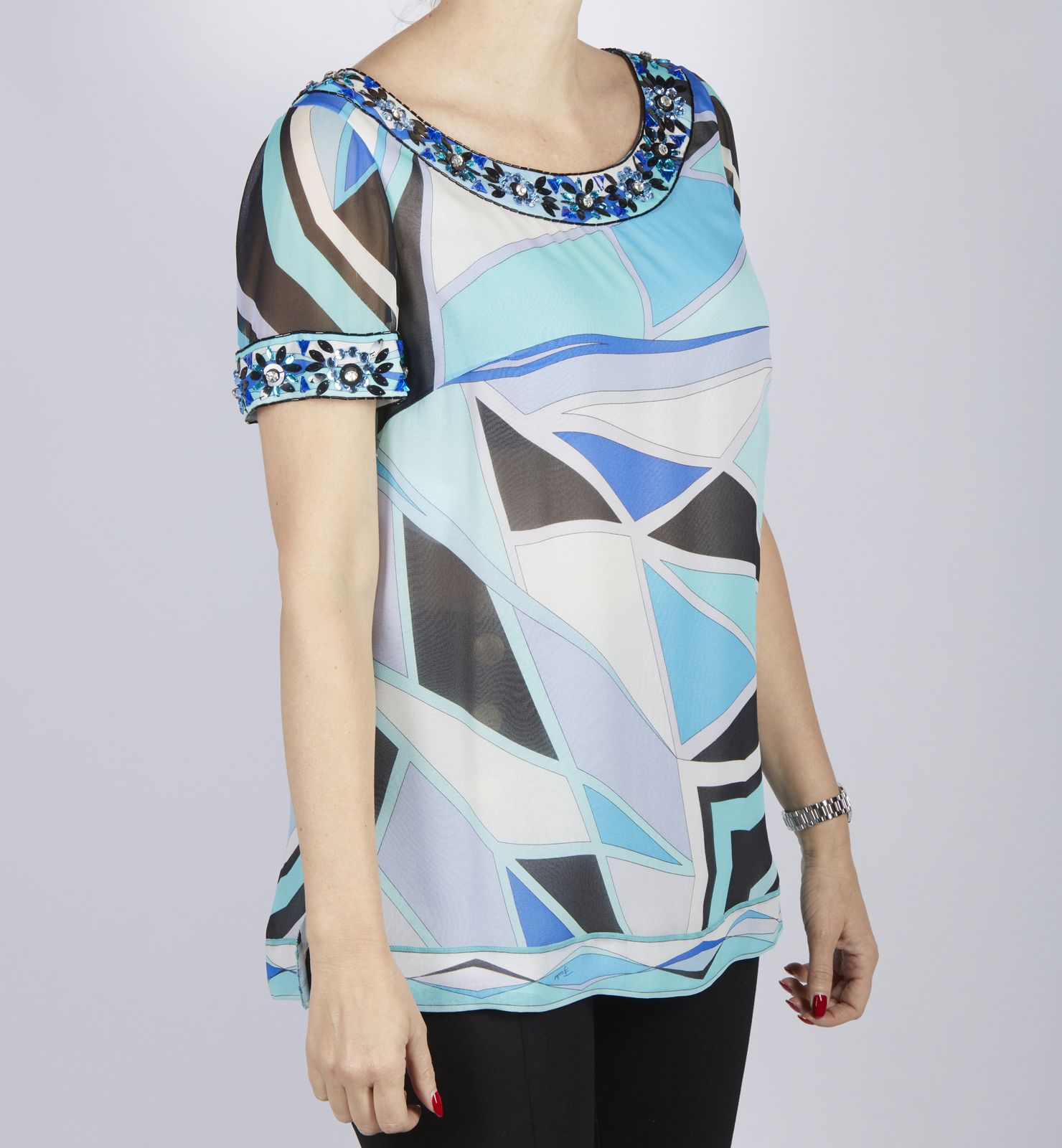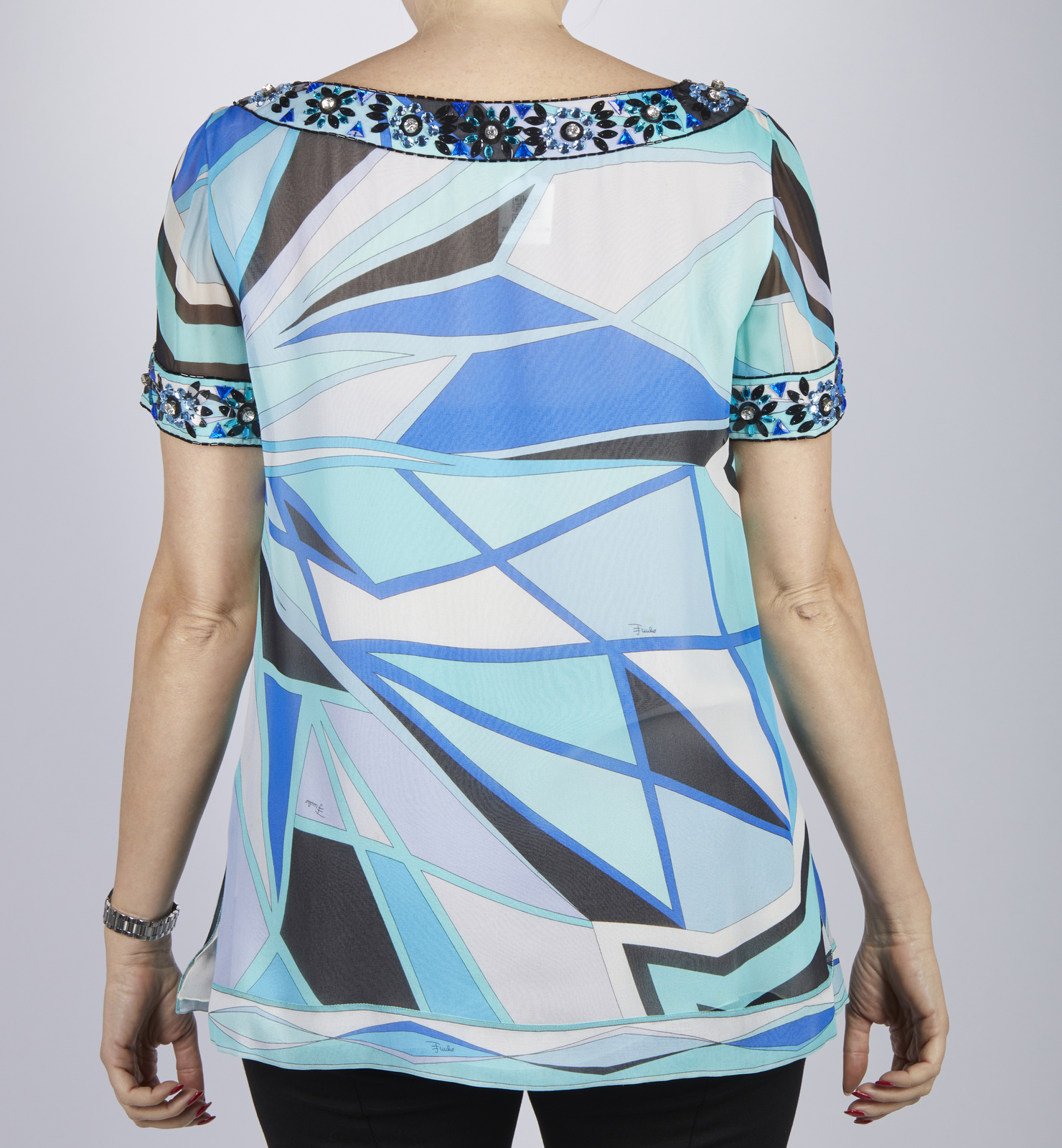 PUCCI EMILIO Caftano con applicazioni. . . Caftano con applicazioni colorate a forma di fiore che bordano maniche e collo. Maniche corte. Toni del azzurro, celeste e nero. Composizione: 100% seta. Taglia 44 I, 40 F, 12 UK