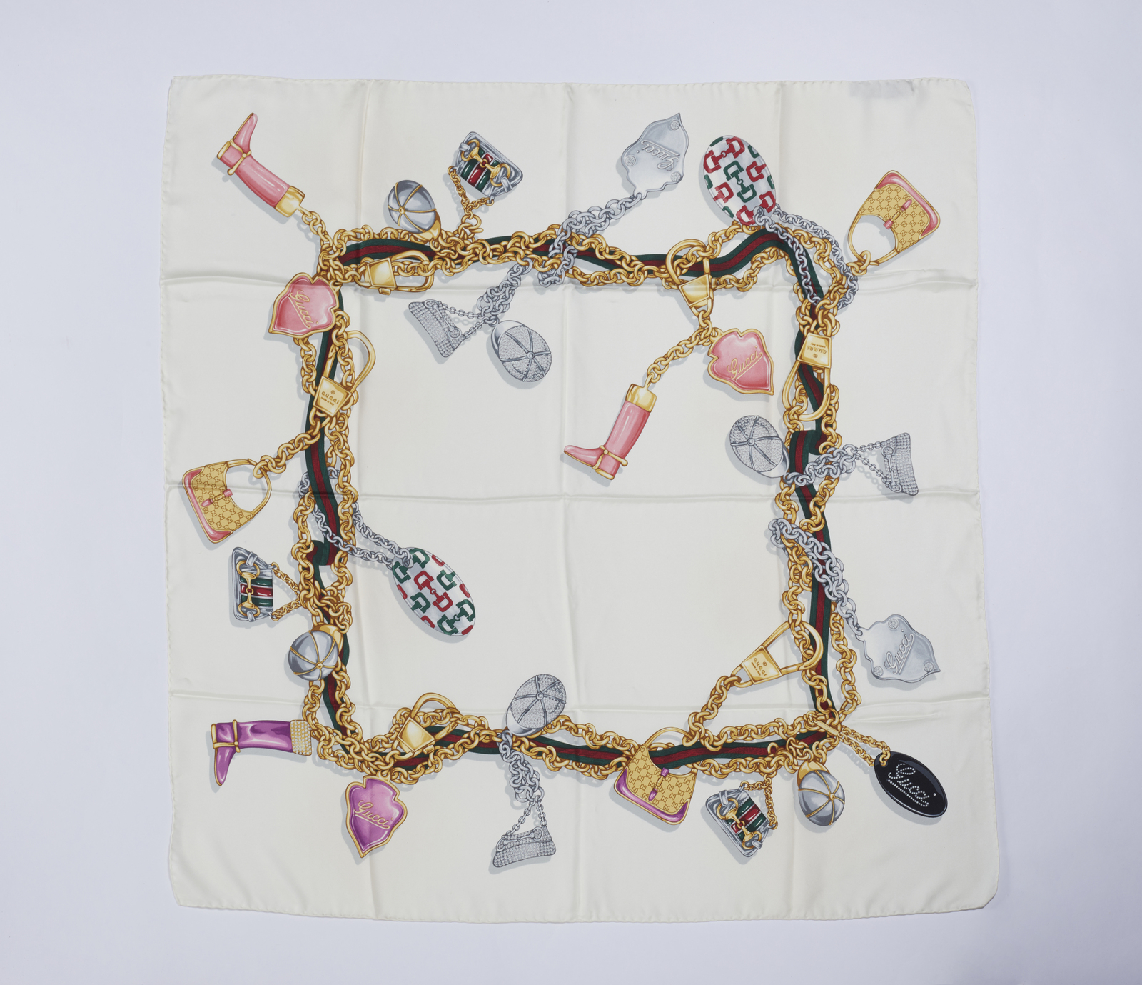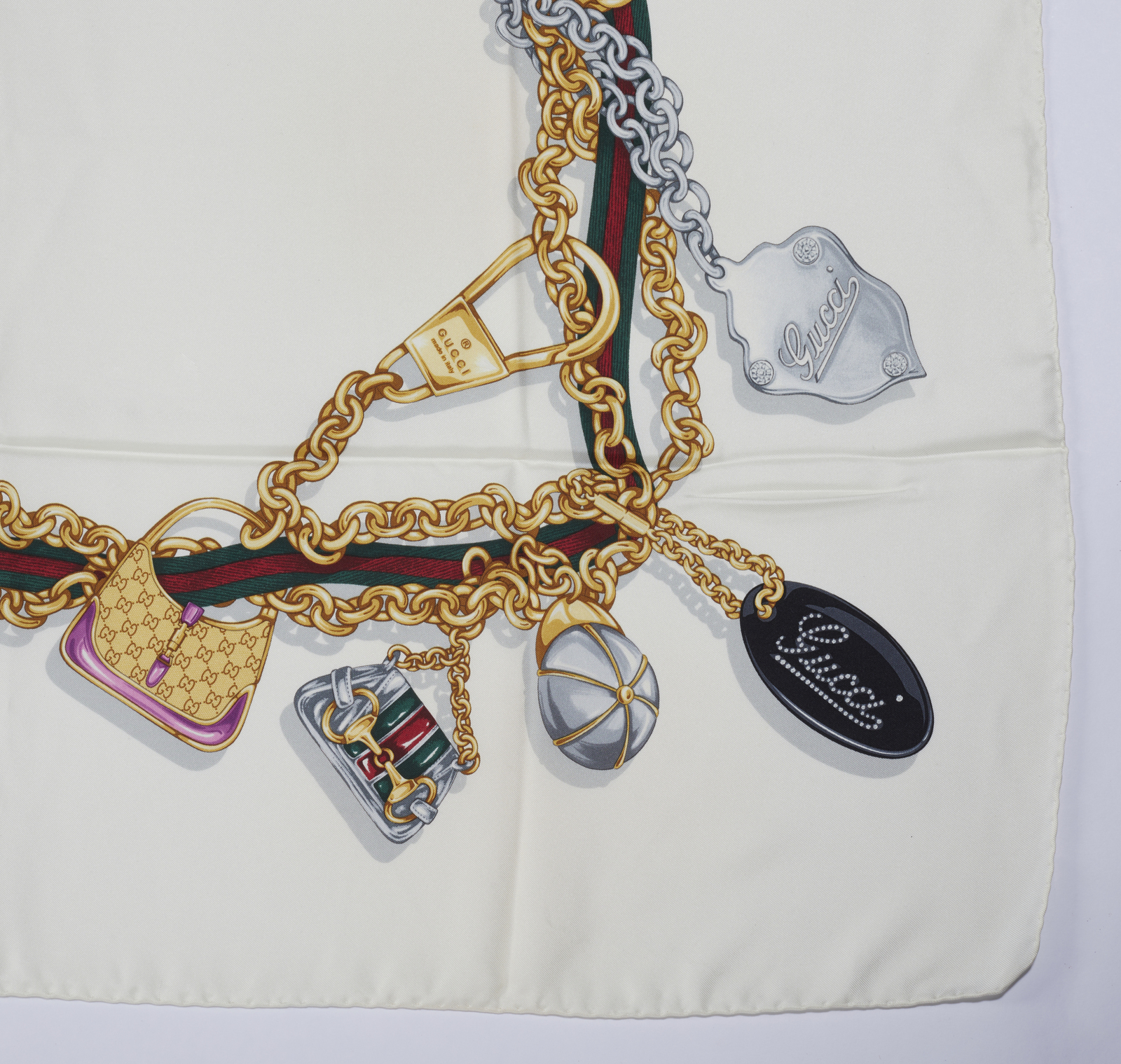 GUCCI Foulard con charmes su fondo bianco. Seta. Cm 90,00 x 90,00. Foulard con disegni charms su fondo bianco. Sono rappresentati i simboli iconici della maison che si sviluppano su un nastro verde e rosso, colore caratteristico della maison Gucci. Etichetta con logo presente.