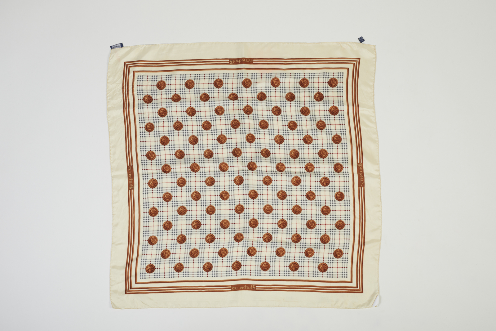 BURBERRY Foulard stampato. Seta. . Foulard Burberry a fantasia check nei toni del beige e motivi a bottoni con logo giallo oro, firma Burberry ai quattro angoli, etichetta Burberry presente.