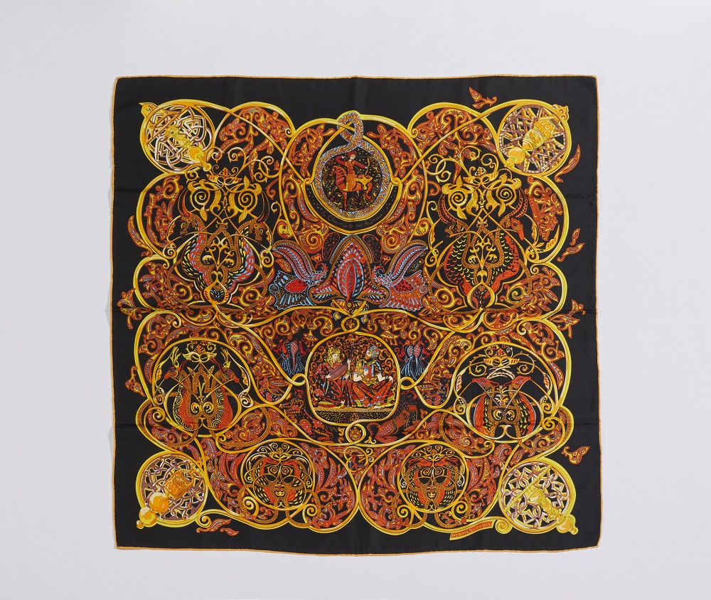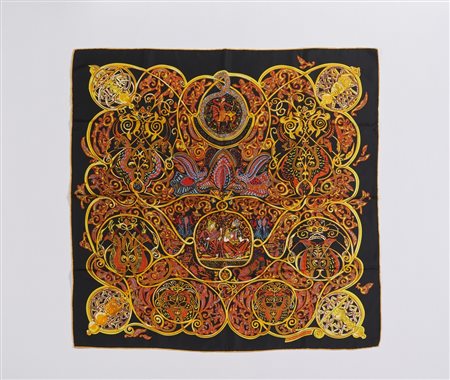 HERMES Foulard "Les Charmante aux animaux". Seta. Cm 90,00 x 90,00. Il foulard Hermes La Charente aux Animals raffigura l'incantatore di animali di uno dei racconti di Scheherazade “Le notti arabe”. Squisita colorazione Hermes su fondo nero e con orli a contrasto dorati. Disegnato da Annie Faivre nel 2009.