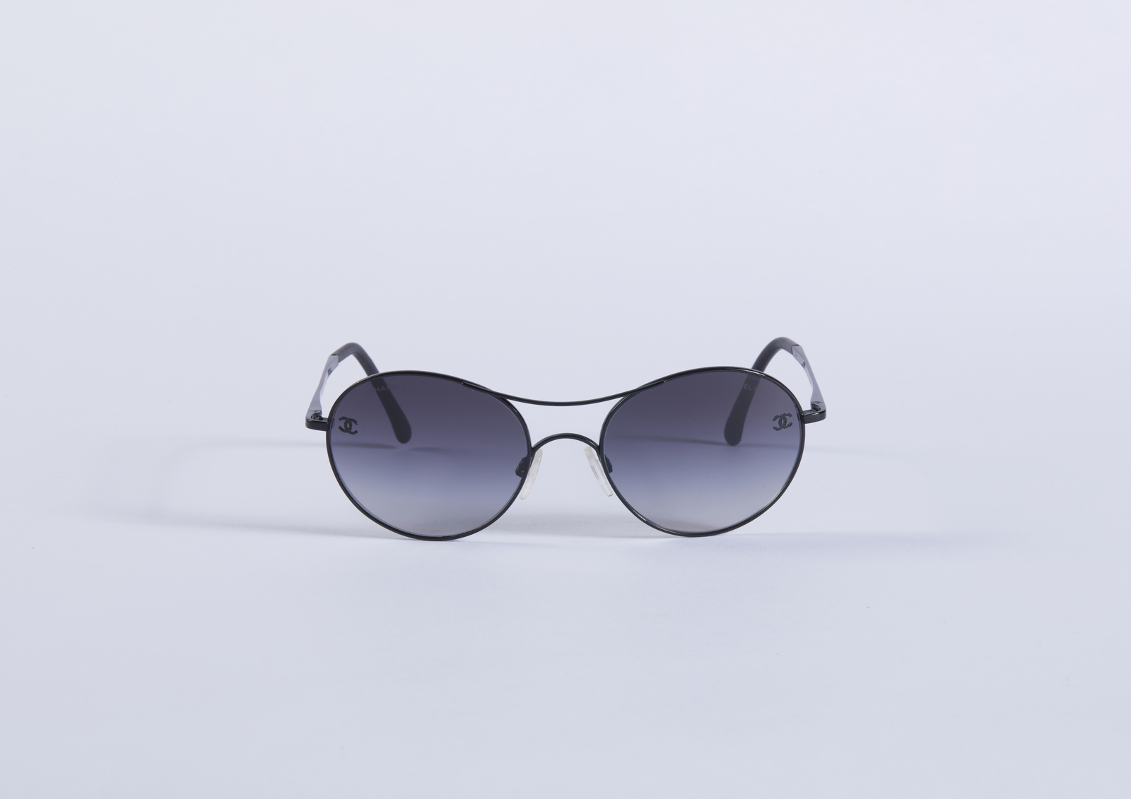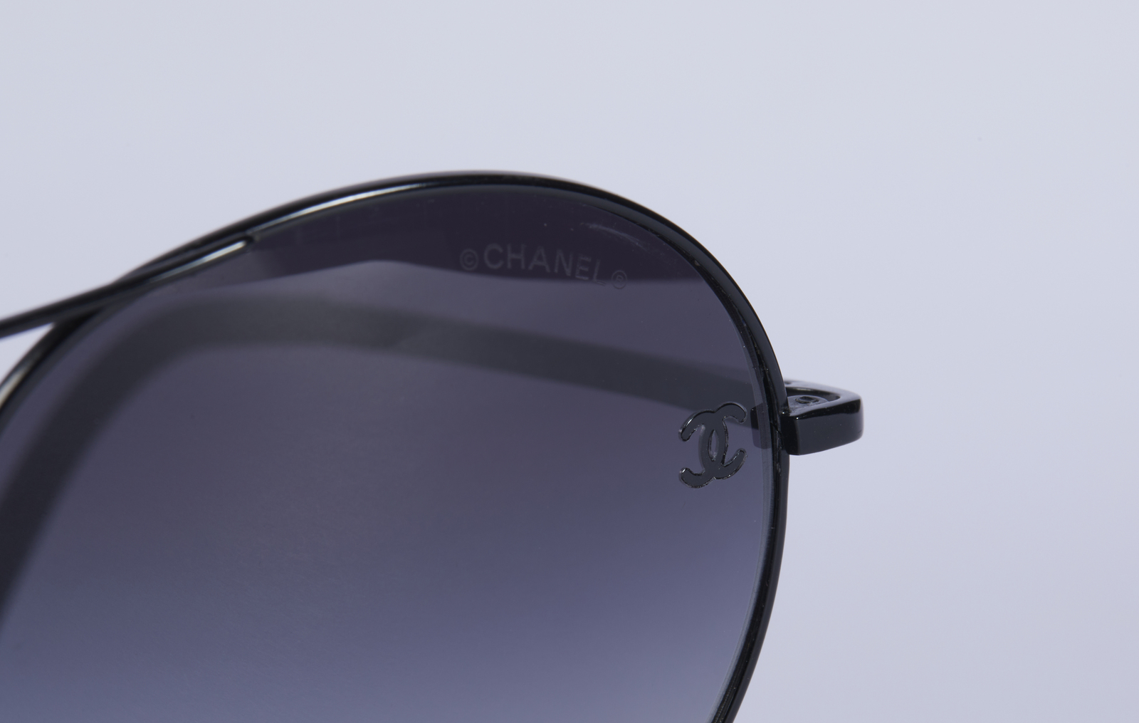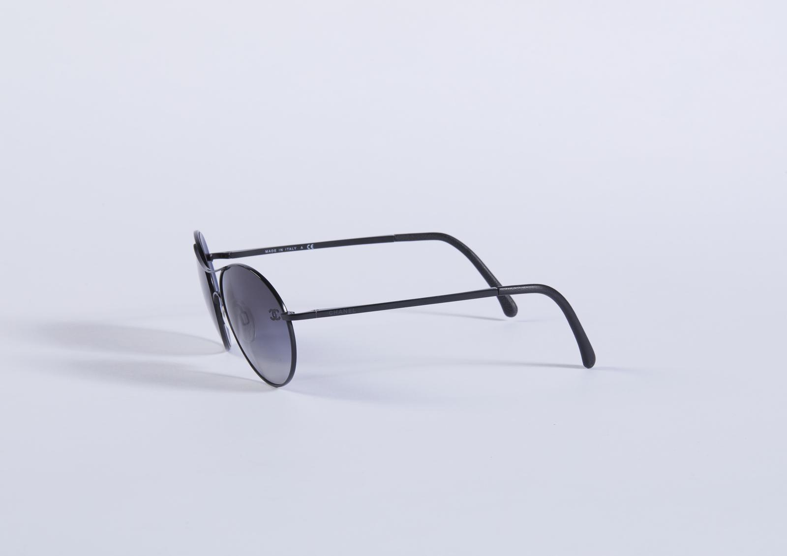 CHANEL Occhiali da sole. . . Occhiali da sole con montatura sottile in metallo e lenti nere. Logo impresso sulla lente e sull'asta.