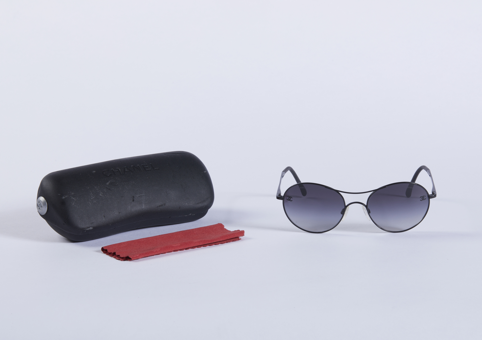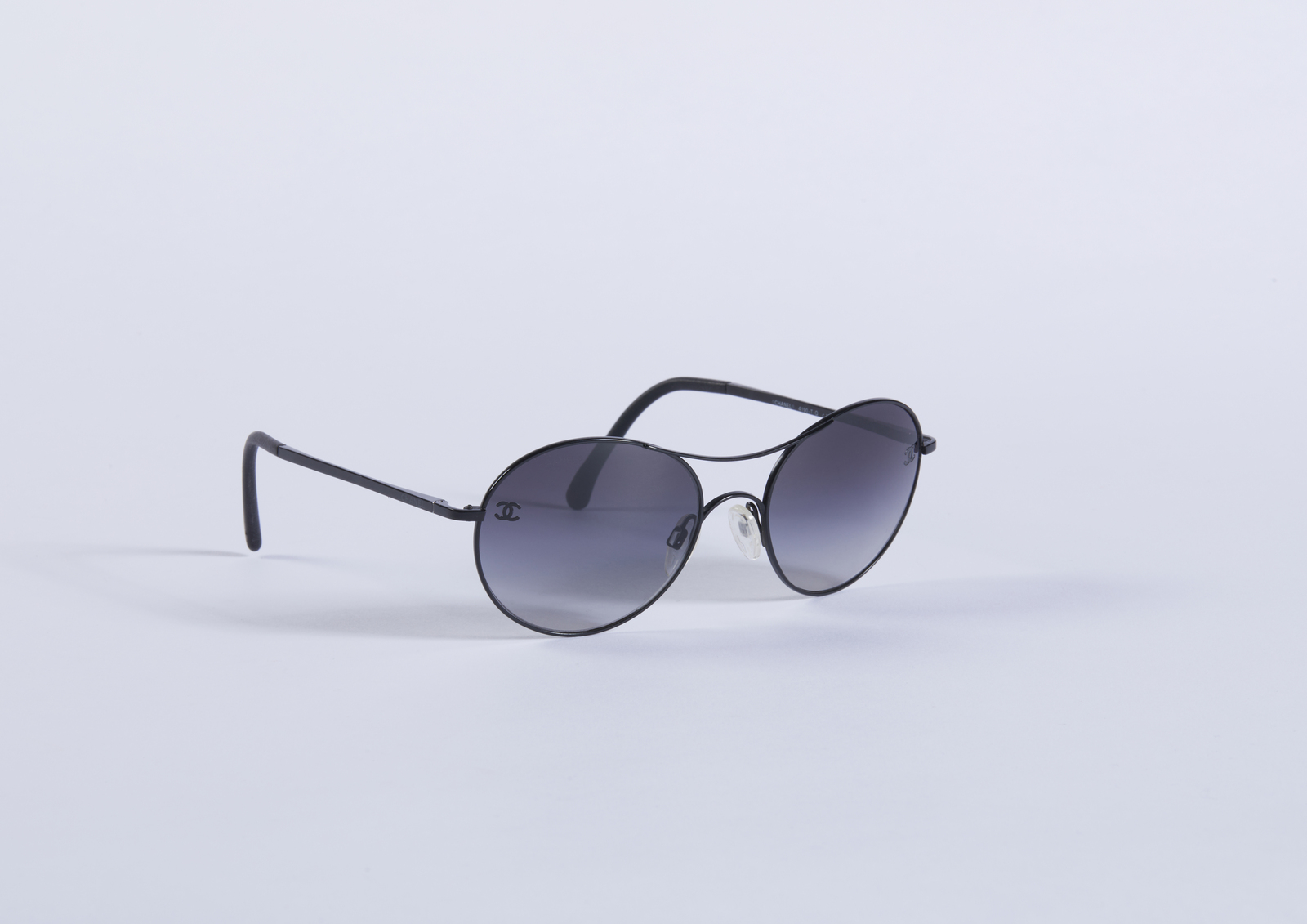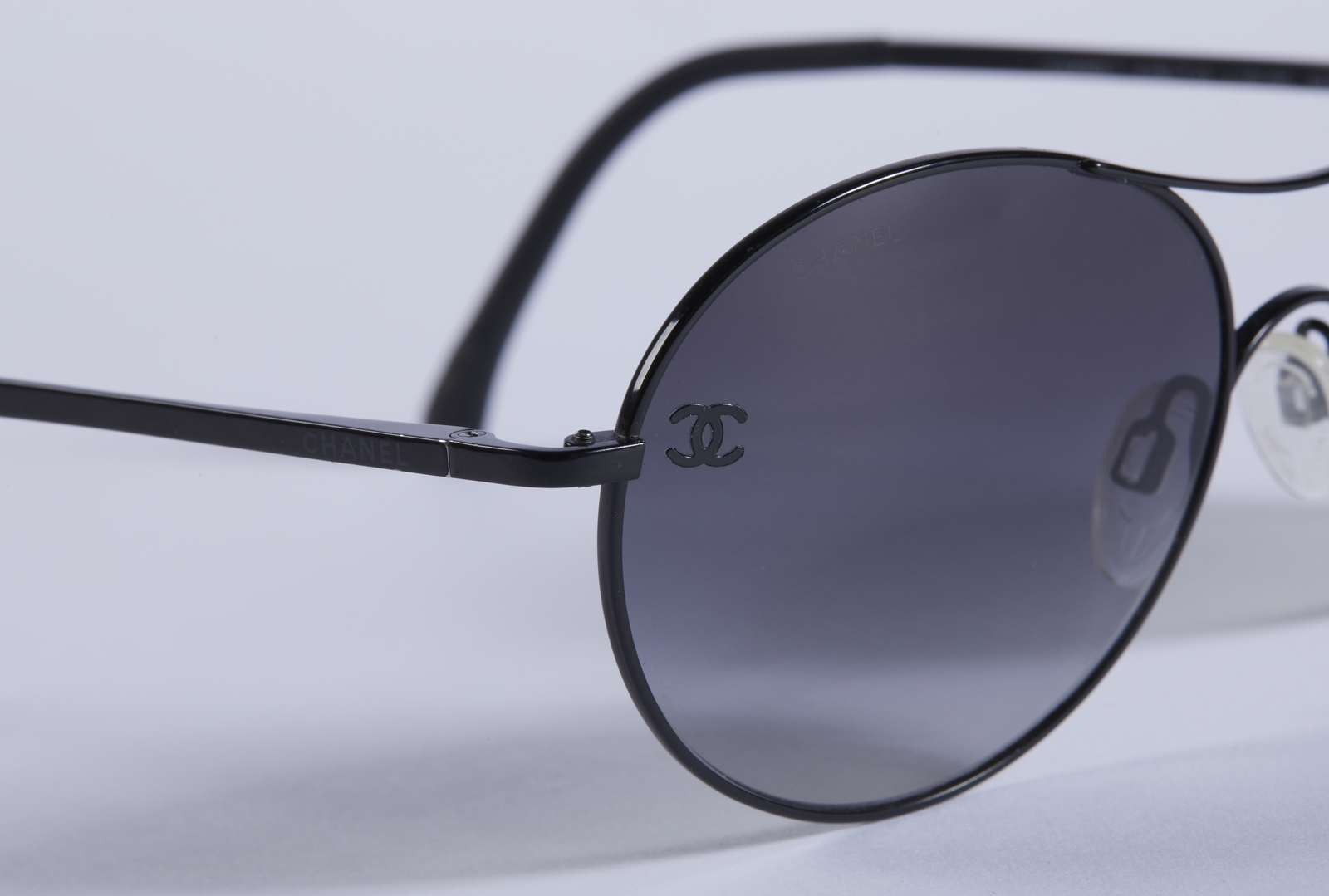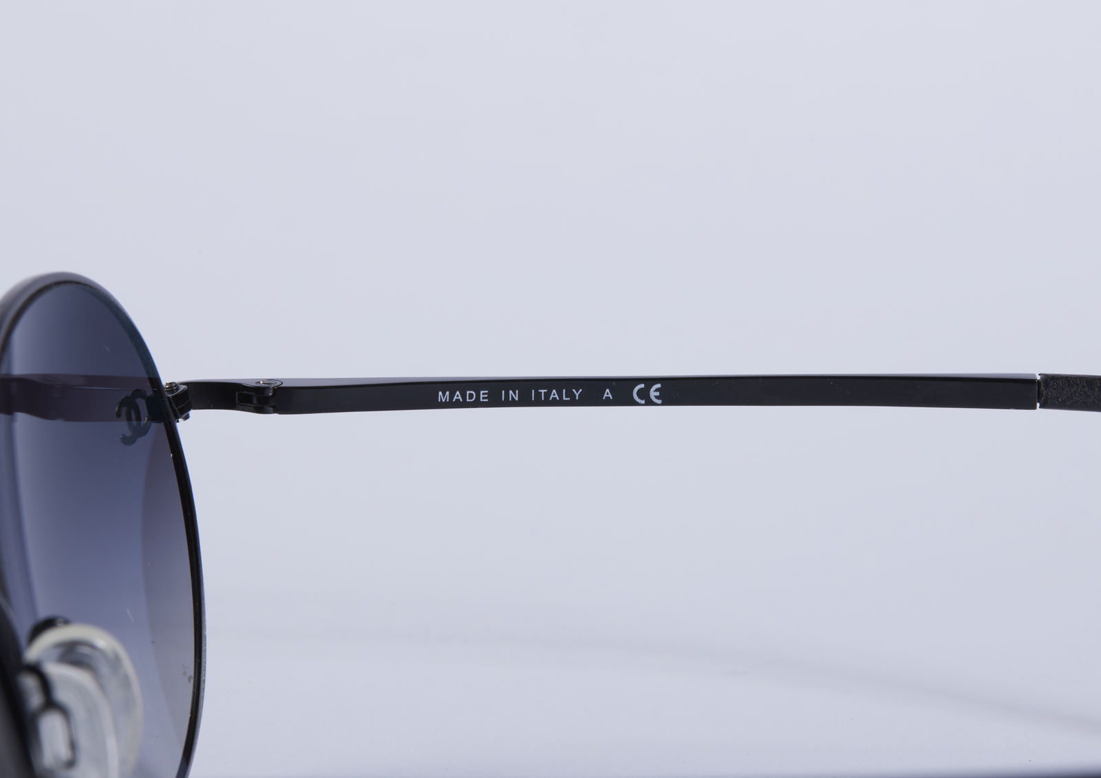 CHANEL Occhiali da sole. . . Occhiali da sole con montatura sottile in metallo e lenti nere. Logo impresso sulla lente e sull'asta.