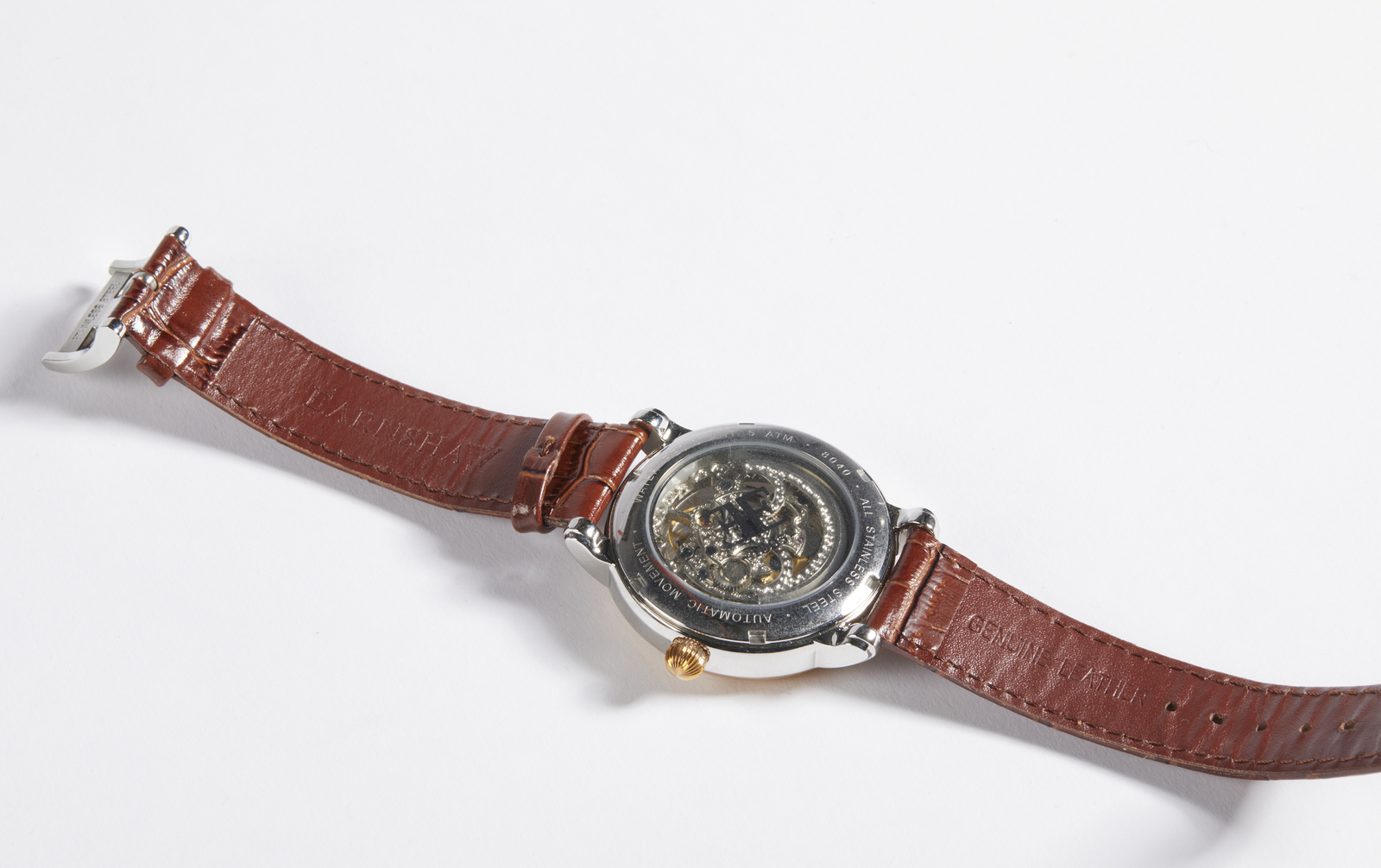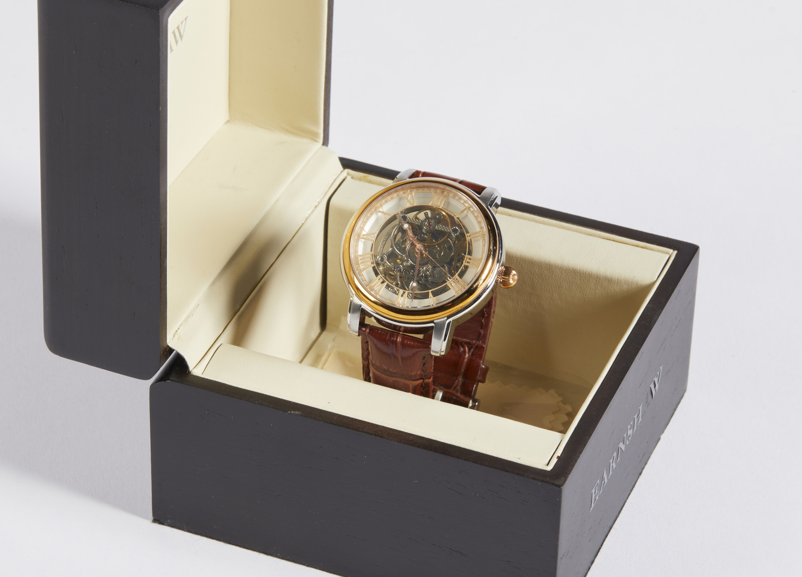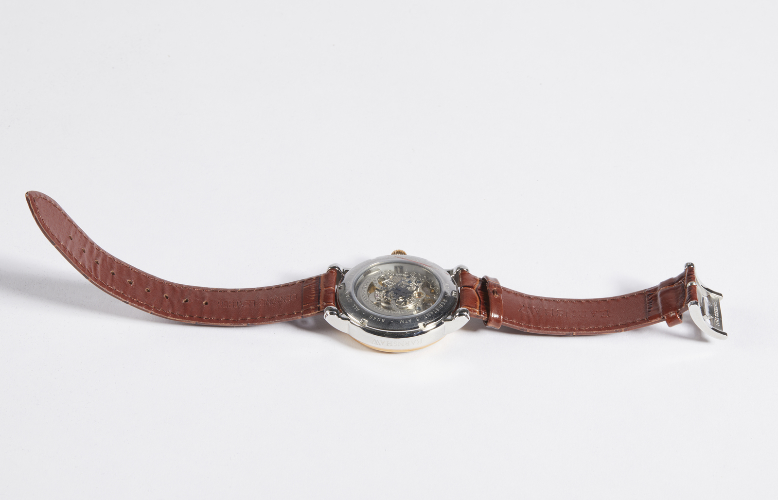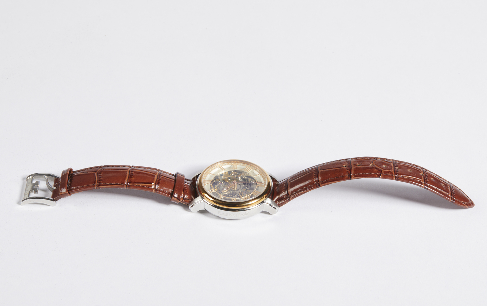 Earnshaw Earnshaw, orologio. Pelle e acciaio. Cm 4,50 x 24,50 x 0,50. Orologio con cinturino in pelle, stampa coccodrillo. Cassa in acciaio color argento con profilo color oro. Meccanismo visibile, numeri romani.