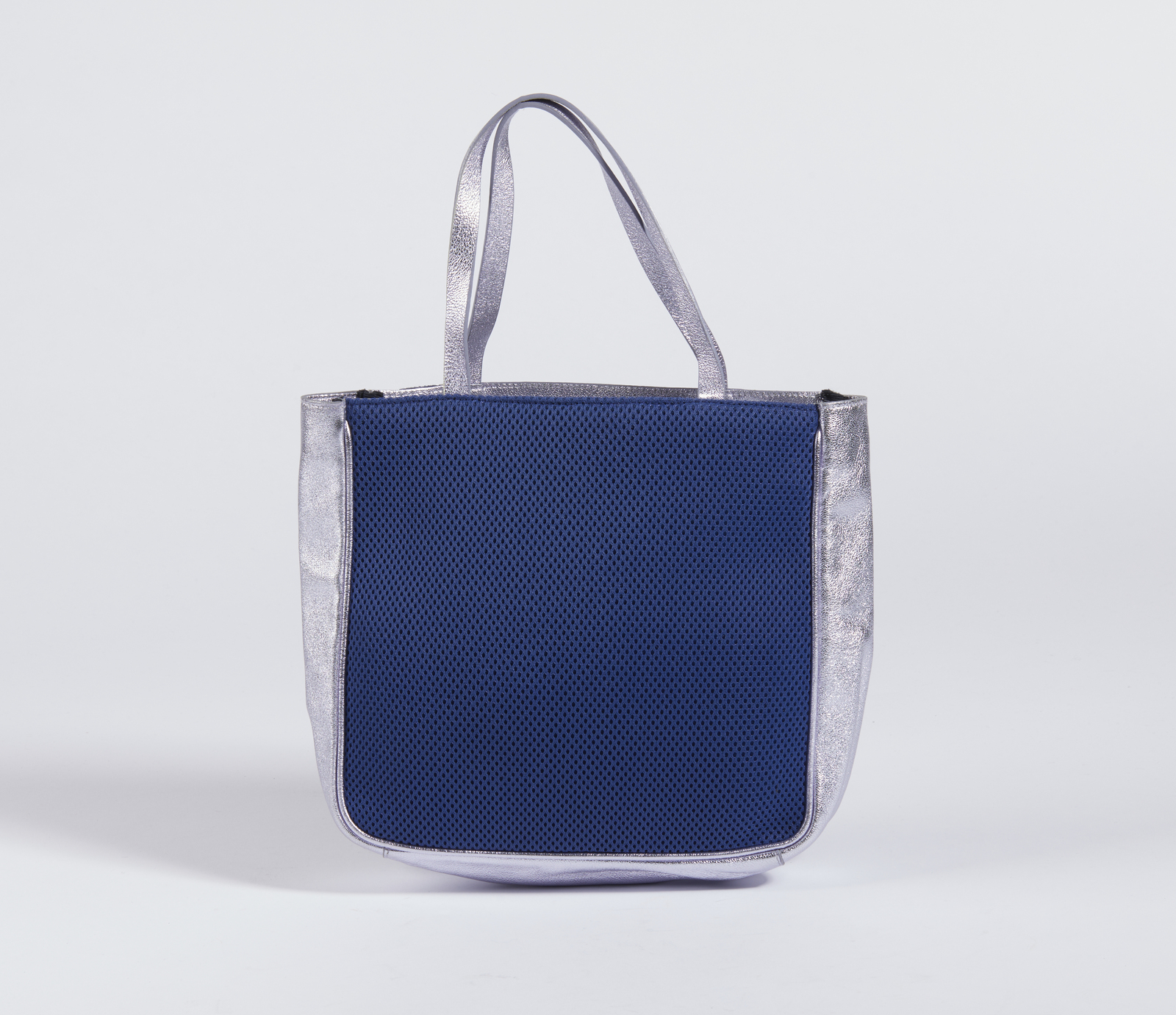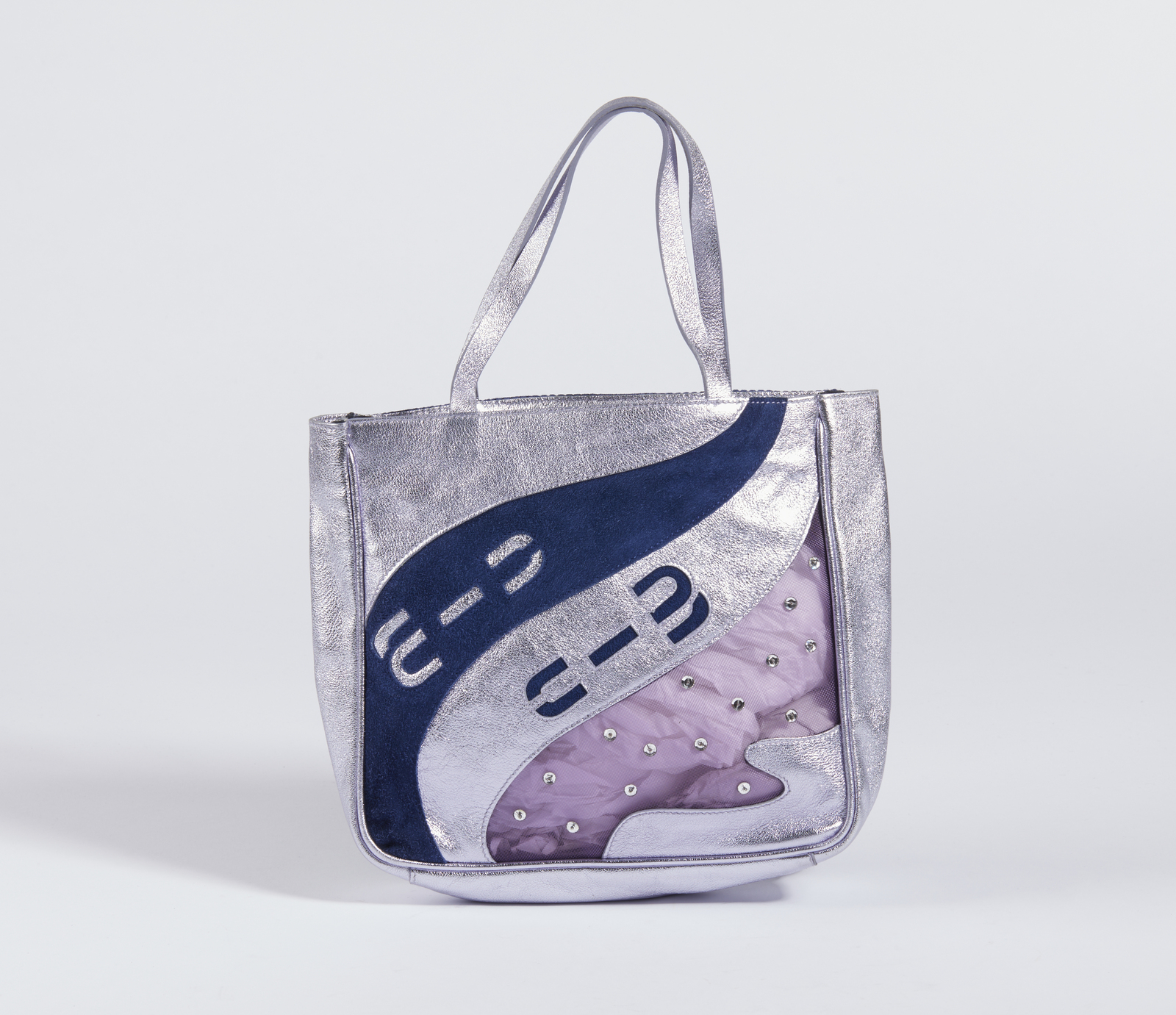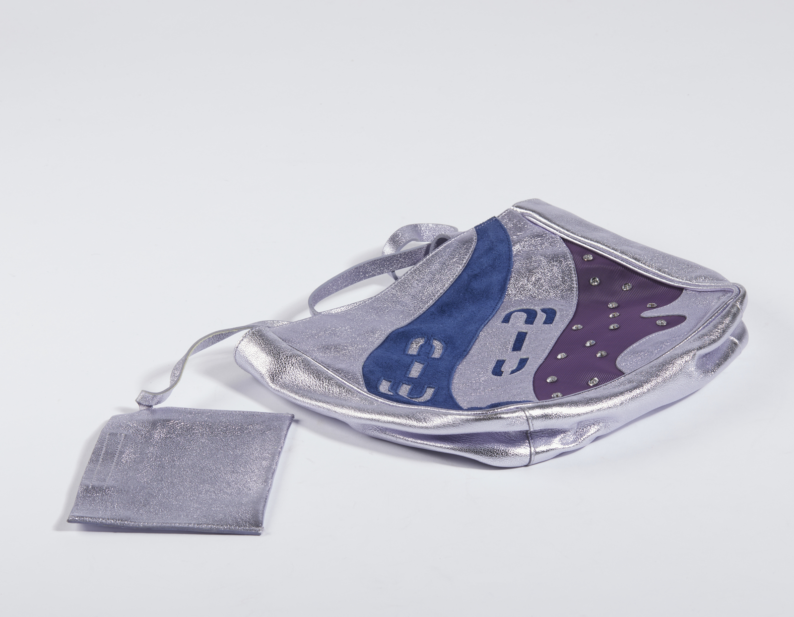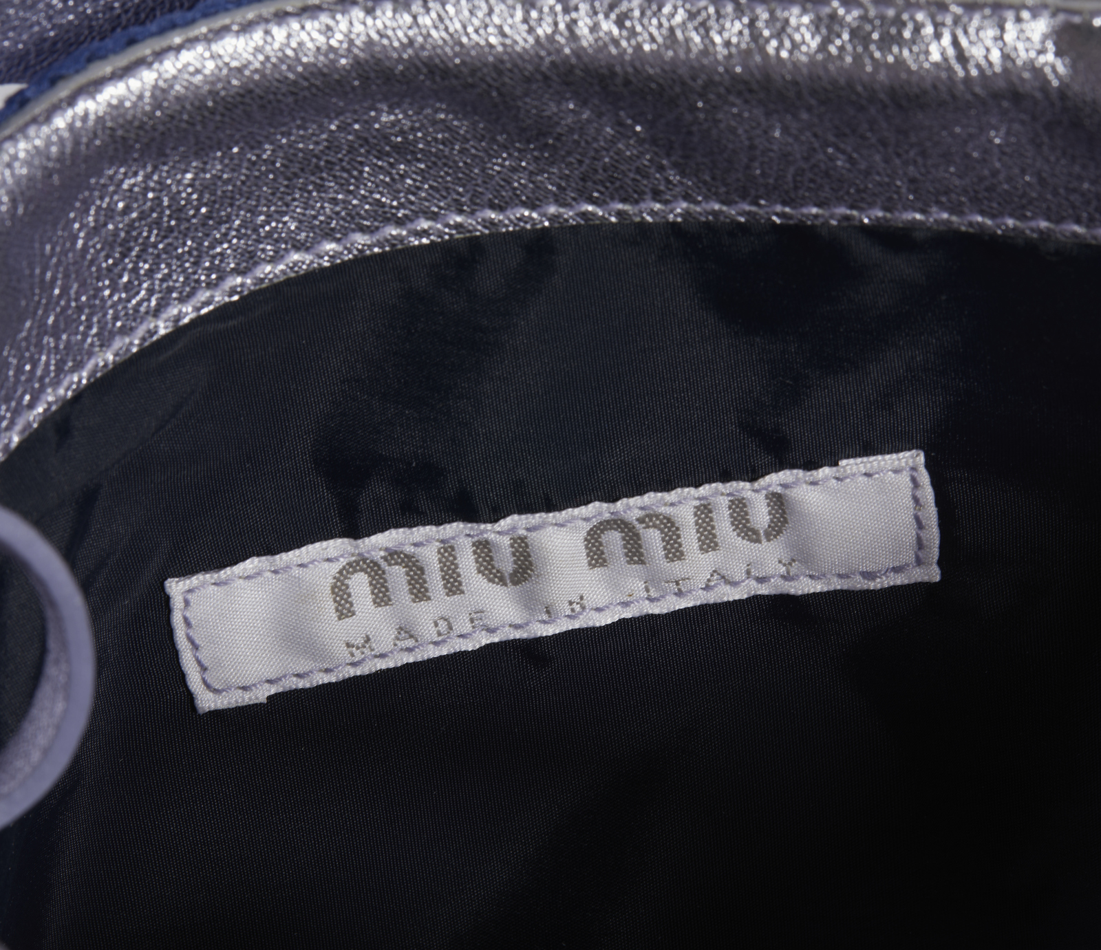 MIU MIU Bosa in pelle argentata. Pelle. Cm 22,00 x 20,00 x 6,00. Borsa in pelle viola argentata. Presenti inserti di pelle scamosciata blu e qualche payette sul fronte. Internamente è presente una piccola pochette portaoggetti.