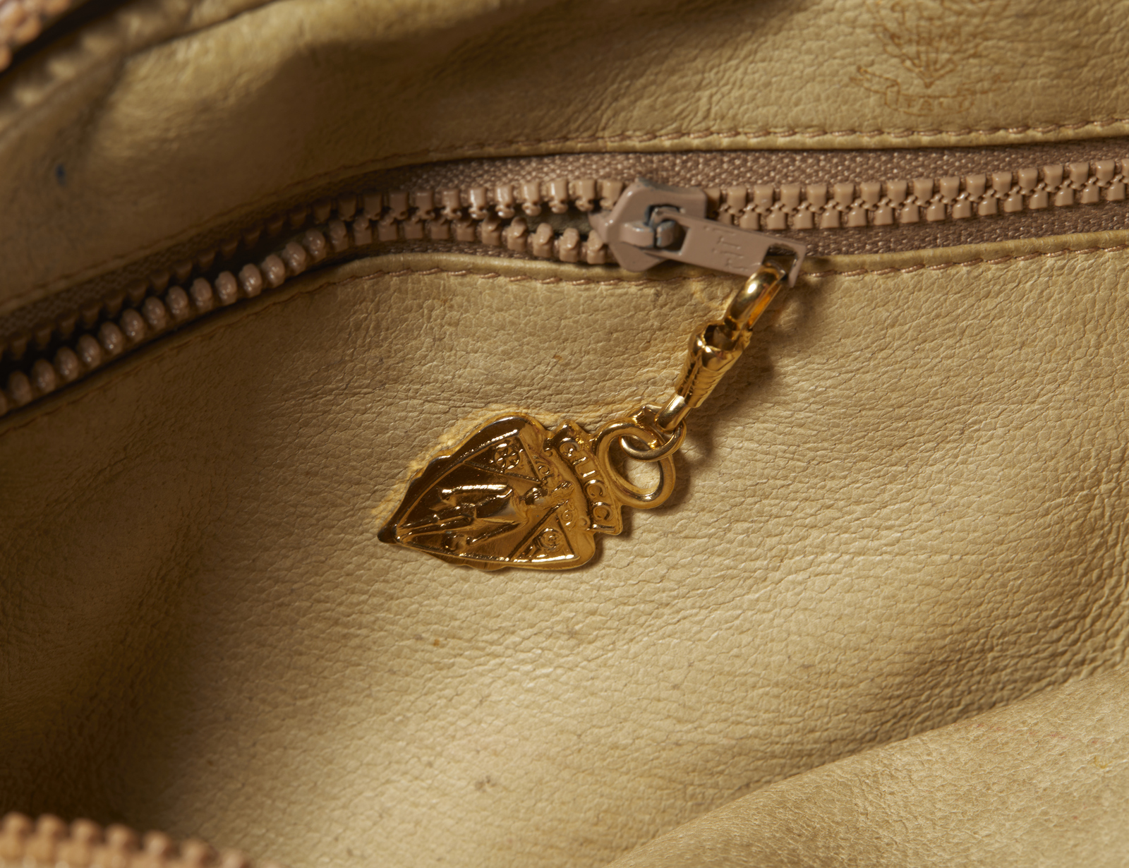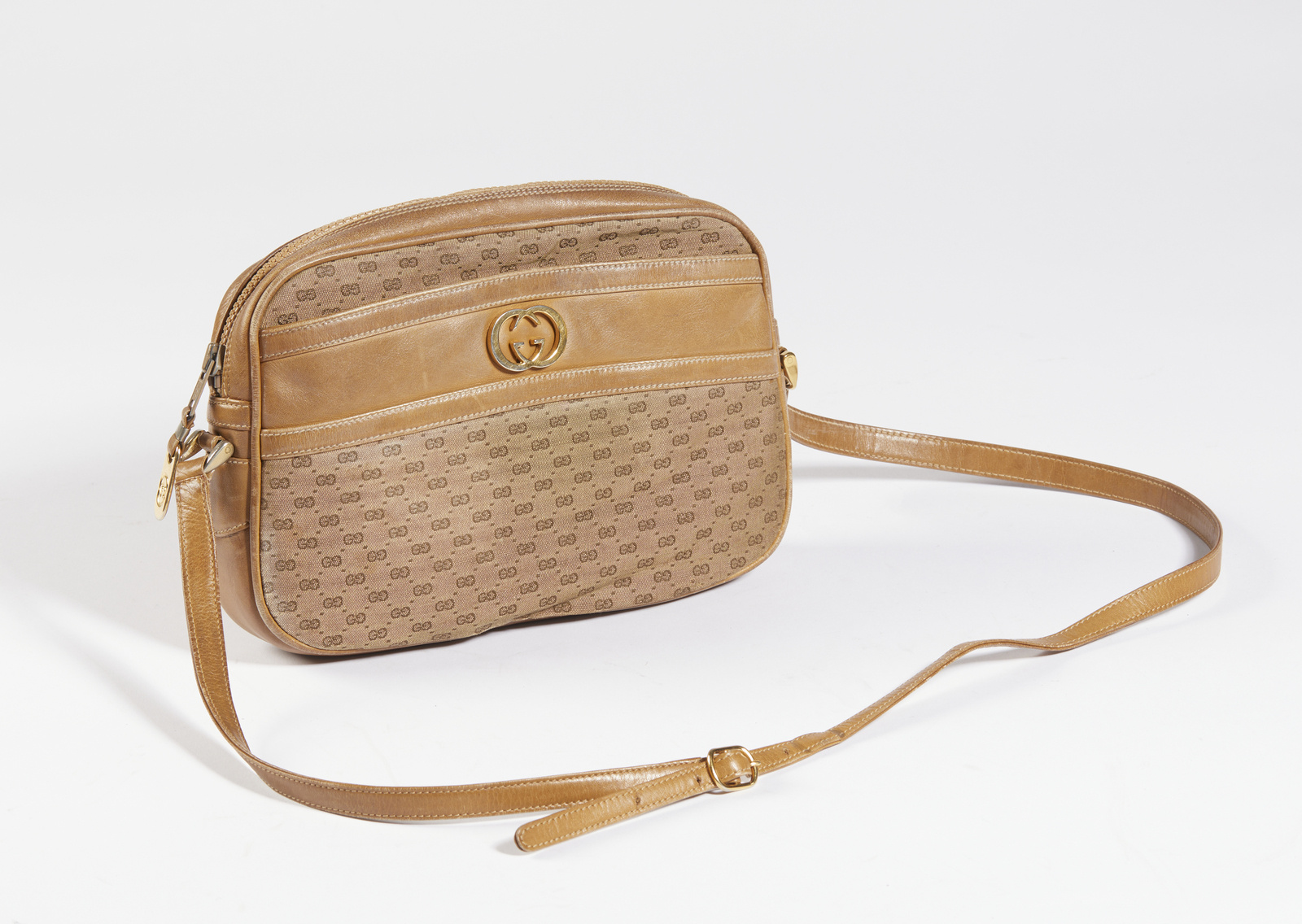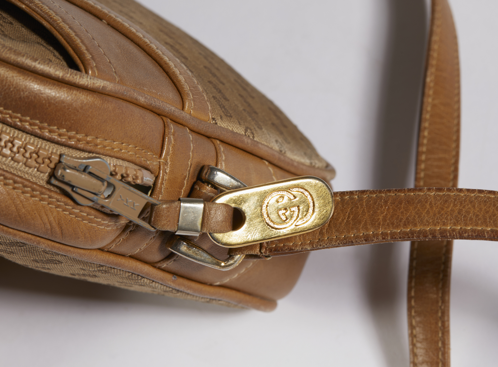 GUCCI Borsa a tracolla monogram. Canvas. . Borsa Gucci vintage, in monogram Guccissima beige e dettagli in pelle color biscotto, logo GG sul fronte in hardware dorato, interni in canvas marrone chiaro, una taschina a zip con elemento blasone, segni di usura al retro.