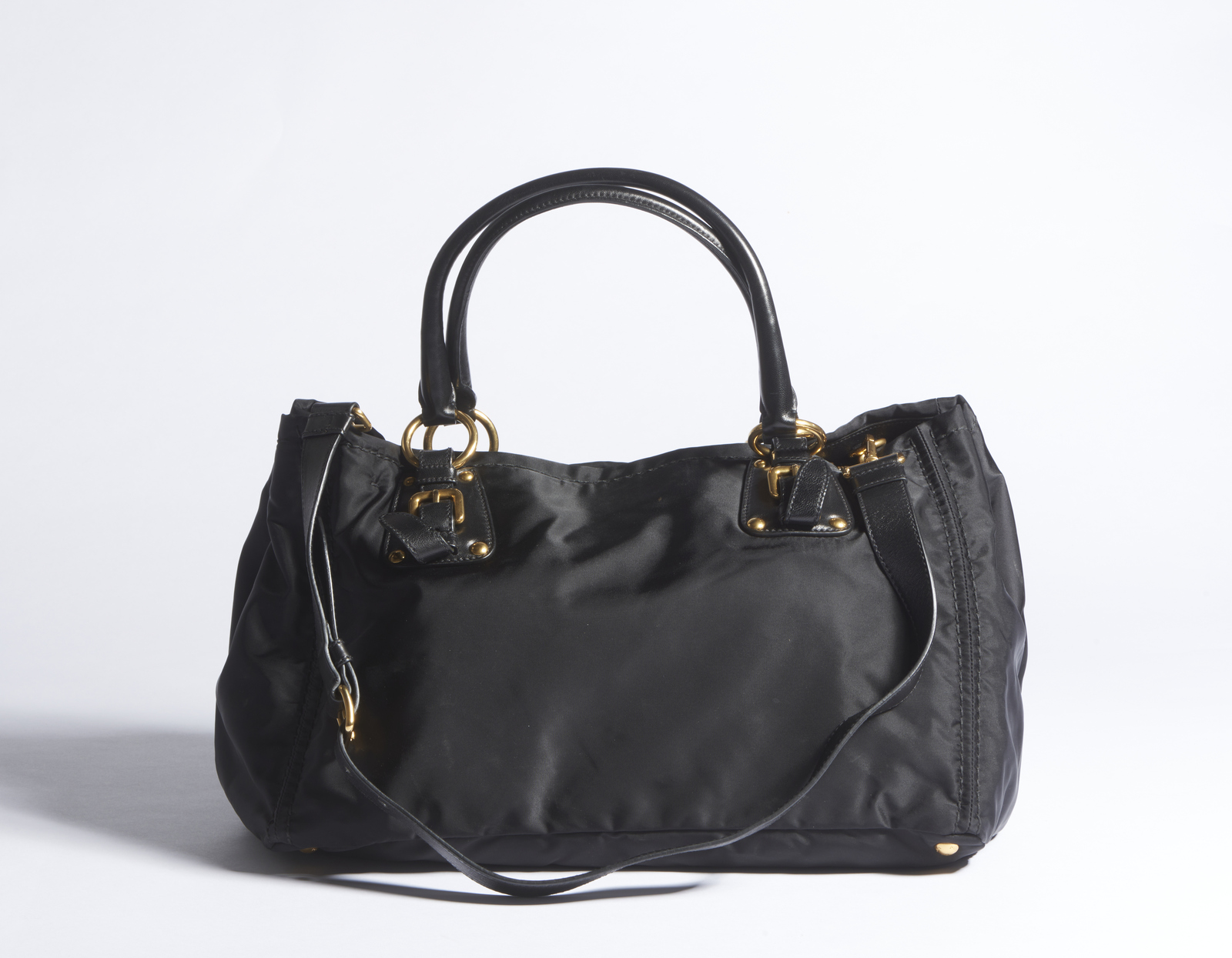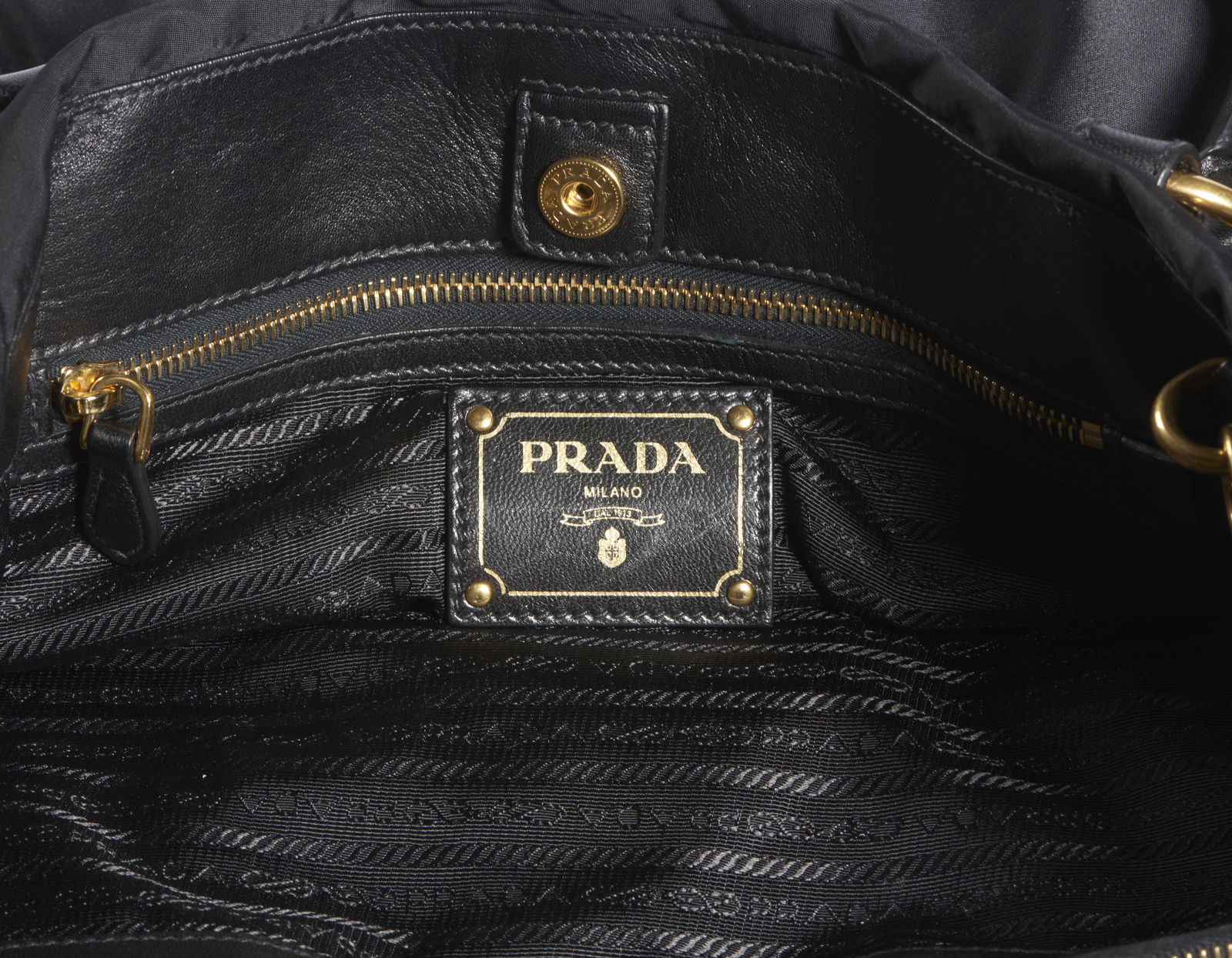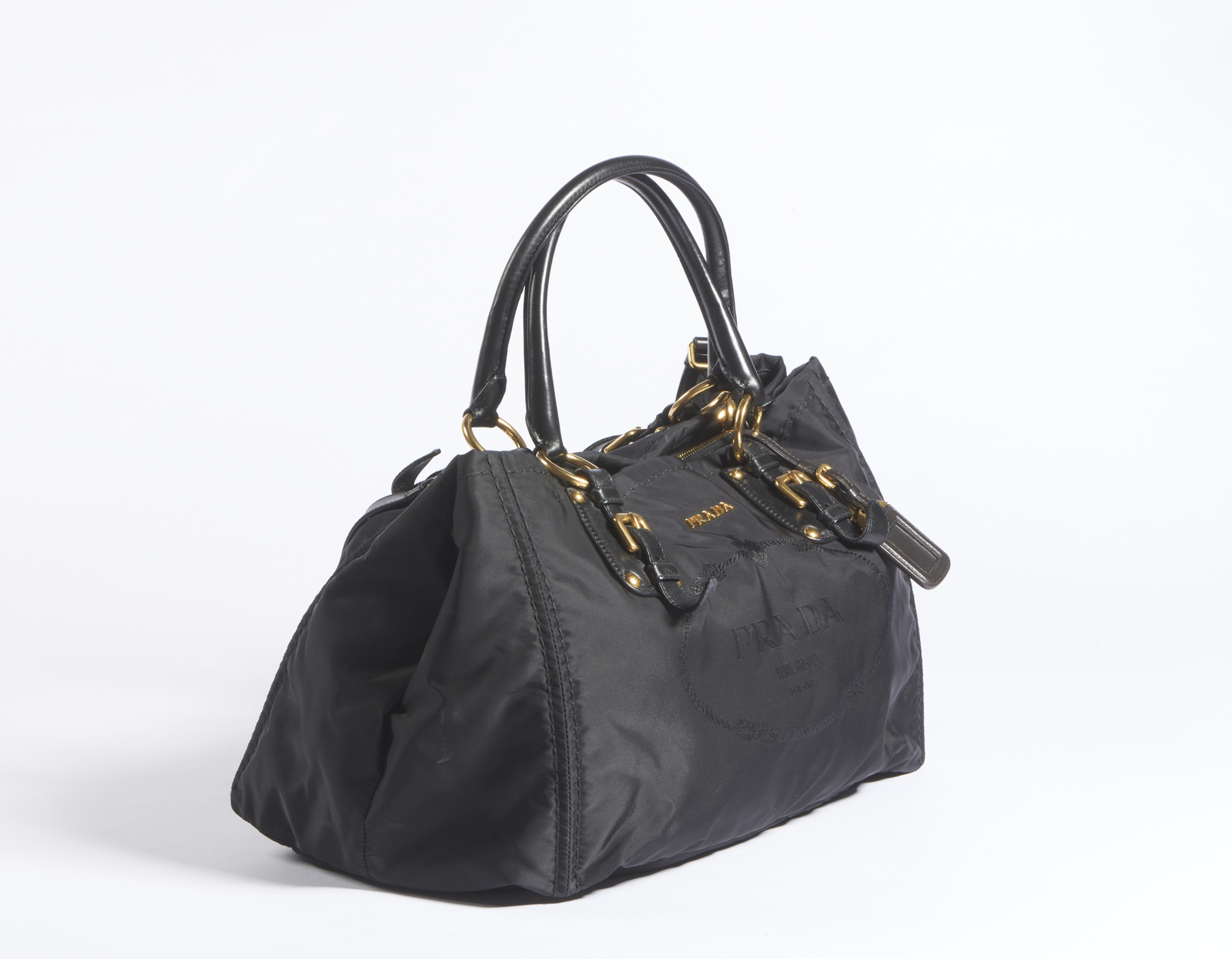 PRADA MILANO Borsa in rayon nera. . Cm 38,50 x 25,00 x 21,00. Borsa in rayon nera con hardware color oro. Inserti in pelle.