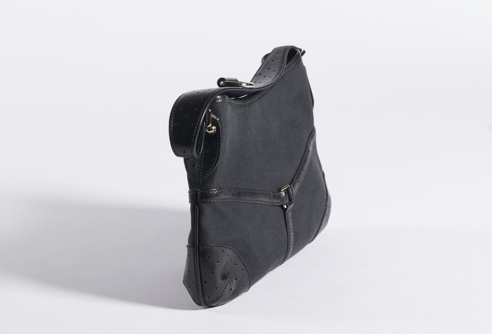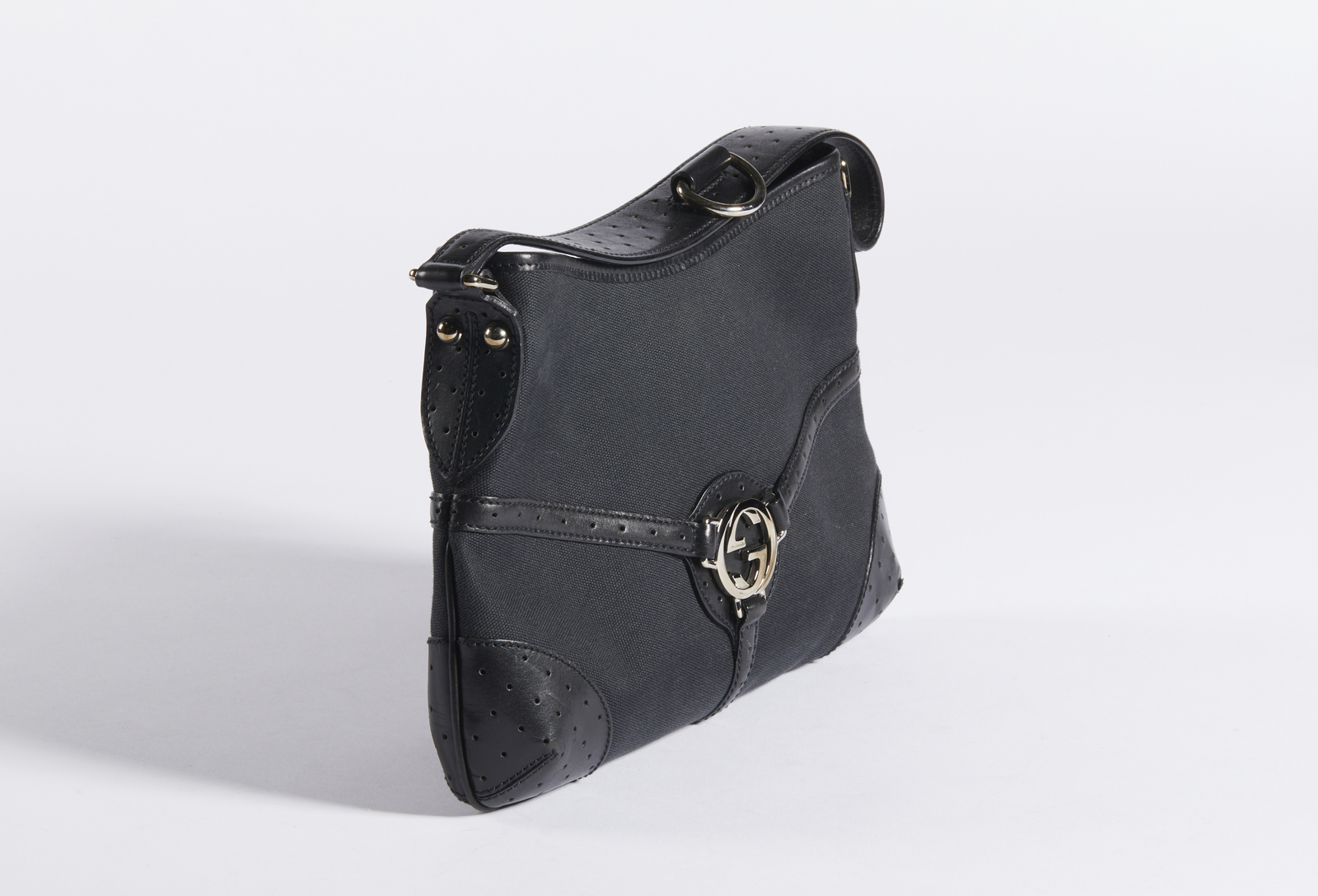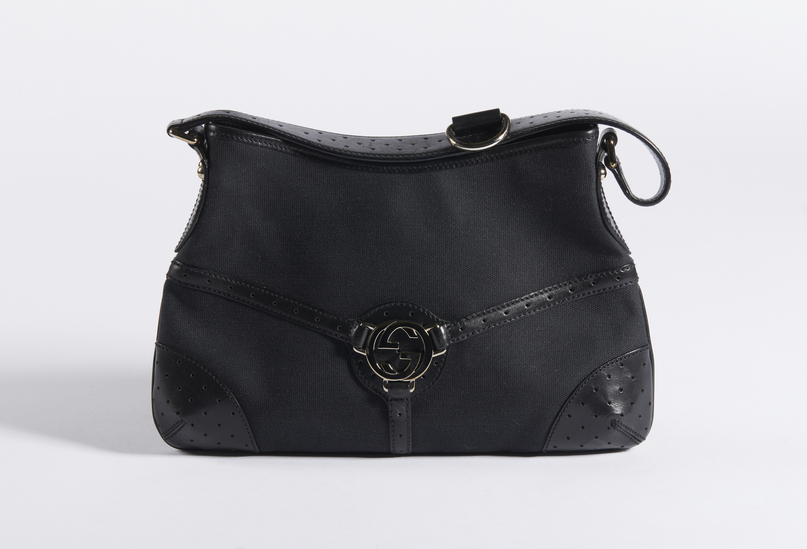 GUCCI Borsa in tessuto nero. acrilico su tessuti apprettati. Cm 29,50 x 21,00 x 4,00. Borsa in tessuto nero con profili in pelle nera e logo centrale con hardware color argento. Borsa a spalla con chiusura a calamita. Internamente tessuto con logo, tasca con zip e logo.
