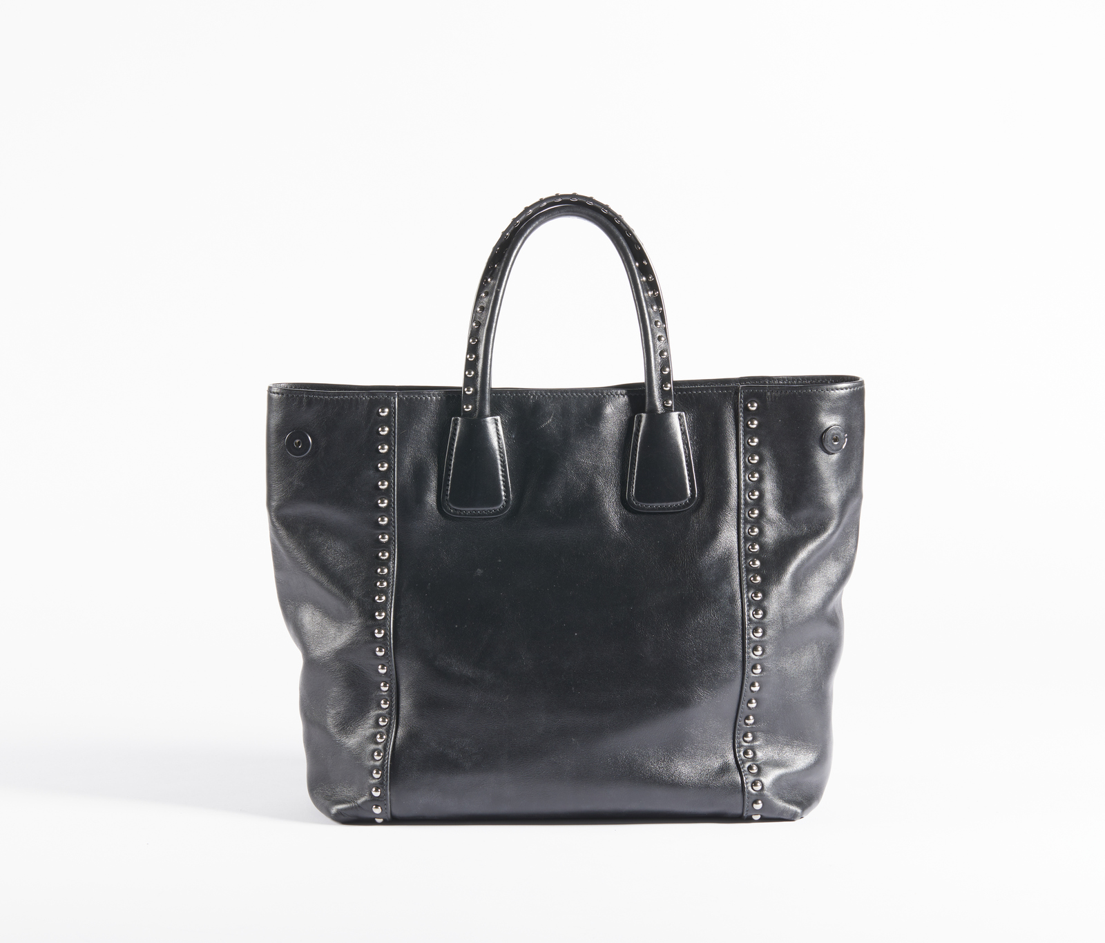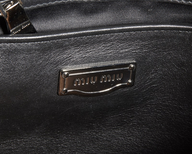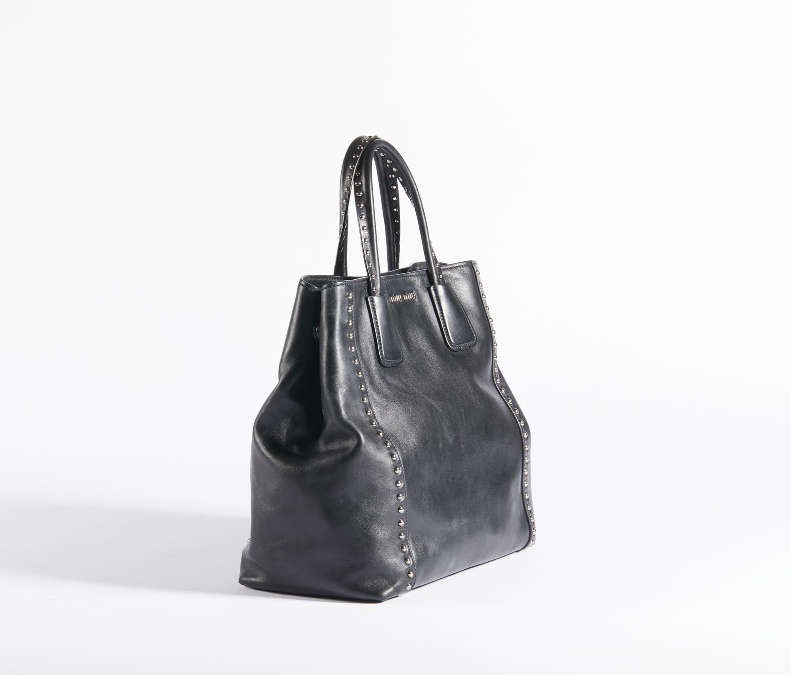 MIU MIU Borsa in pelle nera. Pelle. Cm 33,00 x 30,00 x 13,00. Borsa in pelle nera. Hardware color argento. Chiusura con calamita. Due grandi tasche interne con zip, più una piccola a scomparsa. Interno in tessuto. Manici in pelle e tracola. Borchie argentate a rilievo sui manici e ai lati della borsa.